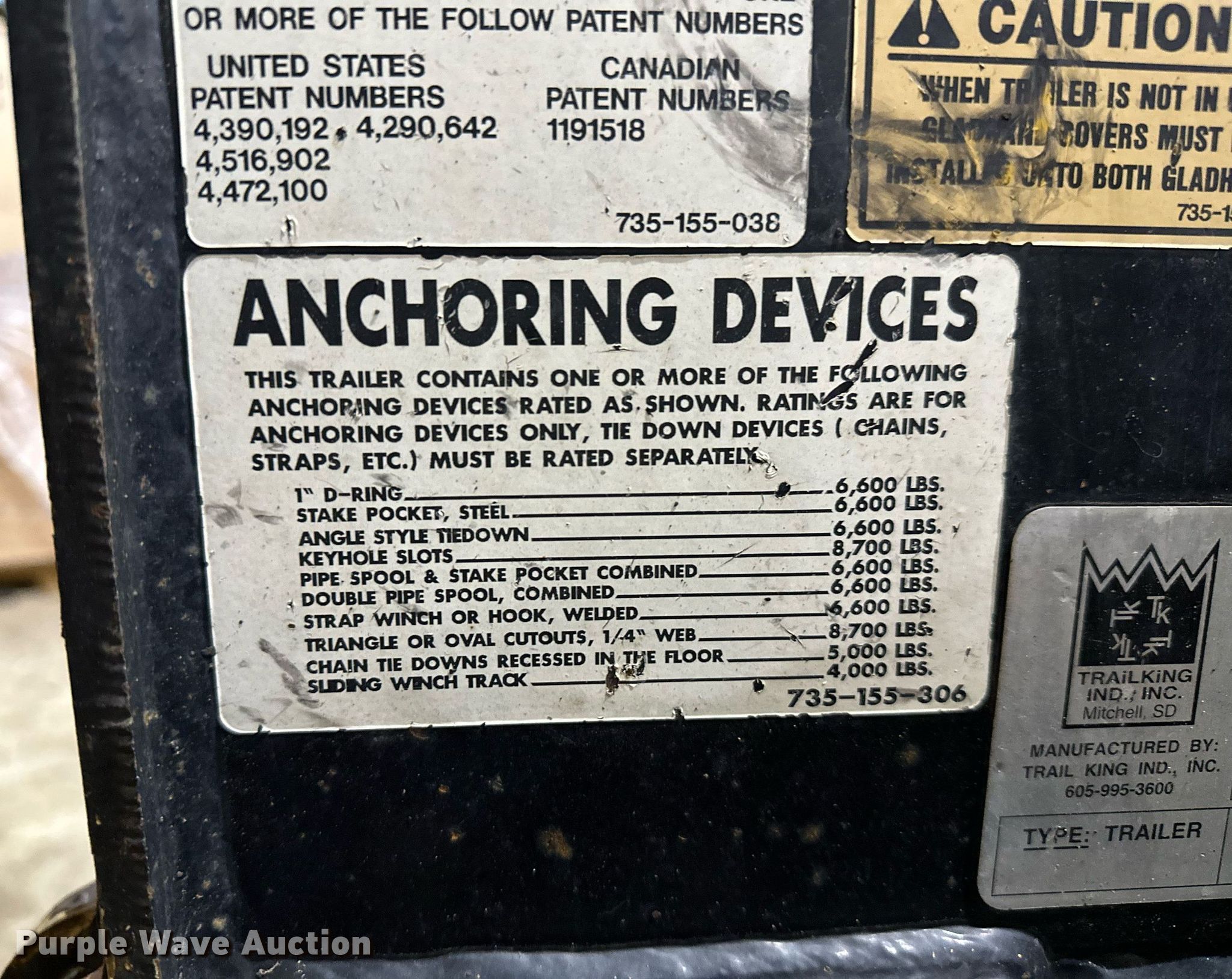 2008 Trail King TK22FA-051 pin-on axle. VIN: 1TKS005148M093094. Dimensions Overall: 48" L x 102" W. Chassis Landing gear: Dual, Suspension: Air, Brakes: Air, GVWR: 20,280 lbs. Tires Steel wheels, Size: 255/70R22.5. Oklahoma title. Title distribution may be delayed up to 30 days from verification of funds. C-Gawf Construction Inc.. 101 e Shurden industrial blvd. Henryetta, OK 74437
