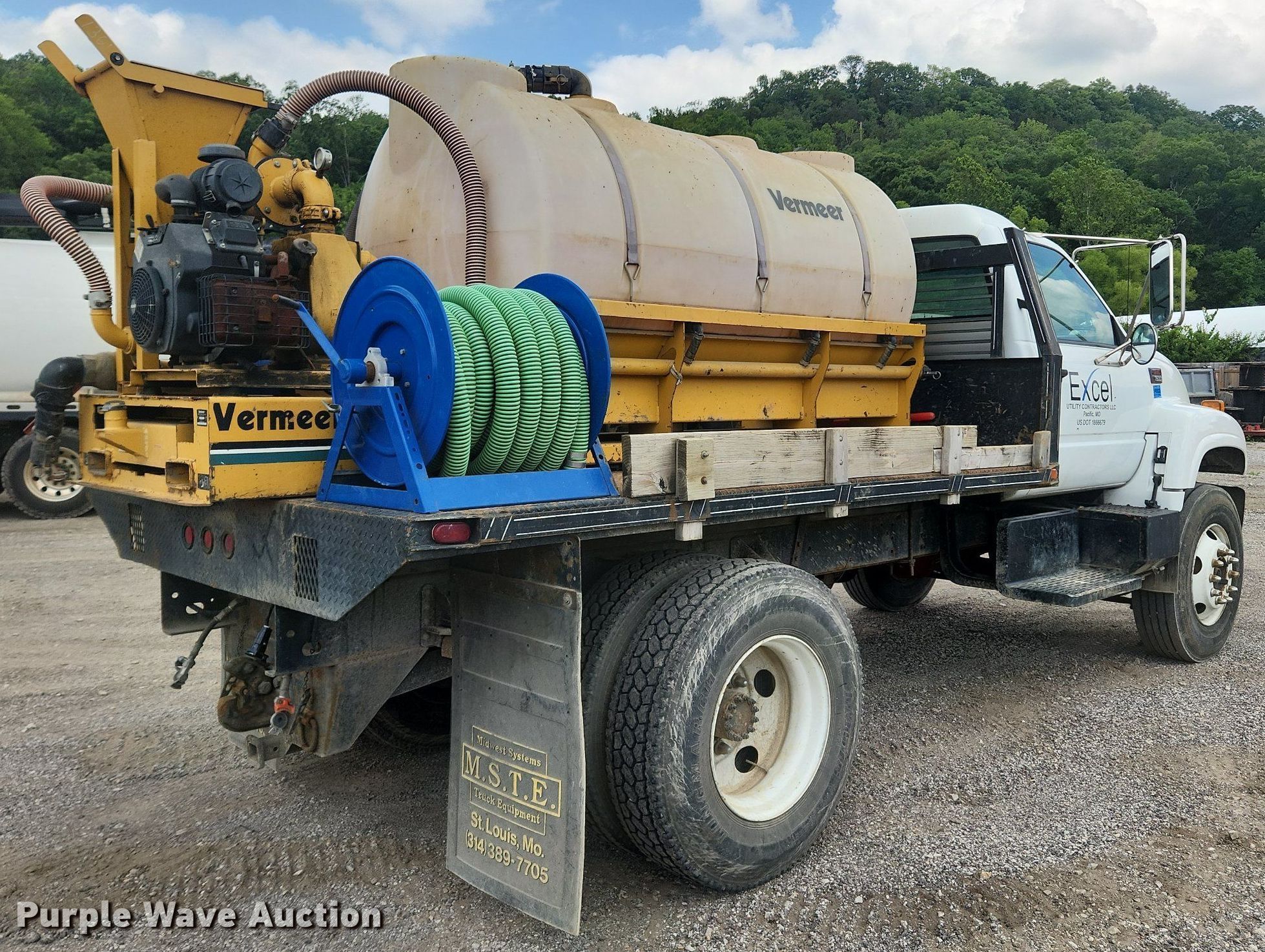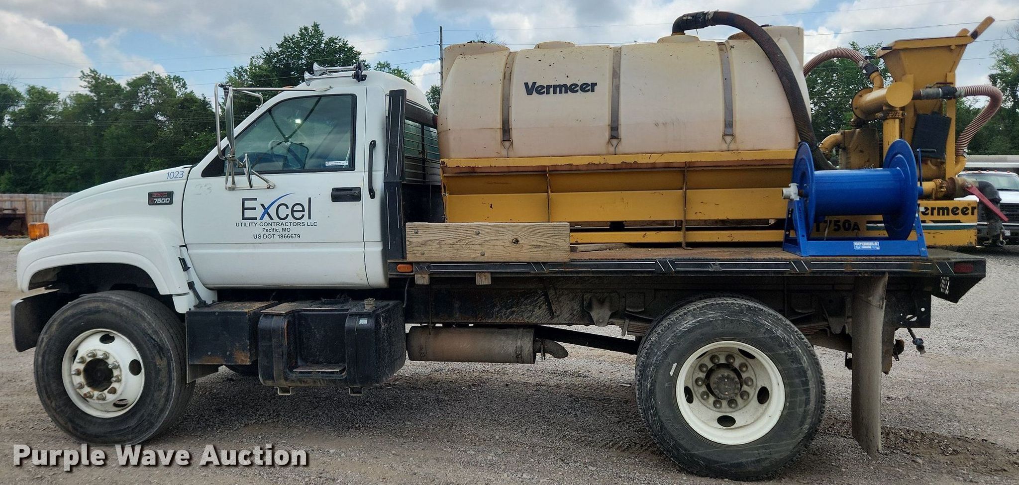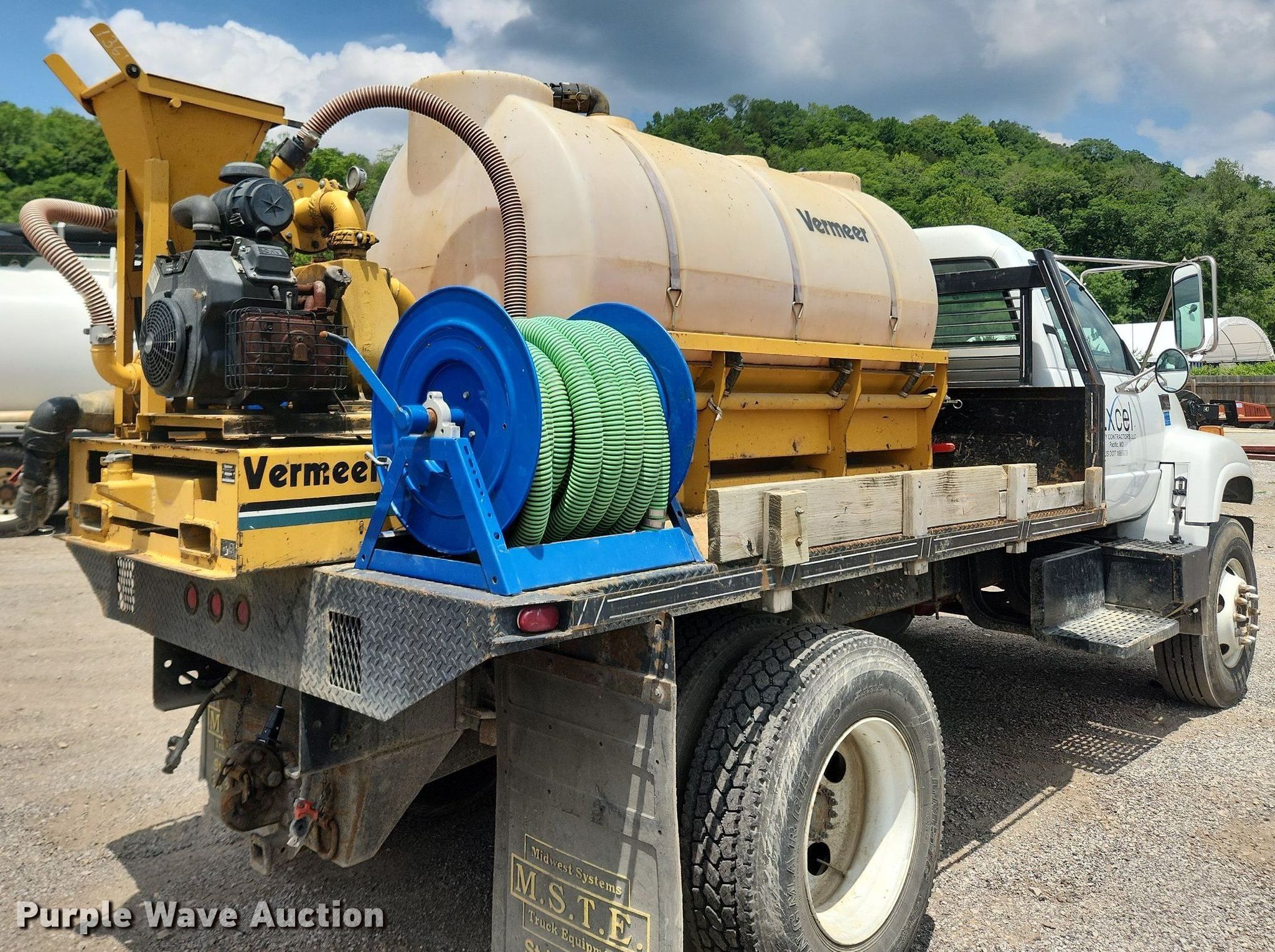 1999 GMC C7500 flatbed truck. Miles: 68,239 on odometer, VIN: 1GDM7H1C7XJ511287. Engine Caterpillar 3126, Displacement: 7.2L, Cylinders: 6, Fuel type: Diesel. Transmission Spicer, Manual, Speed: 7. Chassis Axles: Single, Suspension: Spring, Brakes: Air, GVWR: 30,000 lbs, Wheelbase: 158". Interior AC, Heat, Brake controller. Features Flatbed Jensen, 11' L x 92" W, 2005 Vermeer ST750A mud mixer Tank Capacity: 750 gallons, Engine Kohler, Displacement: 725 cc, Cylinders: 2, Serial: 1VRT1106551001361.. Tires Size: 11R22.5. Notes Dead battery, Mud mixer engine turns over, but will not start. Missouri title. Title distribution may be delayed up to 14 days from verification of funds. Excel Utility Contractors, LLC. Pacific, MO 63069