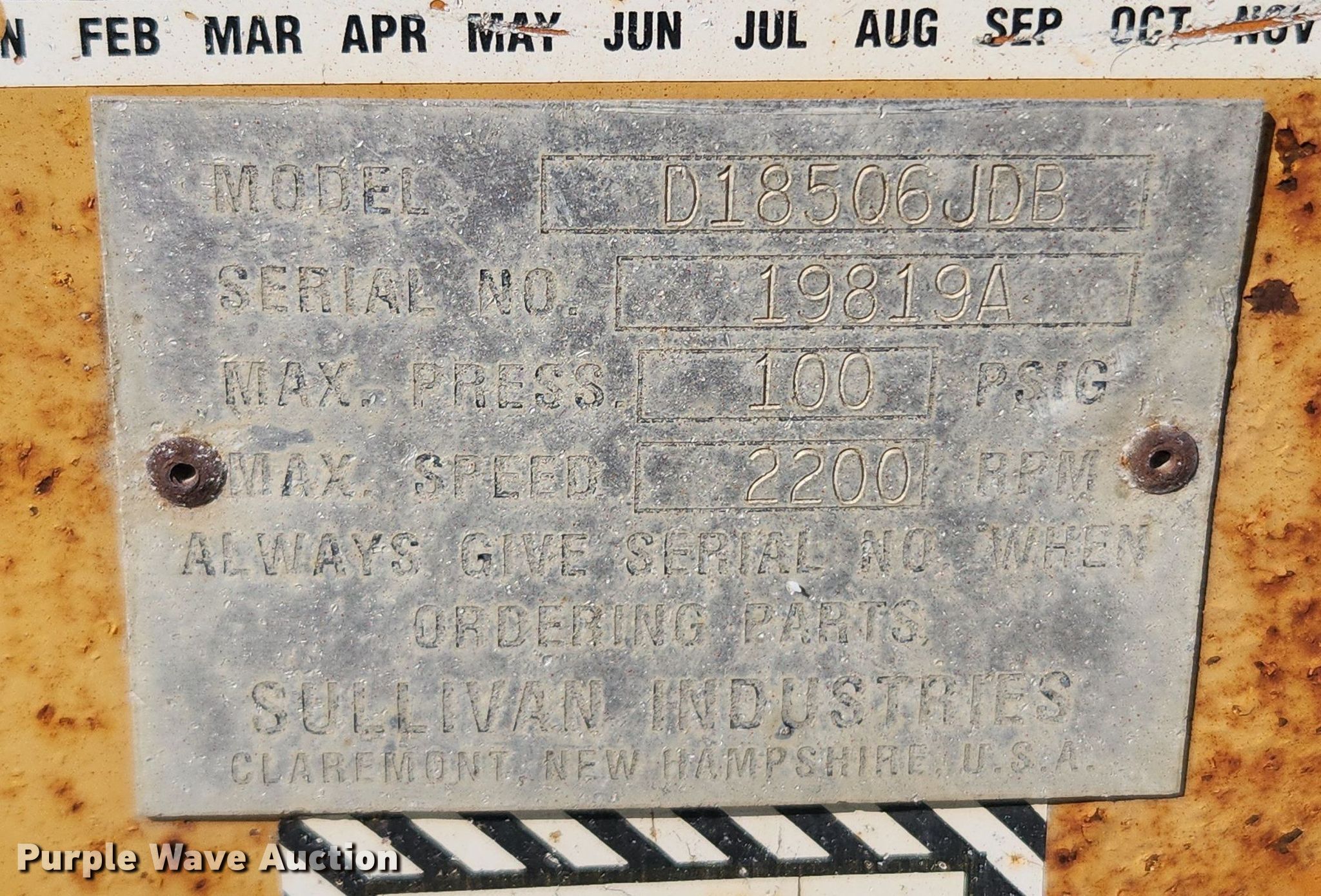Sullivan Palatek D18506JDB air compressor. Hours: 3,083 on meter, Serial: 19819A. Engine John Deere, Displacement: 4.5L, Cylinders: 4, Fuel type: Diesel. Features CFM: 185, PSI: 100. Trailer 11' L x 55" W, Suspension: Spring, Axles: Single, Tire size: 205/75R14. This is worksite support equipment and will not come with a title. Transfer of ownership documentation will be a bill of sale which will be assigned and distributed by the seller. Northpoint Enterprises, LLC. 100 Manda Ct. Troy, MO 63379