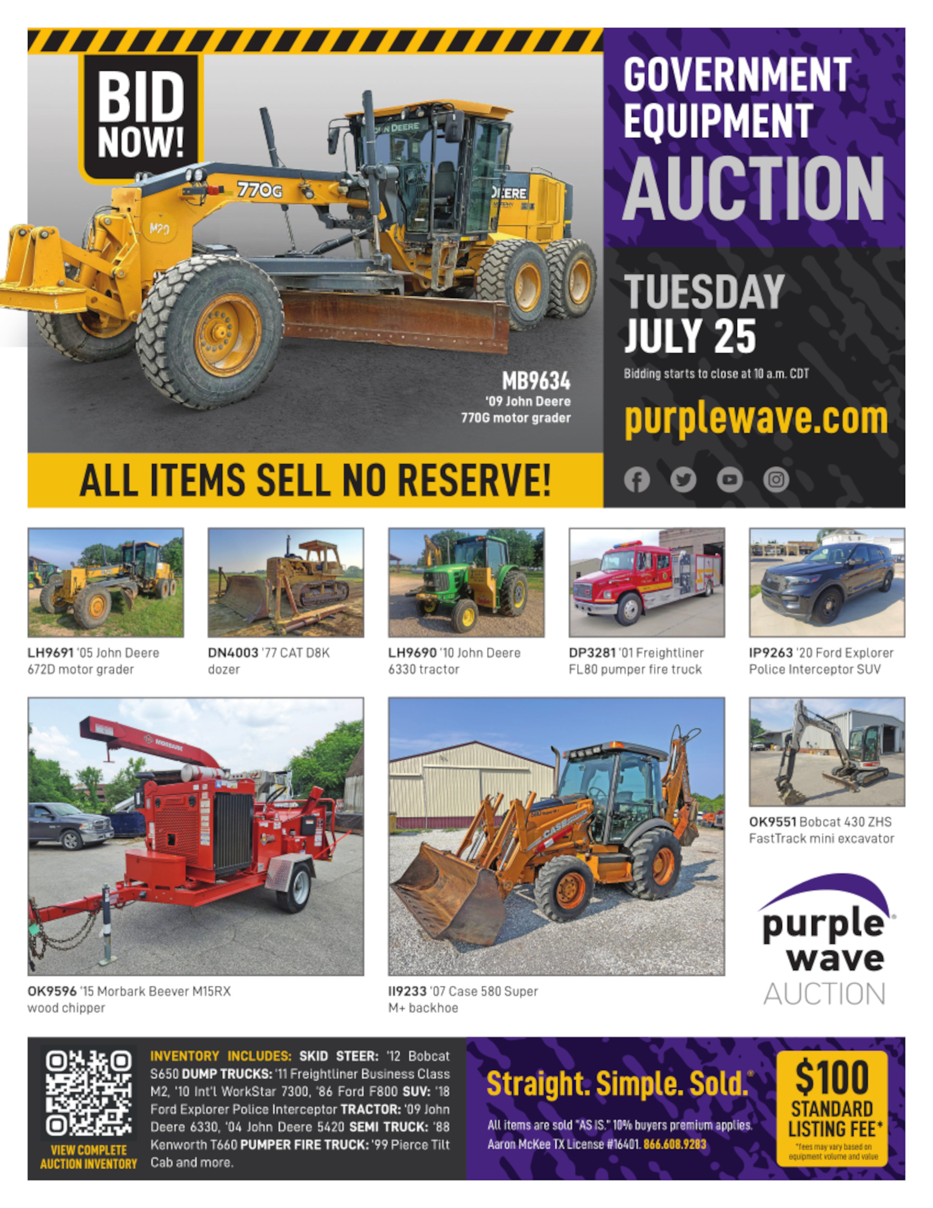This auction is conducted by Purple Wave, Inc., whose home office is 825 Levee Drive, Manhattan, Kansas. Aaron McKee, Texas auctioneer license # 16401, operates Purple Wave, Inc. Complaints against us may be directed to the Texas Department of Licensing and Regulation, P.O. Box 12157, Austin, Texas 78711, (512) 463-6599. For additional required information, see the attached document.