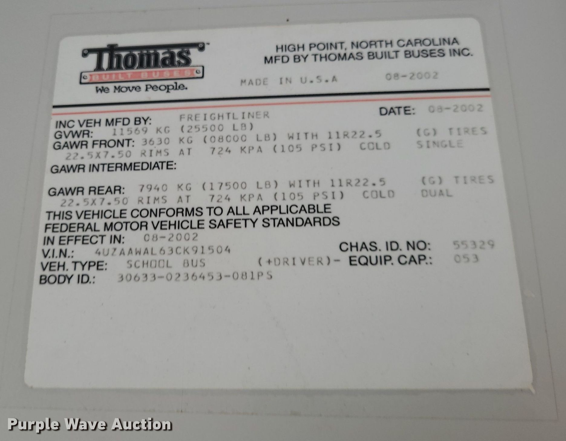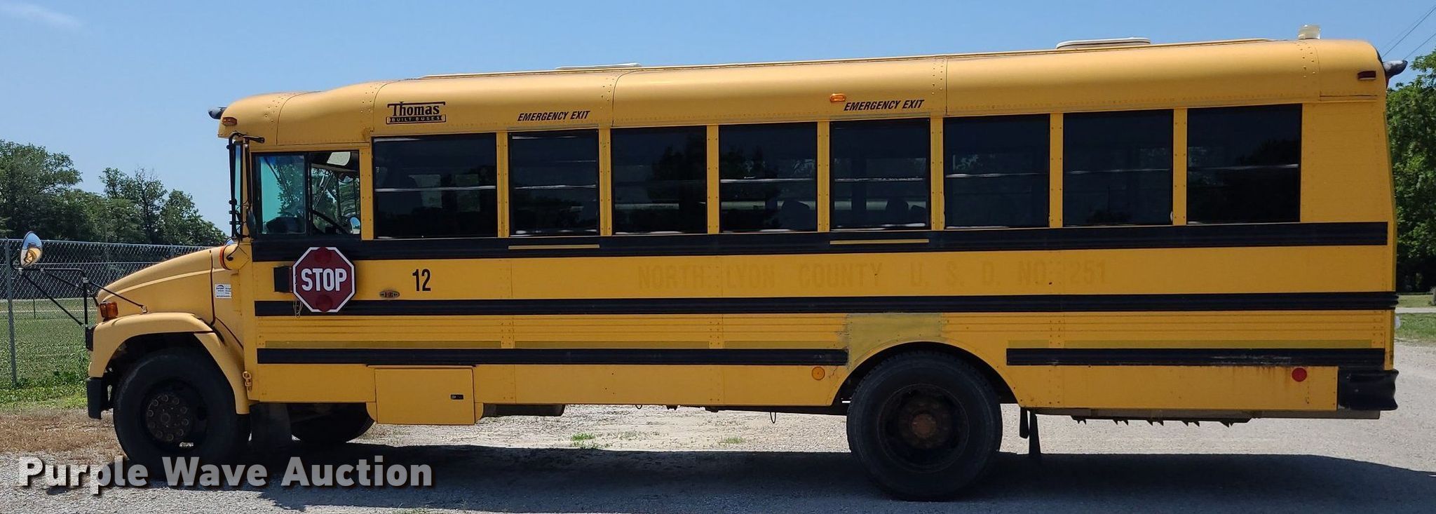 Purple Wave is selling a used Bus in Kansas. This item is a 2003 Thomas school bus with the following: Miles: 156,120 on odometer, Hours: 5,289 on meter, VIN: 4UZAAWAL63CK91504, Unit #: 12