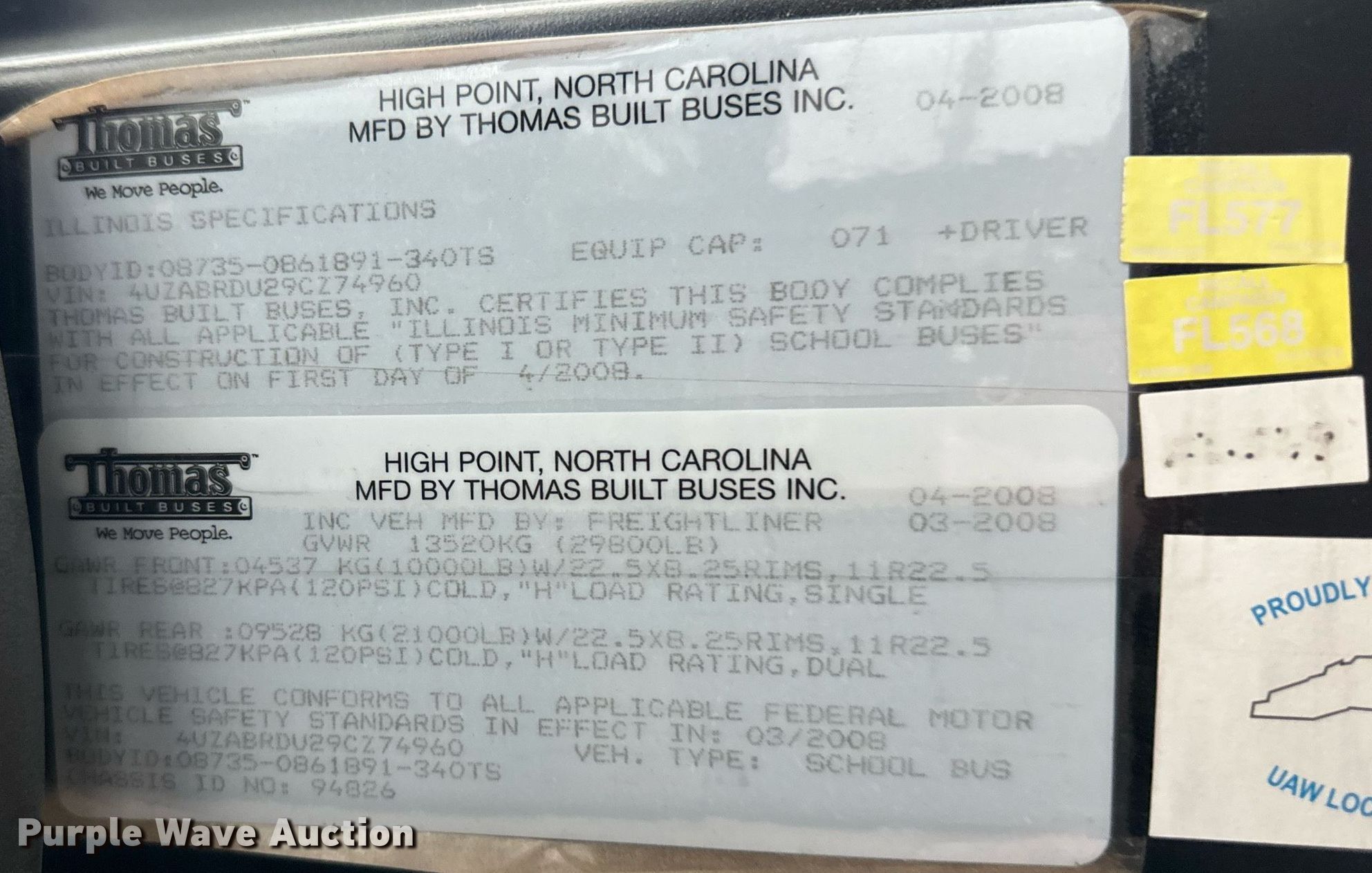 2009 Thomas school bus. Miles: 122,083 on odometer, Hours: 6,421 on meter, VIN: 4UZABRDU29CZ74960. Engine Cummins ISB, Displacement: 6.7L, Cylinders: 6, Fuel type: Diesel. Transmission Automatic. Chassis Axles: Single, Suspension: Spring, Brakes: Hydraulic, GVWR: 29,800 lbs. Interior Heat, Cruise control, Electric passenger sliding door, Passengers: 71. Tires Size: 11R22.5. Notes Fuel tank leak. Kansas title. Title distribution may be delayed up to 14 days from verification of funds. Easton USD 449. 32502 Easton Rd. Easton, KS 66020