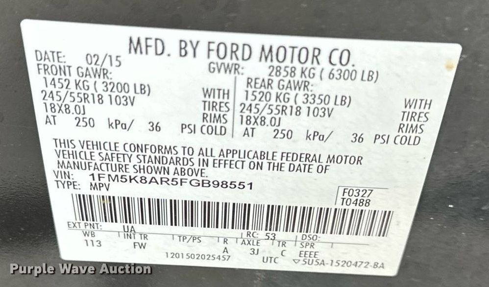 2015 Ford Explorer Police Interceptor SUV. Miles: 101,961 on odometer, VIN: 1FM5K8AR5FGB98551. Engine Displacement: 3.7L V6 DOHC, Cylinders: 6, Fuel type: Gas. Transmission Automatic, All wheel drive. Interior AC, Heat, Power windows, Power locks, Cruise control. Tires Size: 225/60R18. Notes Dash warning indicator: TPMS. Missouri title. Title distribution may be delayed up to 14 days from verification of funds. City of Gladstone, MO. 4000 NE 76th St. Gladstone, MO 64116