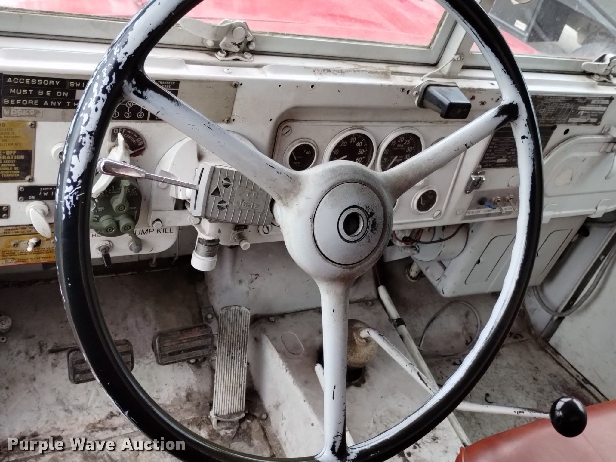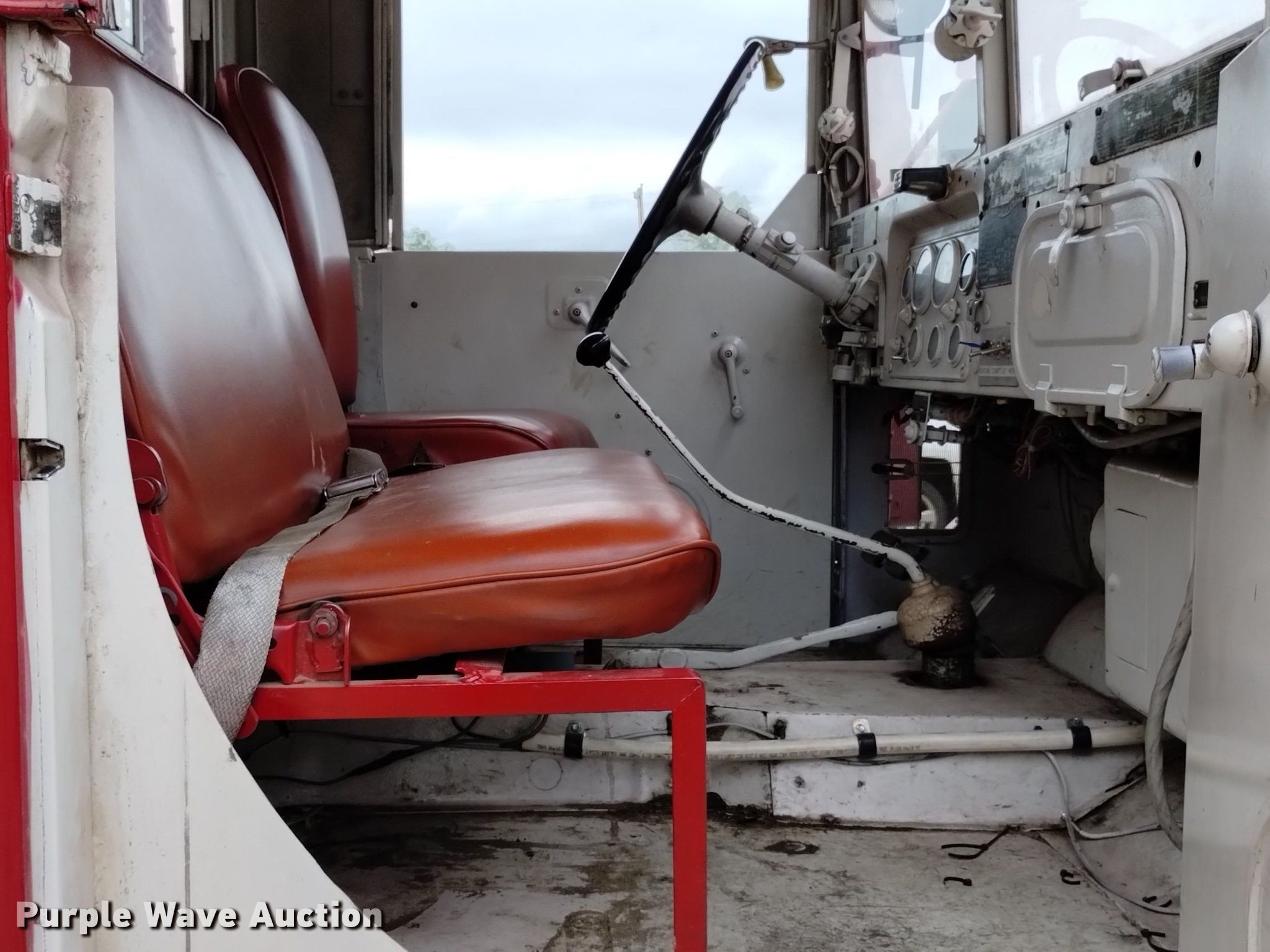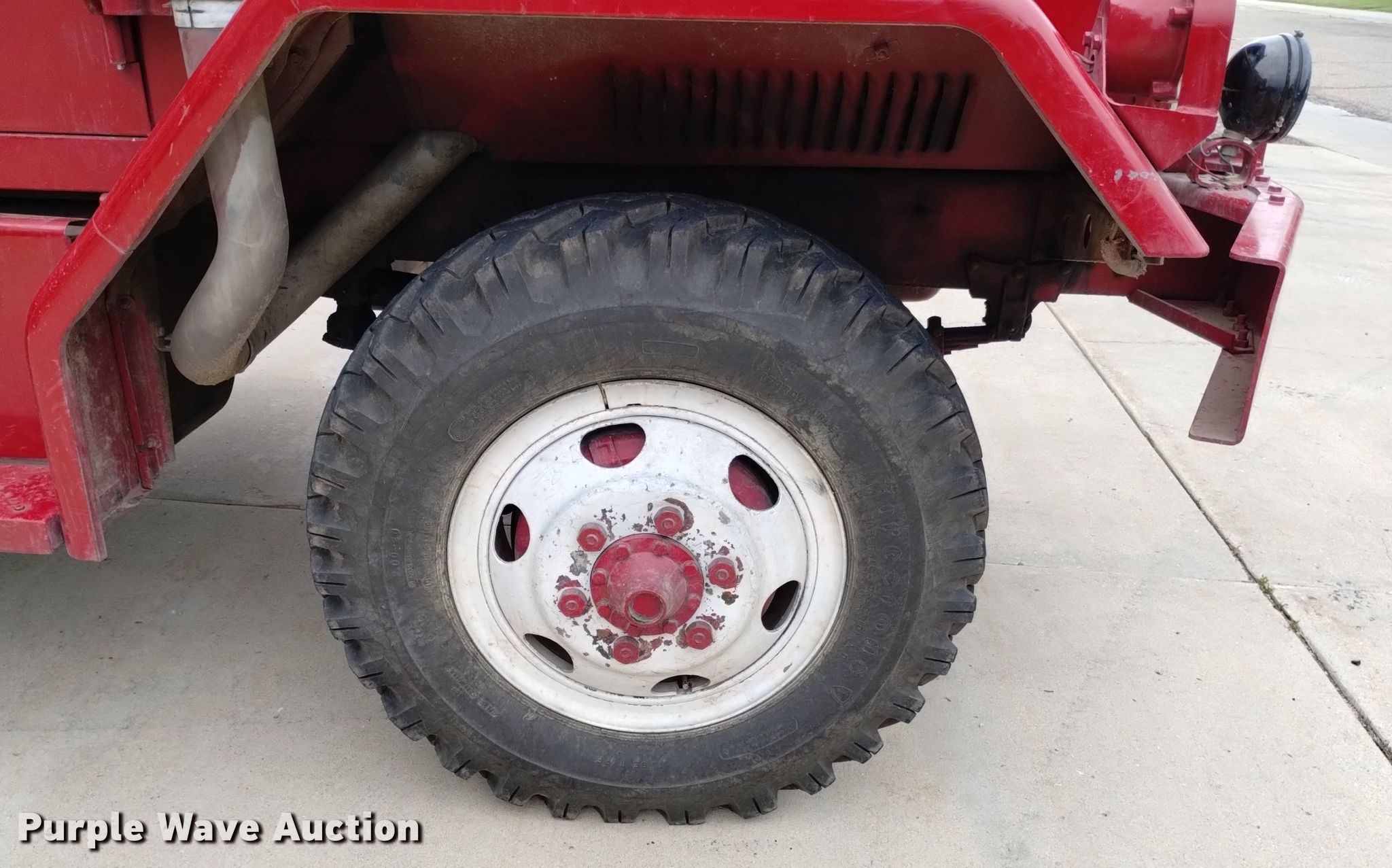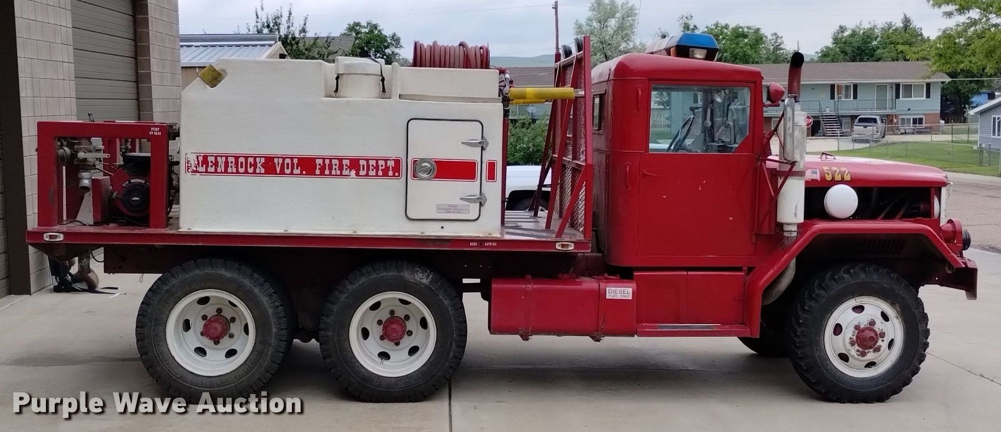 1972 Jeep M45A2 pumper fire truck. Miles: 17,829 on odometer, VIN: 04A34971053410248. Engine White 465IC, Serial: 1874104, Multifuel, Cylinders: 6. Transmission Manual, Speed: 5. Chassis Four wheel drive, Axles: Tandem, Suspension: Spring, Brakes: Hydraulic, GVWR: 20,417 lbs. Interior Heat. Features Fire truck body Pump, Briggs & Stratton gas engine, HP: 18, Cylinders: 2, Outlet: 3", Hose, Tank Capacity: 800 gallons. Tires Size: 9.00-20. Wyoming title. Glenrock Fire Department. 704 West Birch Street. Glenrock, WY 82637