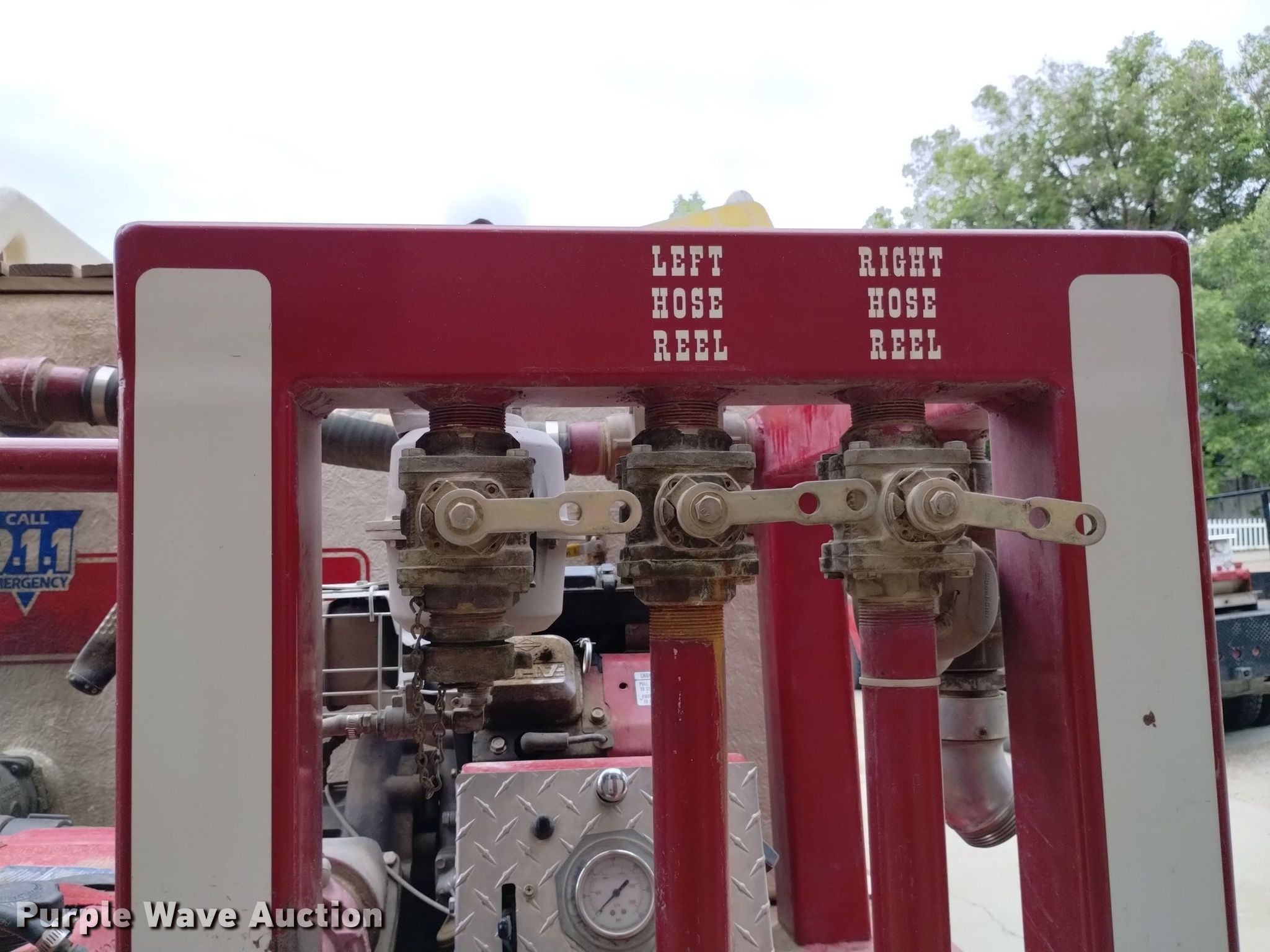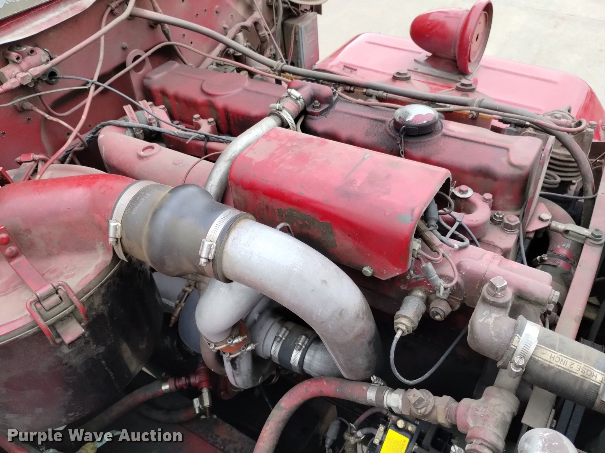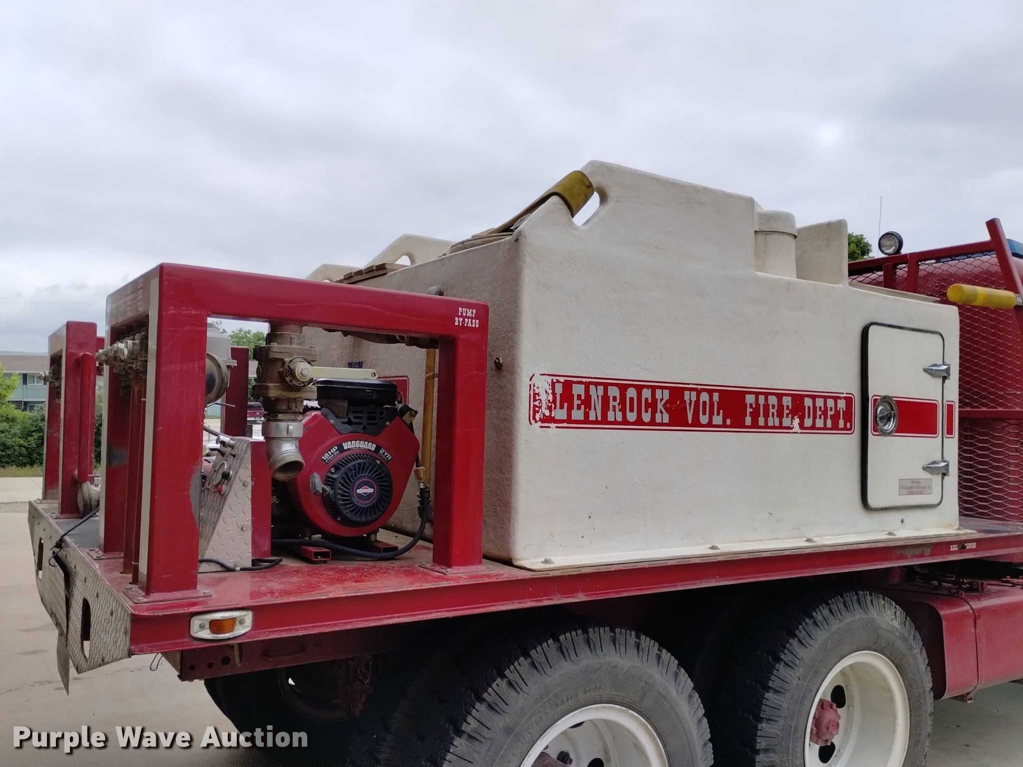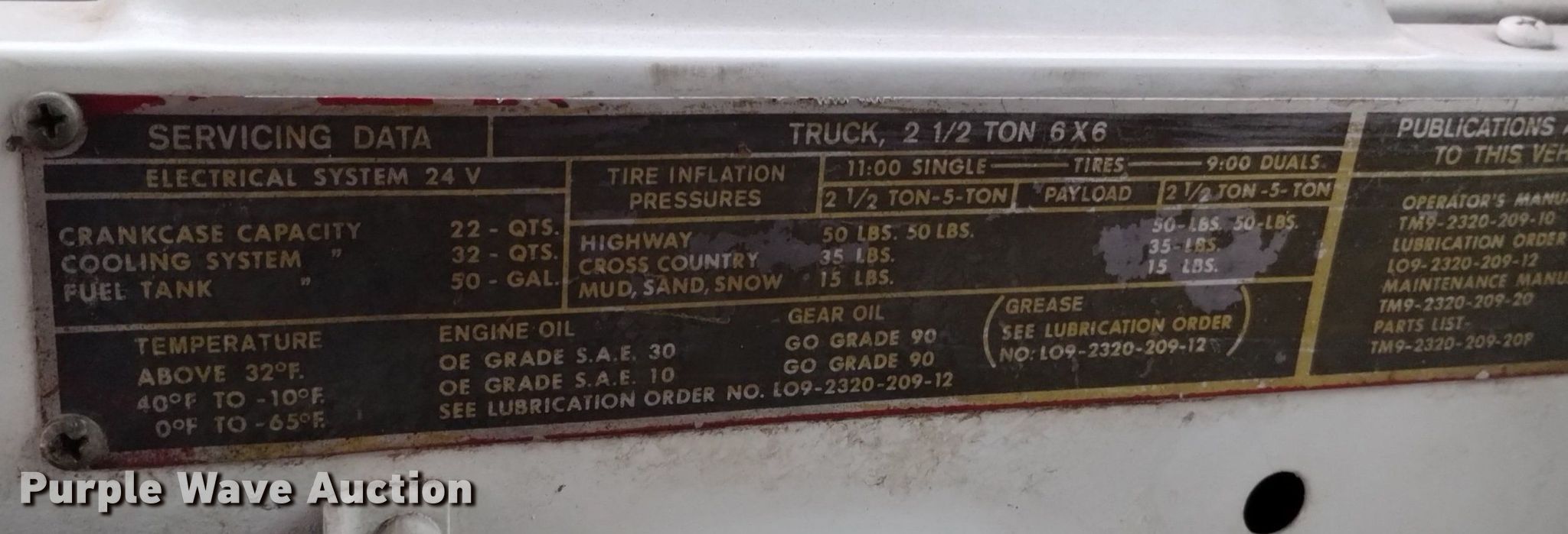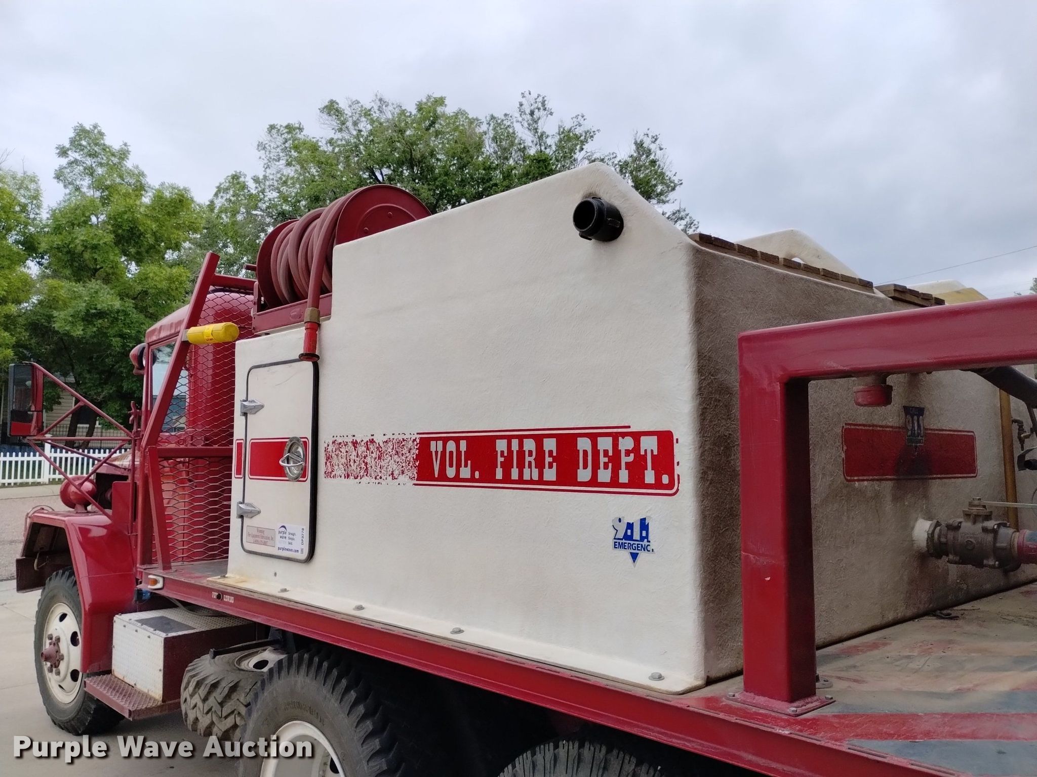 1972 Jeep M45A2 pumper fire truck. Miles: 17,829 on odometer, VIN: 04A34971053410248. Engine White 465IC, Serial: 1874104, Multifuel, Cylinders: 6. Transmission Manual, Speed: 5. Chassis Four wheel drive, Axles: Tandem, Suspension: Spring, Brakes: Hydraulic, GVWR: 20,417 lbs. Interior Heat. Features Fire truck body Pump, Briggs & Stratton gas engine, HP: 18, Cylinders: 2, Outlet: 3", Hose, Tank Capacity: 800 gallons. Tires Size: 9.00-20. Wyoming title. Glenrock Fire Department. 704 West Birch Street. Glenrock, WY 82637