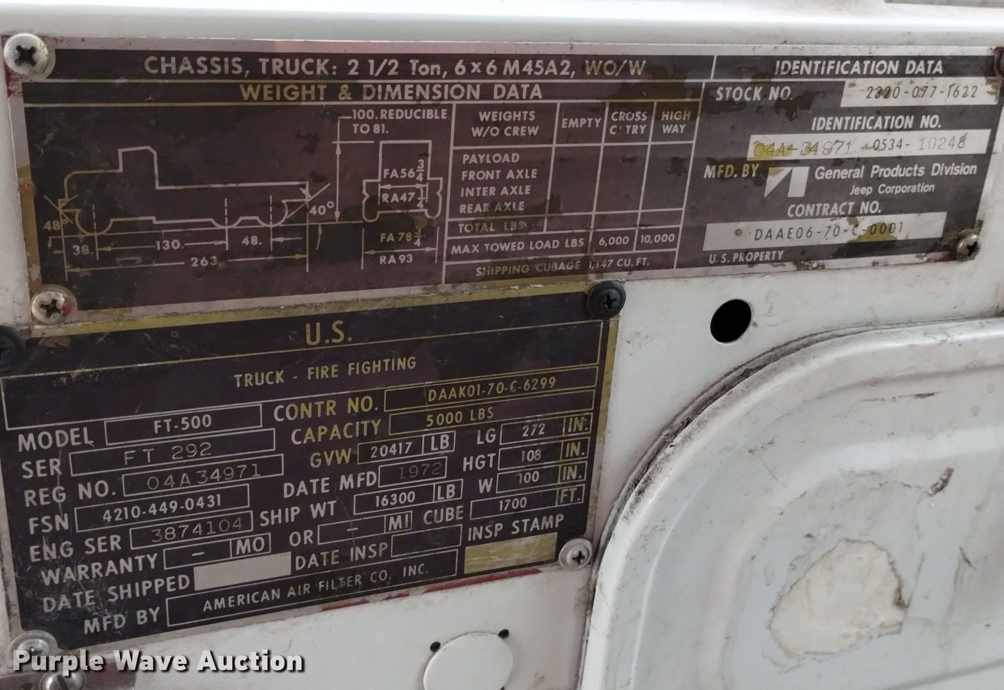 Purple Wave is selling a used Fire Truck or Emergency Vehicle in Wyoming. This item is a 1972 Jeep M45A2 pumper fire truck with the following: Miles: 17,829 on odometer, VIN: 04A34971053410248