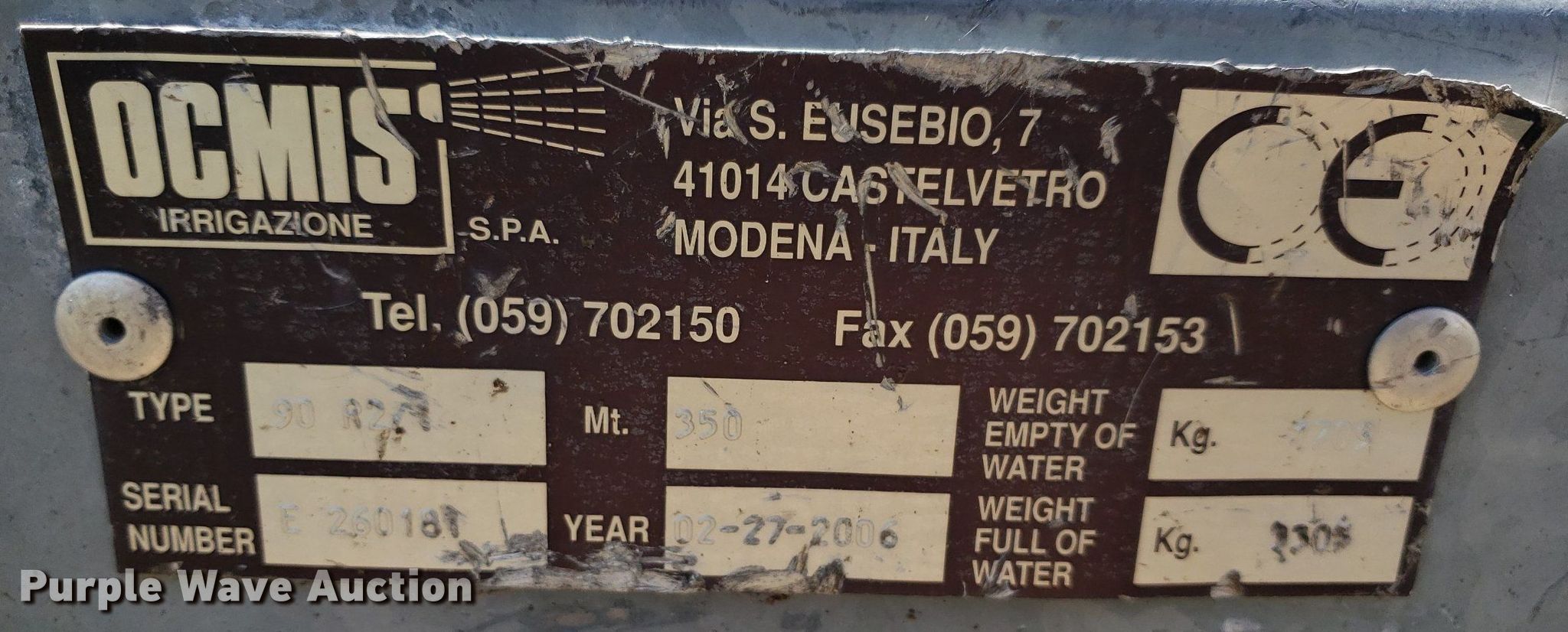 Purple Wave is selling a used Irrigation Equip. Attach. in Kansas. This item is a 2006 Ocmis 90 R2 water reel with the following: Serial: E26018
