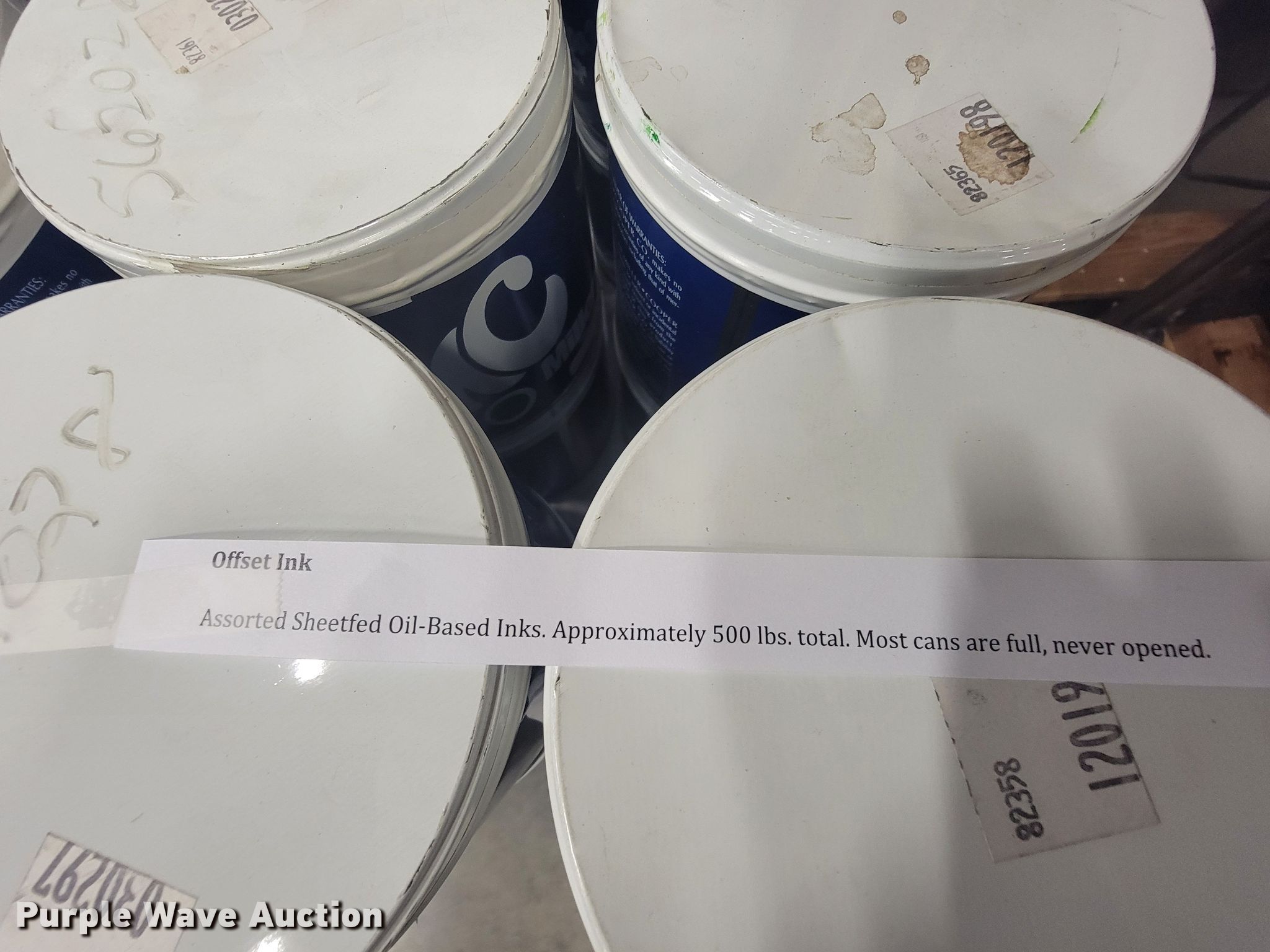 Purple Wave is selling a used Copy or Printing Machine in Kansas. This item is a Approximately 500 lbs of offset ink with the following: Approximately 500 lbs of offset ink. Pittsburg State University. Pittsburg, KS 66762