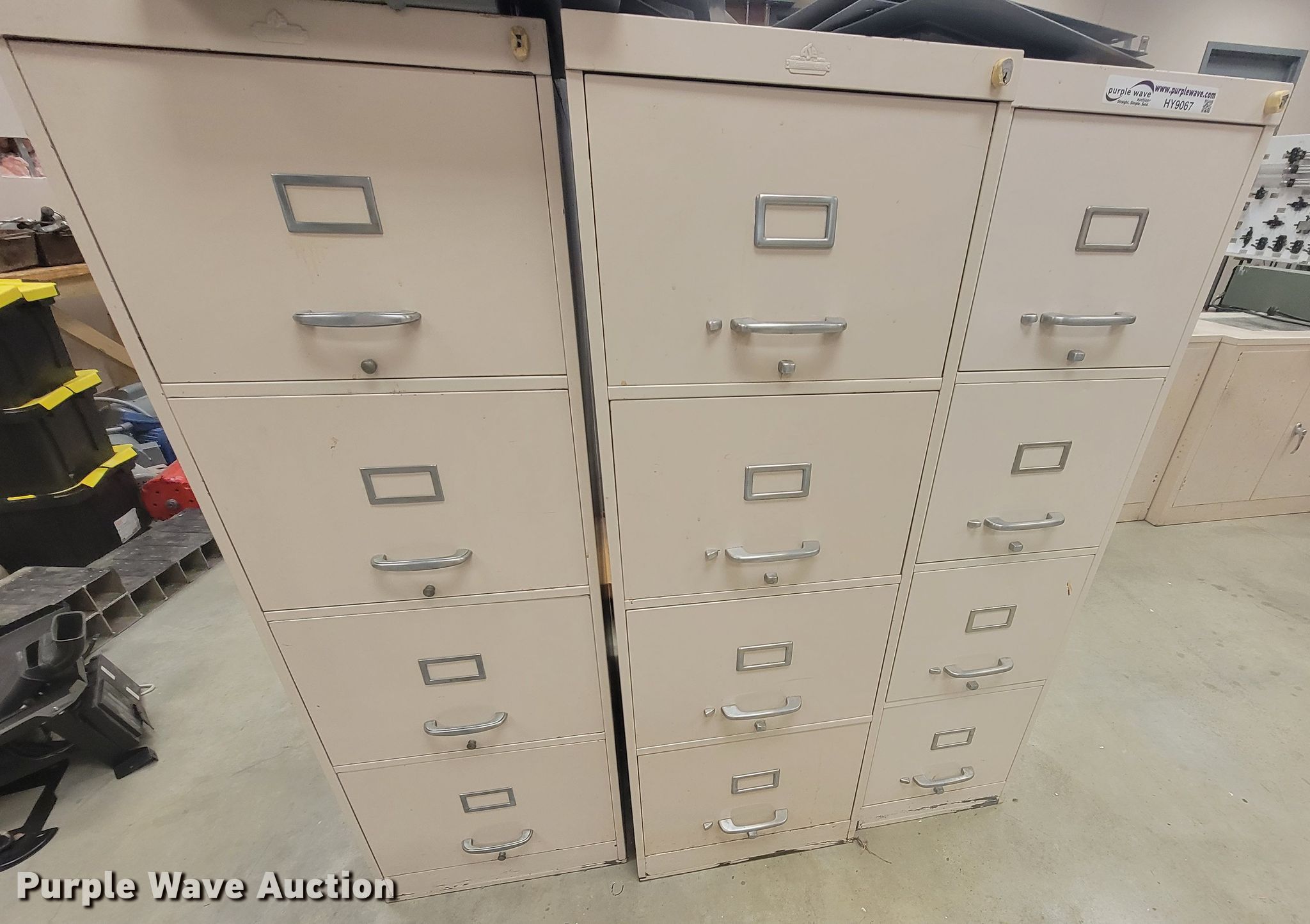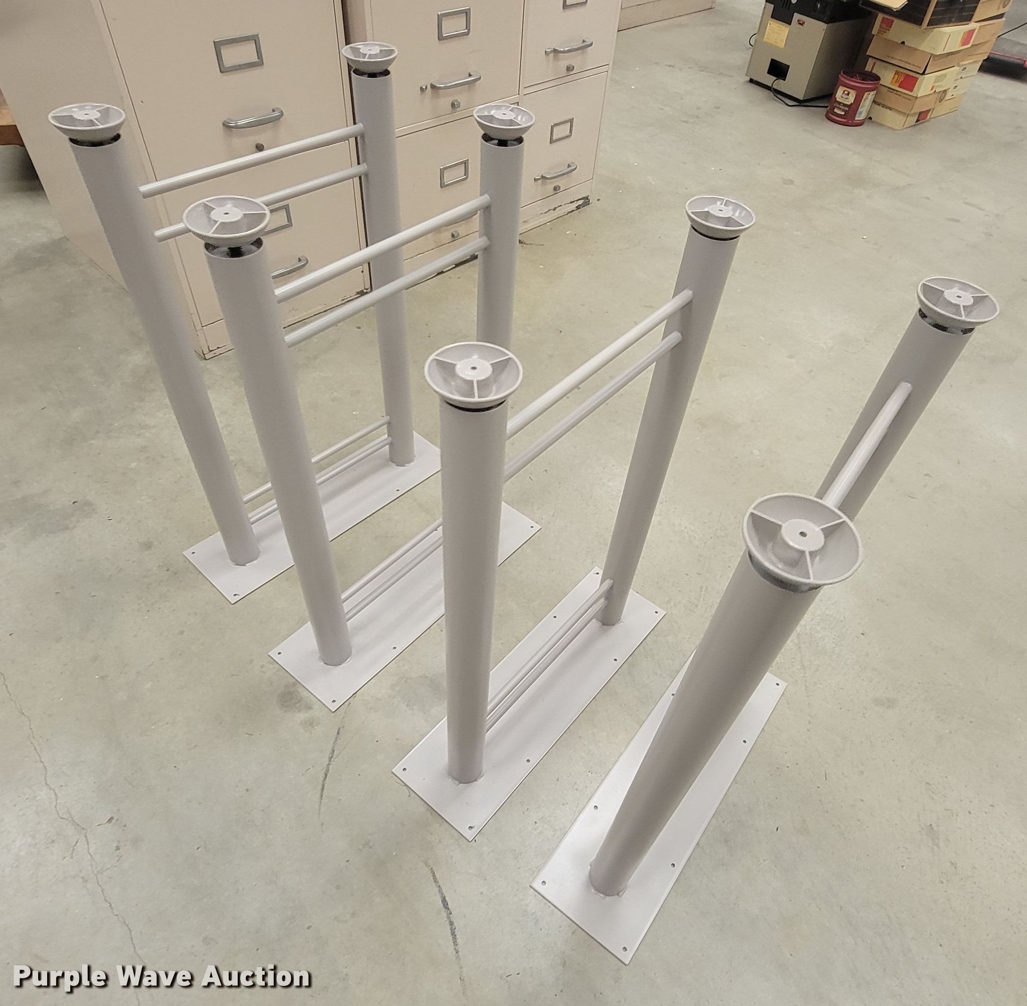 Purple Wave is selling a used Furniture in Kansas. This item is a Furniture with the following: (3) file cabinets, (2) sets of table legs, (2) cabinets