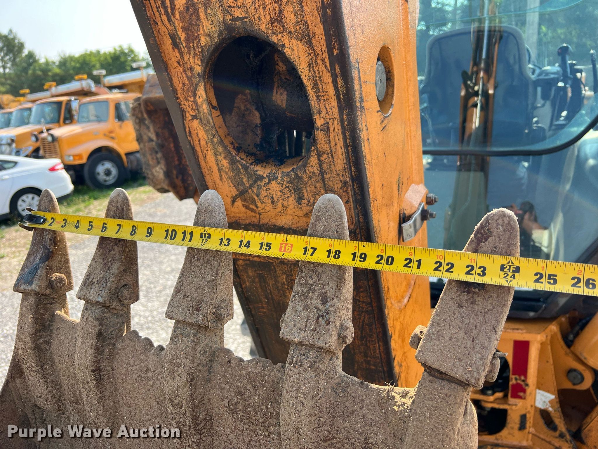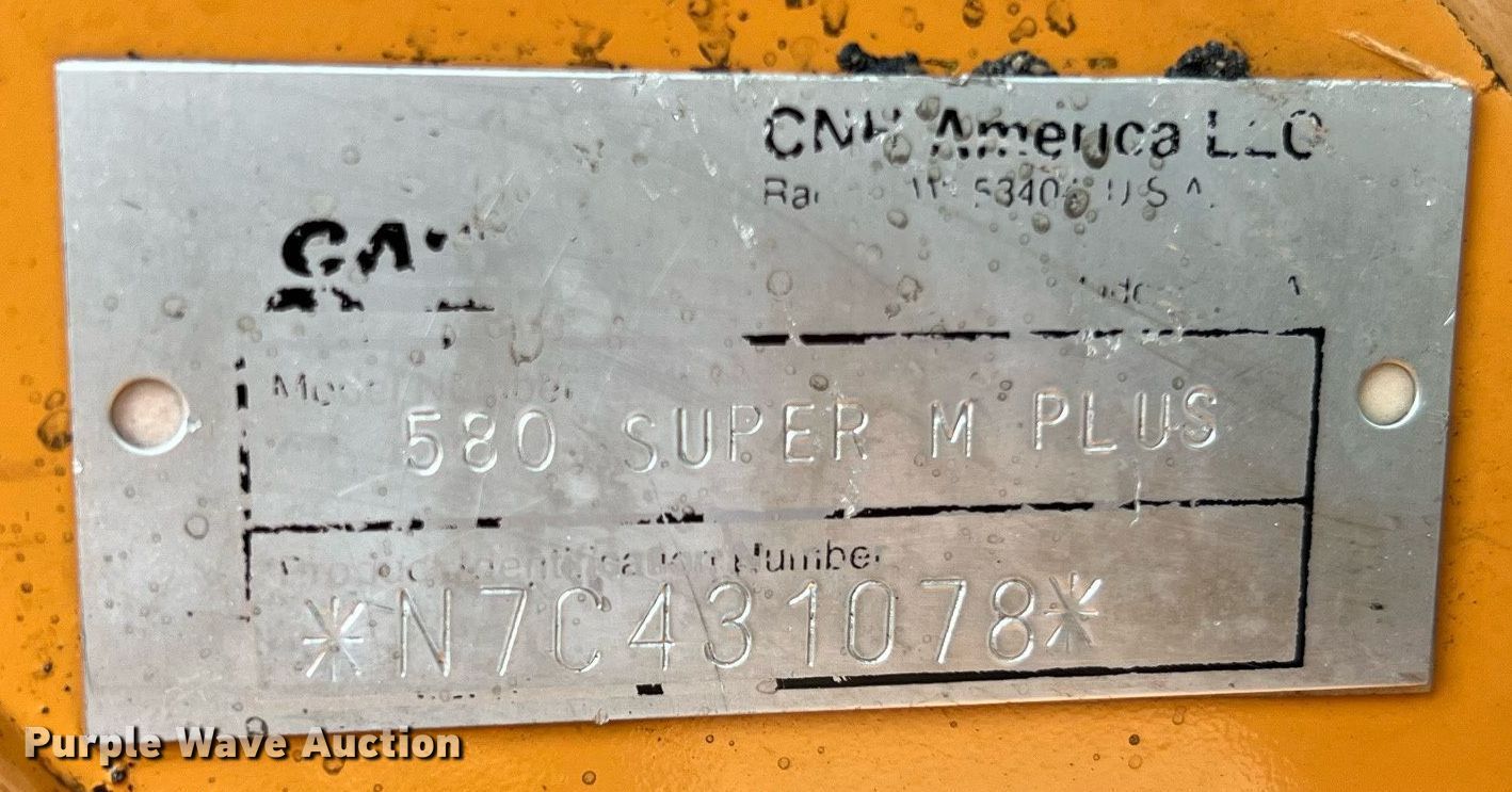 2007 Case 580 Super M+ backhoe. Hours: 4,860 on meter, Serial: N7C431078. Engine Cylinders: 4, Fuel type: Diesel. Transmission Shuttle shift, 4F - 4R. Chassis Four wheel drive. Operators station Enclosed cab, AC, Heat, Backhoe controls: Wobble stick / two stick. Features Loader Quick coupler: Hydraulic, Auxiliary hydraulics, Bucket Width: 94", Cutting edge: Bolt-on, Forks FFC 87334961, Length: 48", Backhoe Extendable stick, Bucket Width: 24", Teeth: 5.. Tires Front: 320/80-18, Rear: 21L-24. 8267 Old Highway 54. New Bloomfield, MO 65063