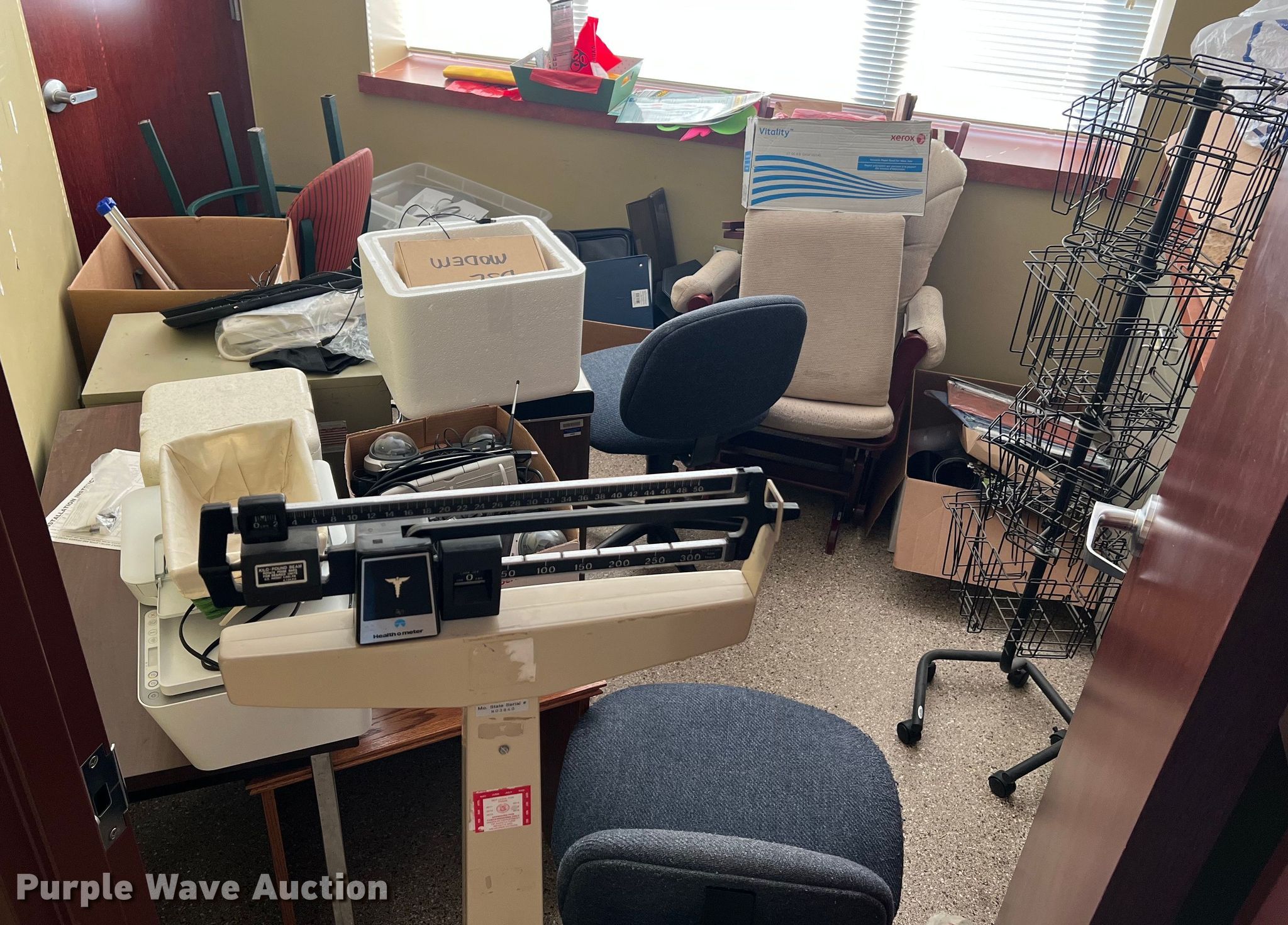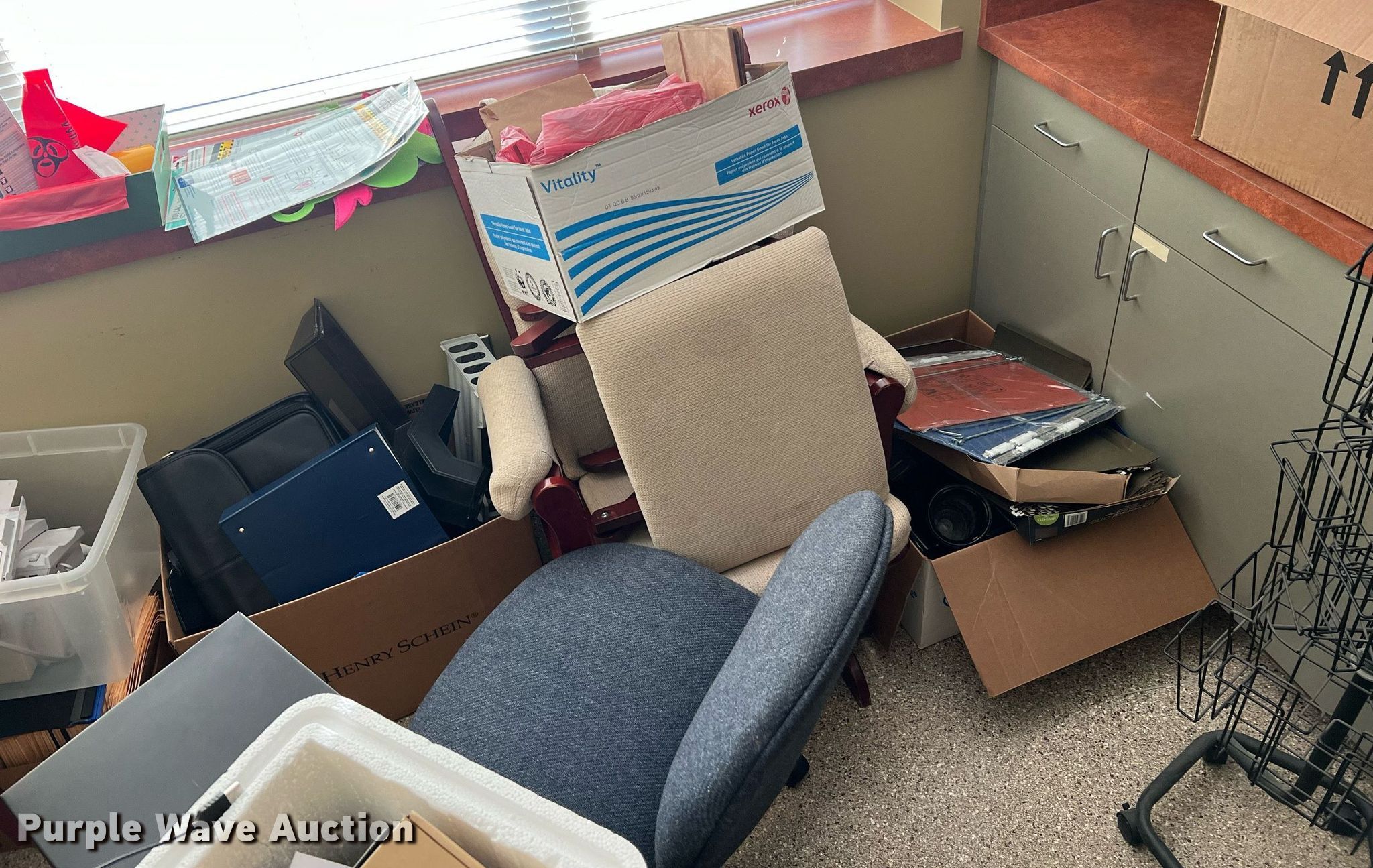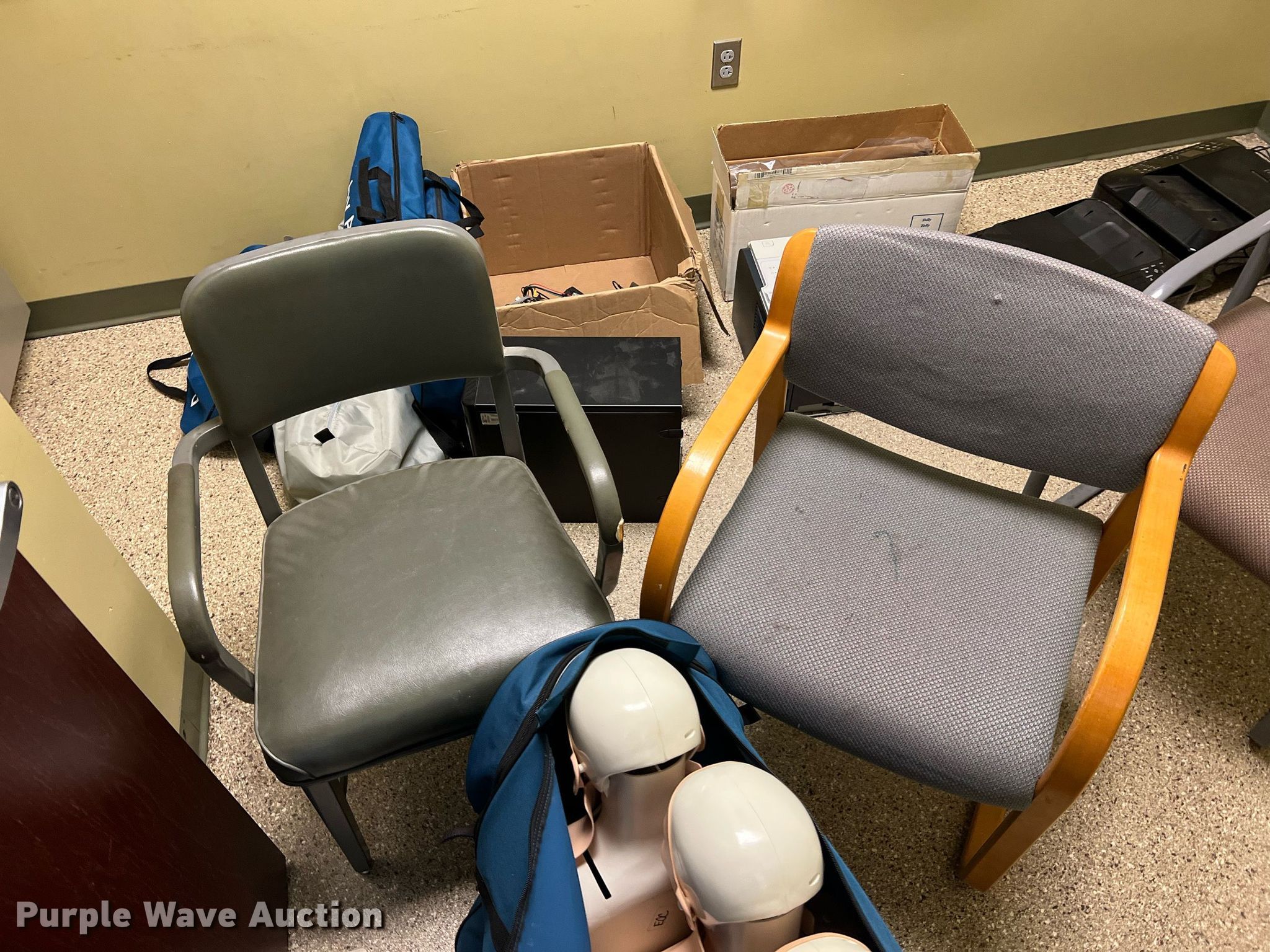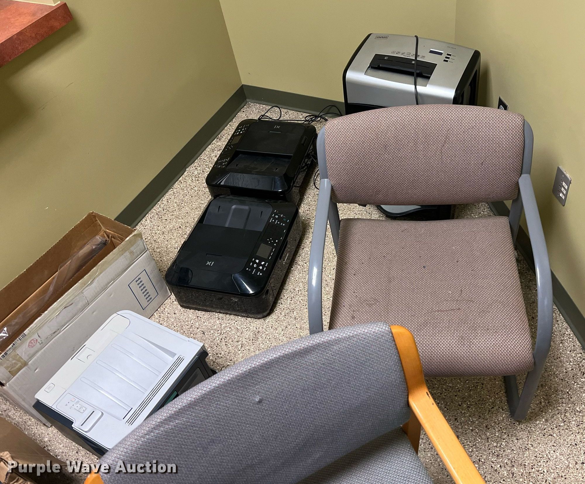 Purple Wave is selling a used Office Supplies and Equip. in Missouri. This item is a Office supplies and equipment with the following: Printers, Paper shredder, Chairs, Desks, Tables, Shelves, RCA television, Rugs, Shark steam mop, CPR mannequins