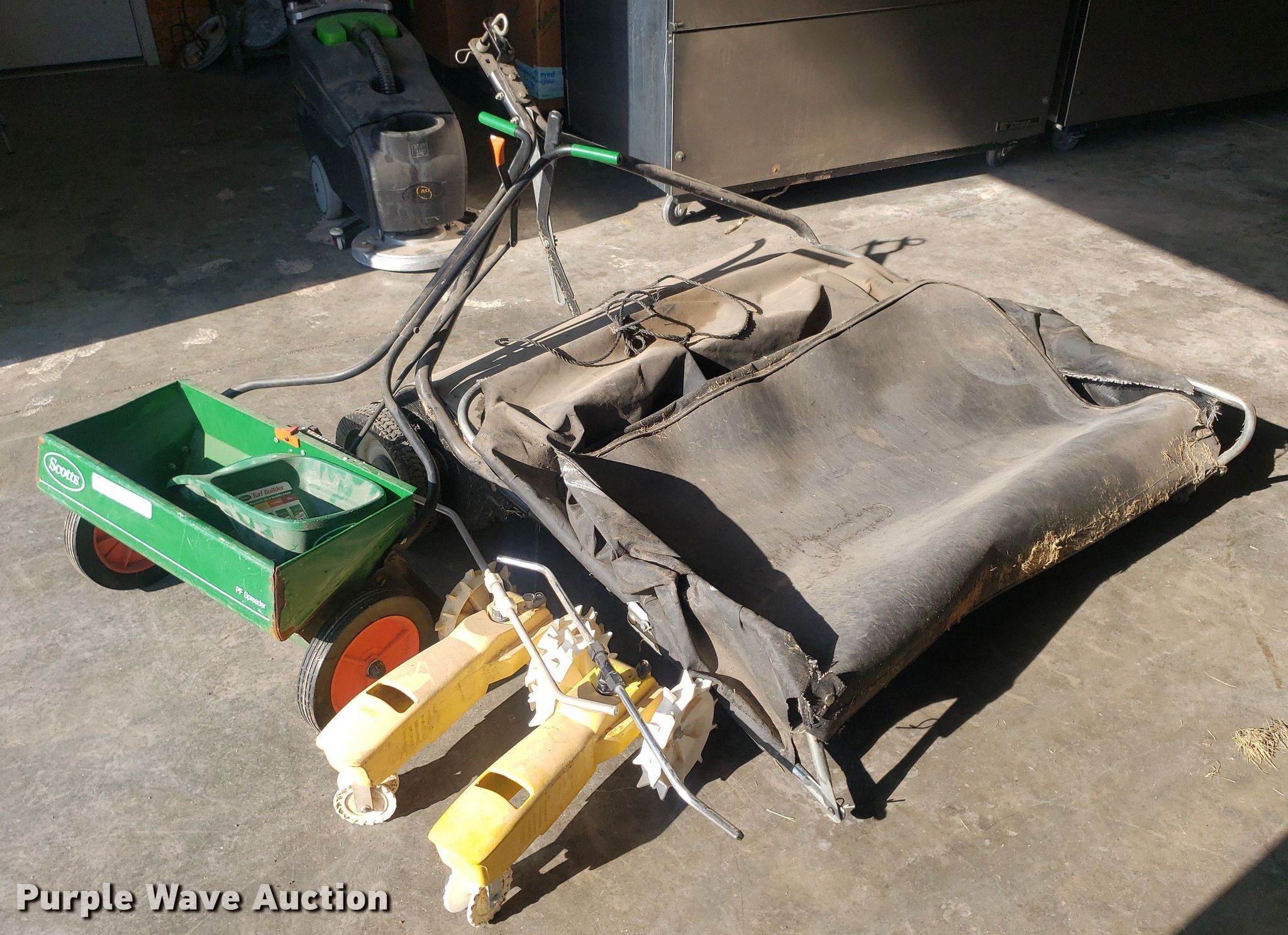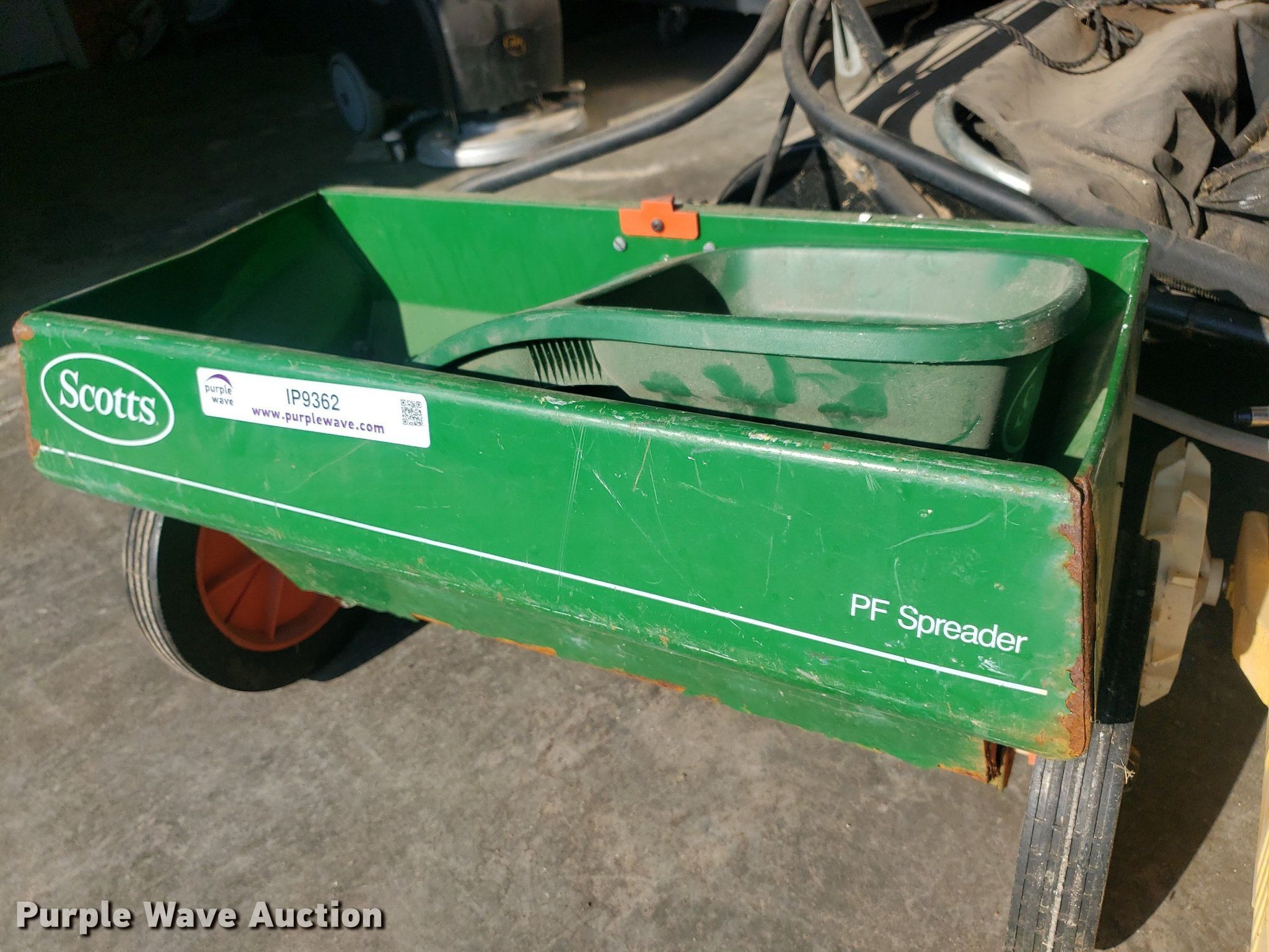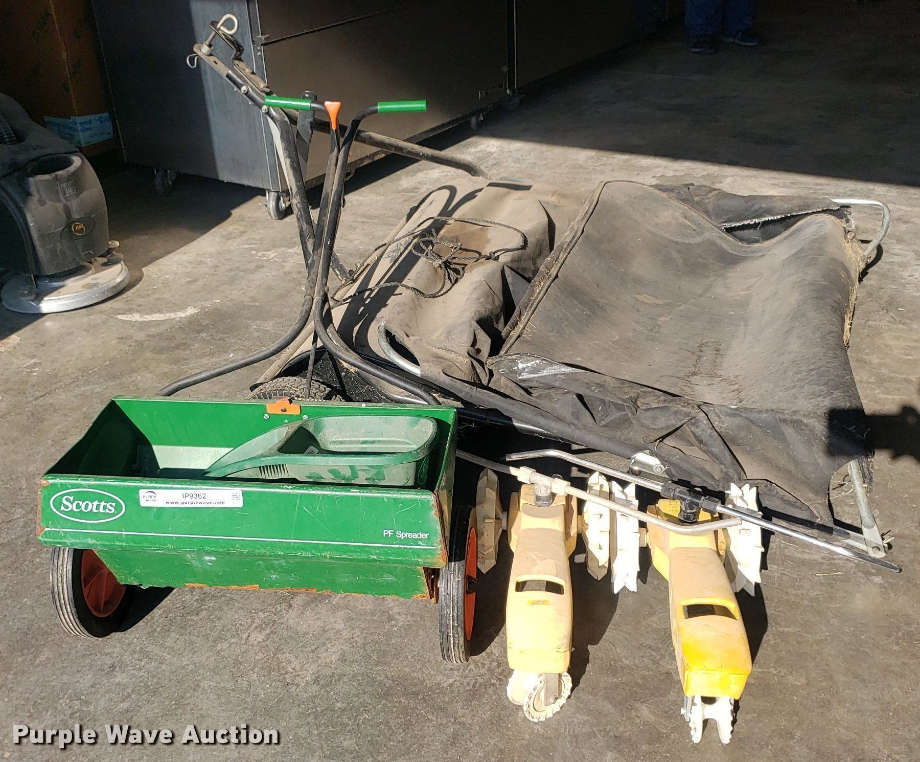 Purple Wave is selling a used Lawn and Garden in Kansas. This item is a Lawn equipment with the following: Scott's PF spreader, Scott's turf builder hand fertilizer, 48" lawn broom, (2) lawn tractor sprinklers