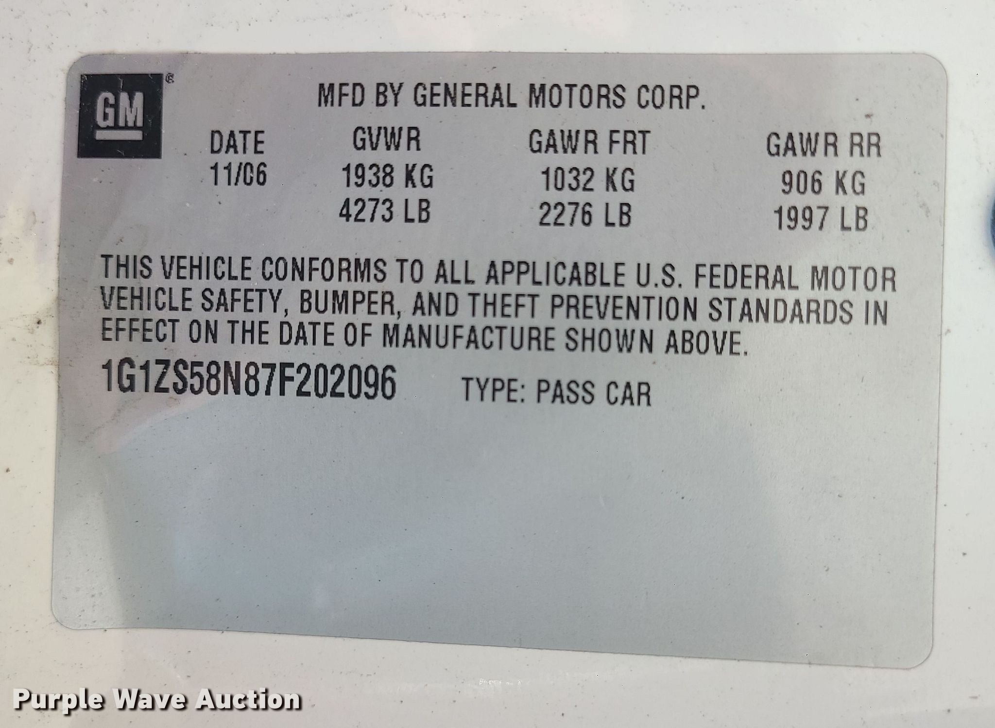 Purple Wave is selling a used Passenger Vehicle in Missouri. This item is a 2007 Chevrolet Malibu with the following: Miles: 50,111 on odometer, VIN: 1G1ZS58N87F202096, Unit #: 3761