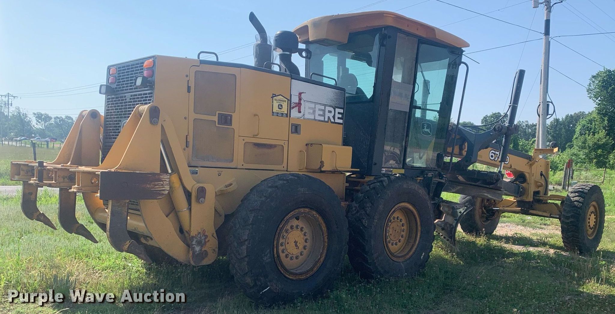 Purple Wave is selling a used Motor Grader in Oklahoma. This item is a 2005 John Deere 672D motor grader with the following: Hours: 1,034 on meter, Hour meter replaced at approximately 6,000 hours, Serial: DW672DX597861