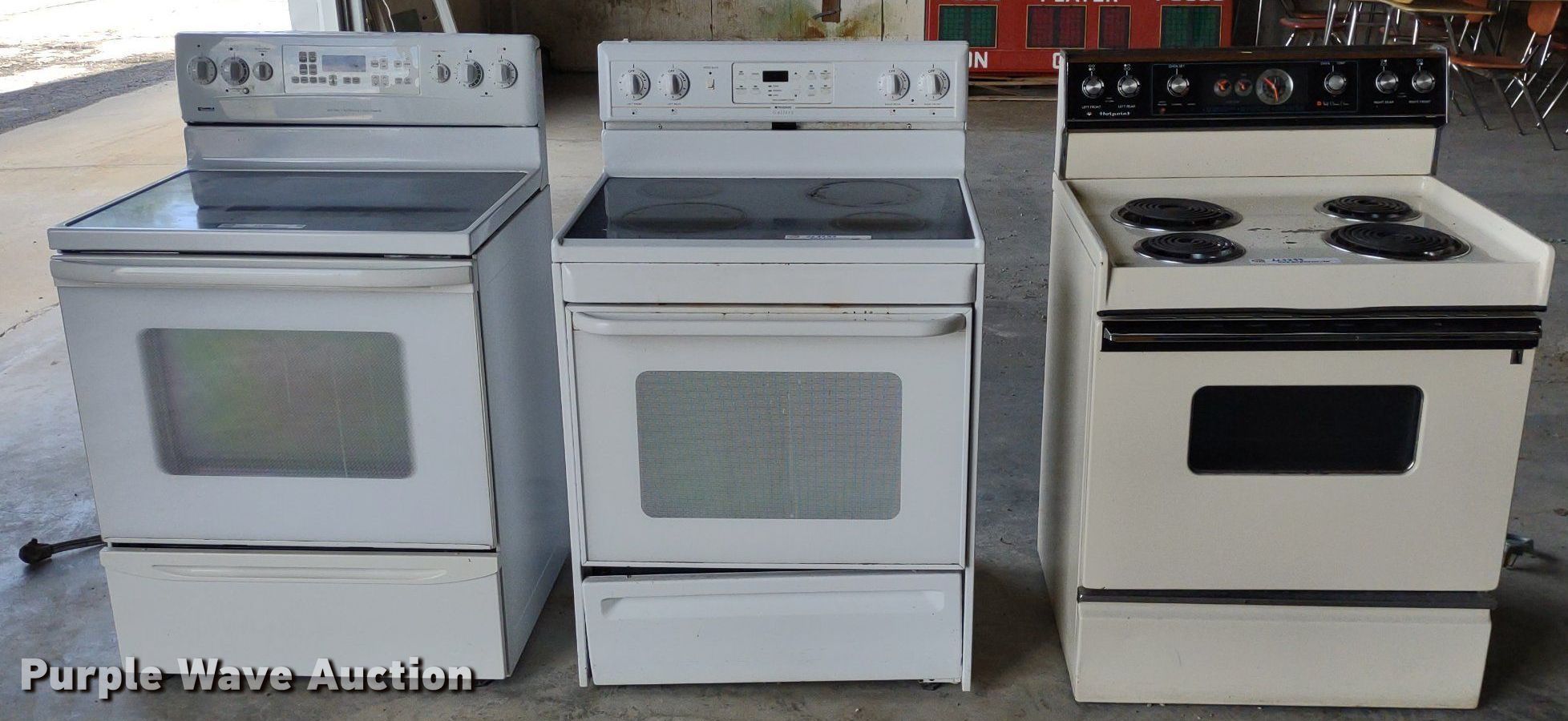 Purple Wave is selling a used Appliances in Kansas. This item is a (3) electric ranges with the following: Kenmore five burner, Frigidaire four burner, Hotpoint four burner