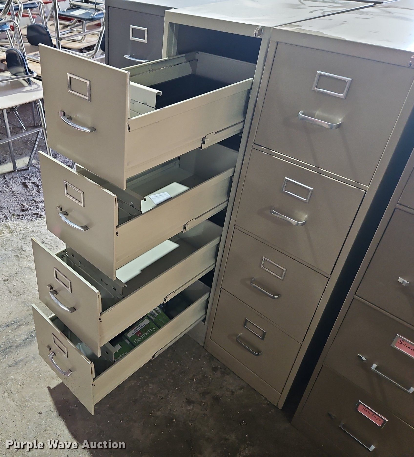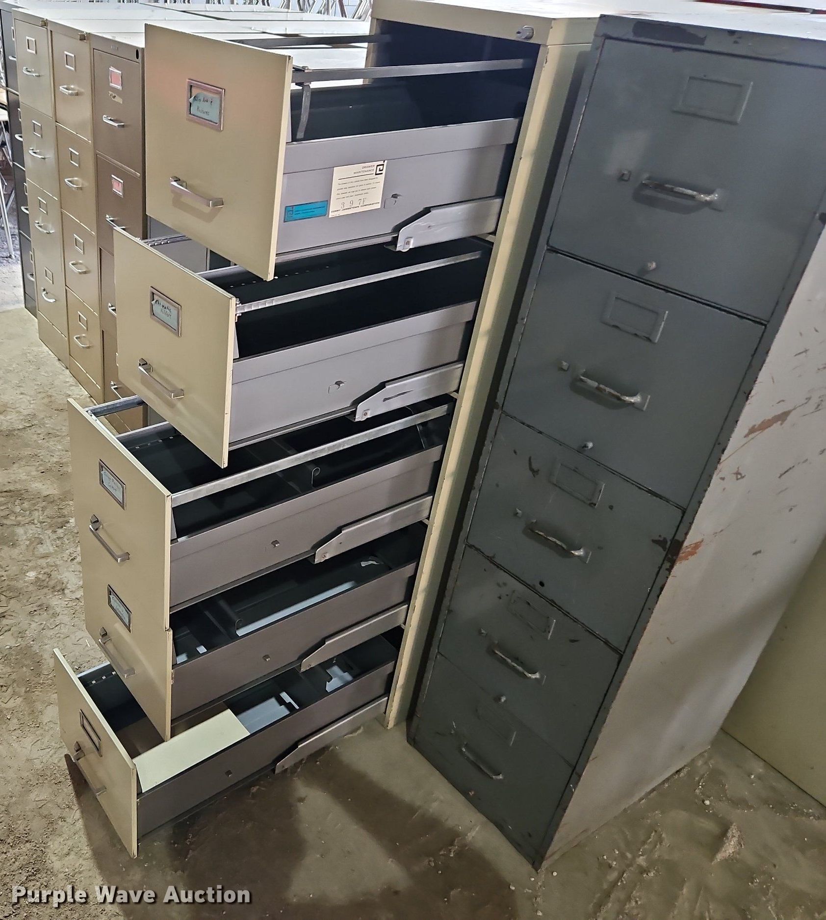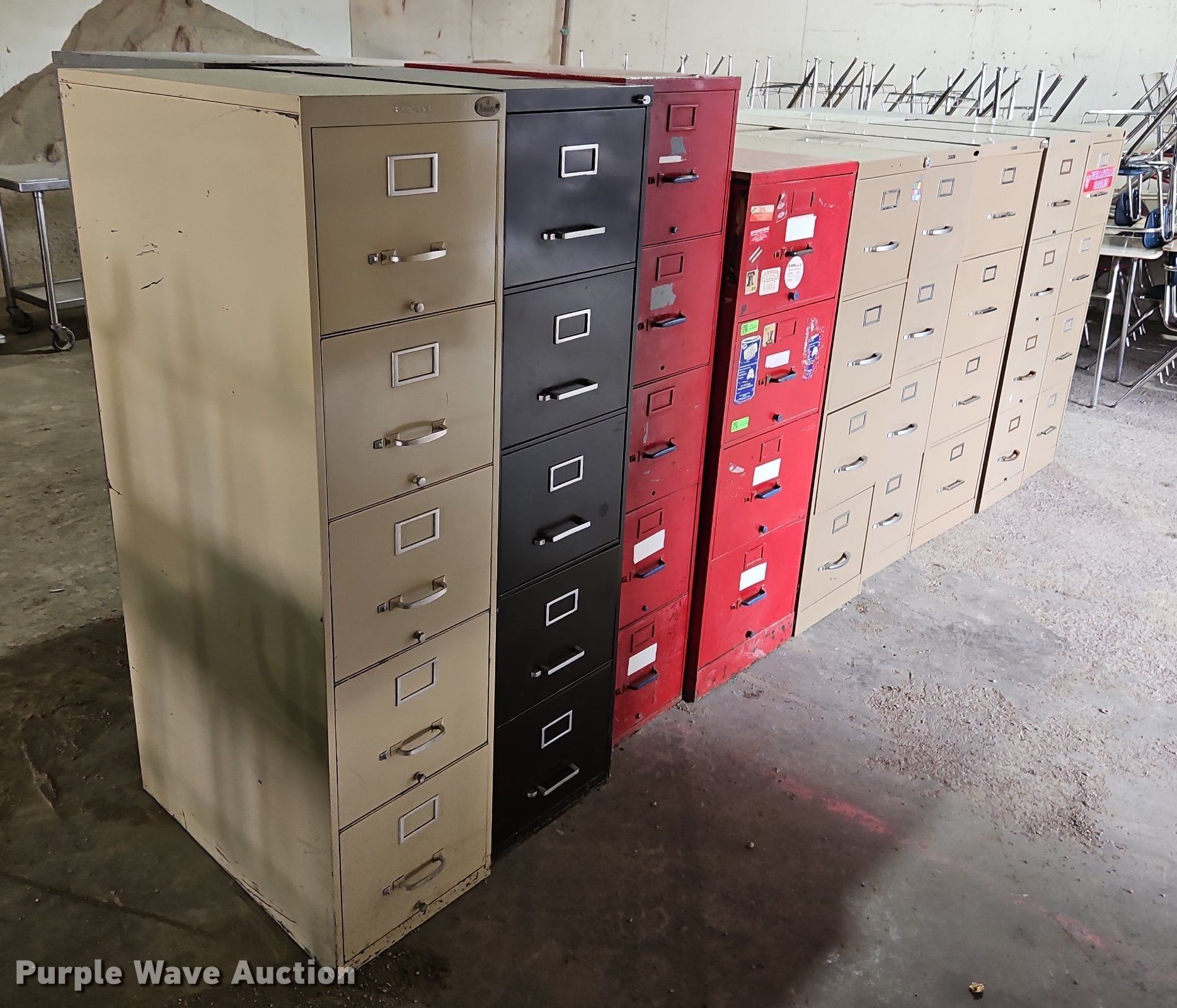 Purple Wave is selling a used Office Supplies and Equip. in Kansas. This item is a (17) file cabinets with the following: (5) five drawer, (12) four drawer