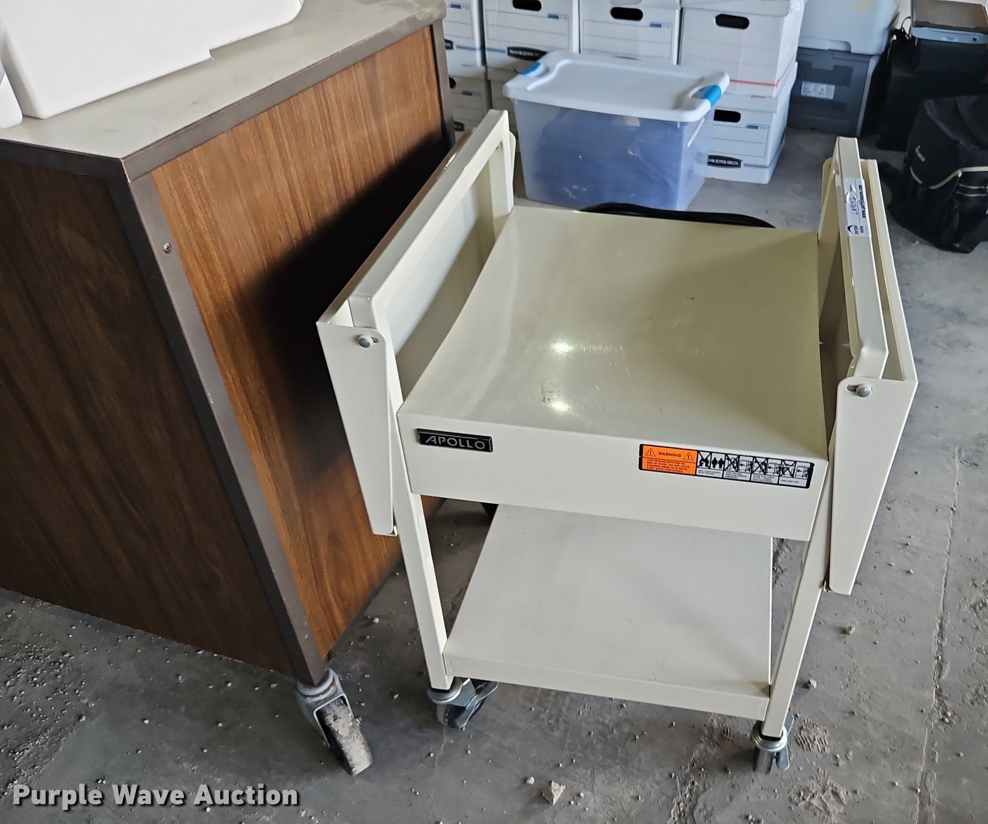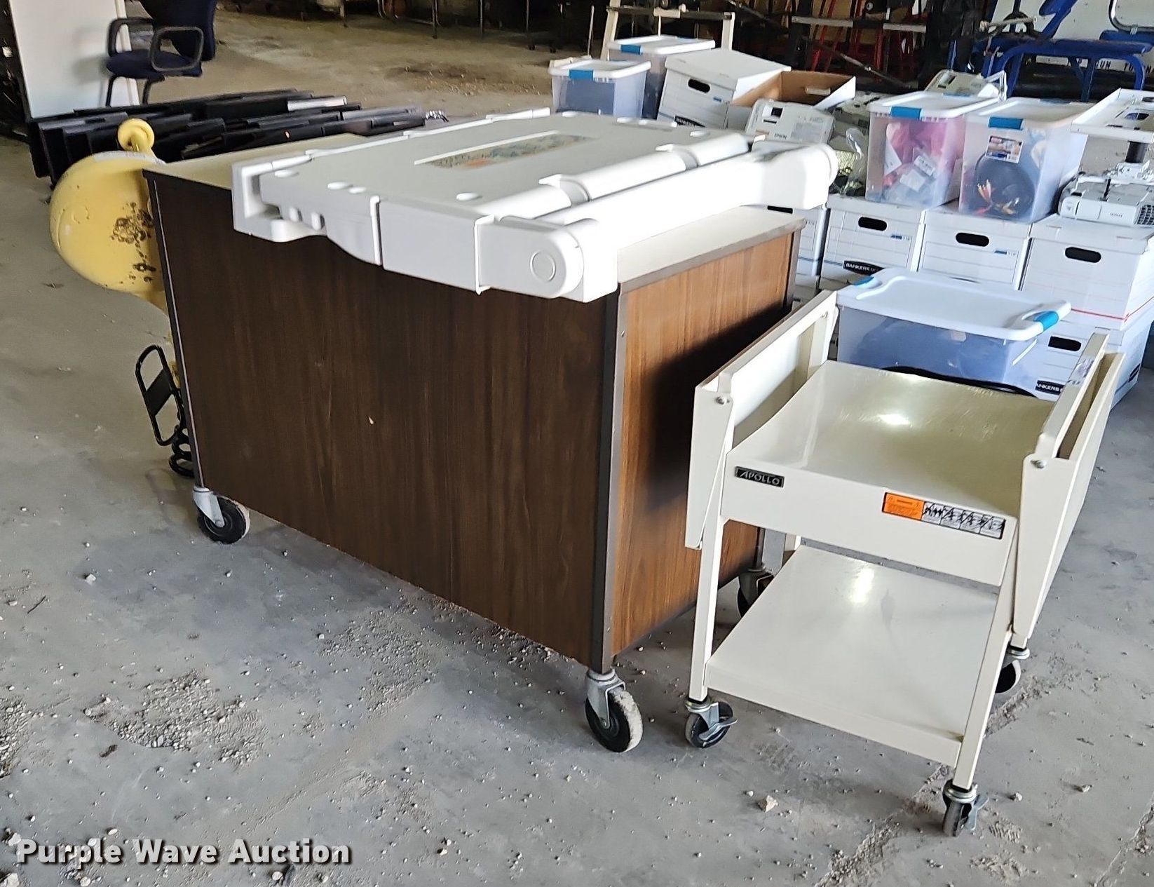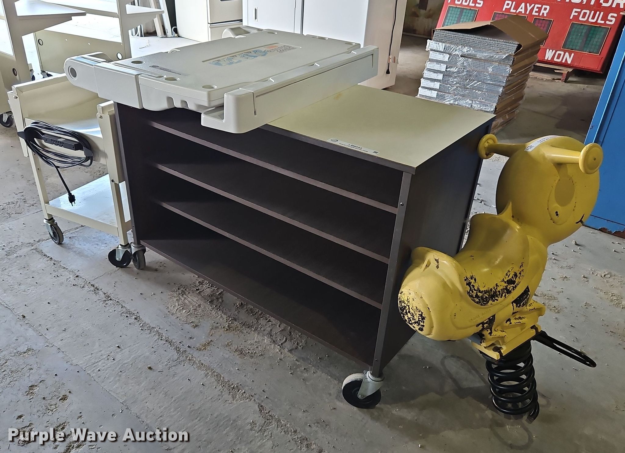 Purple Wave is selling a used Office Supplies and Equip. in Kansas. This item is a Office supplies and equipment with the following: Rubbermaid Sturdy Station 2, Wood cart, Metal cart, Snail Saddle Mates playground toy