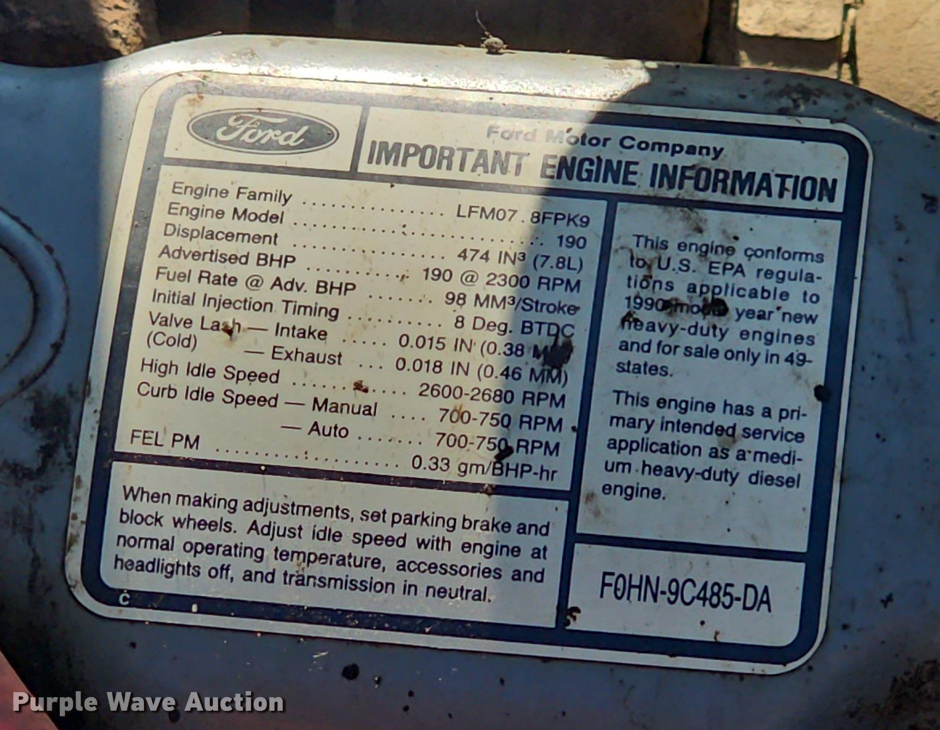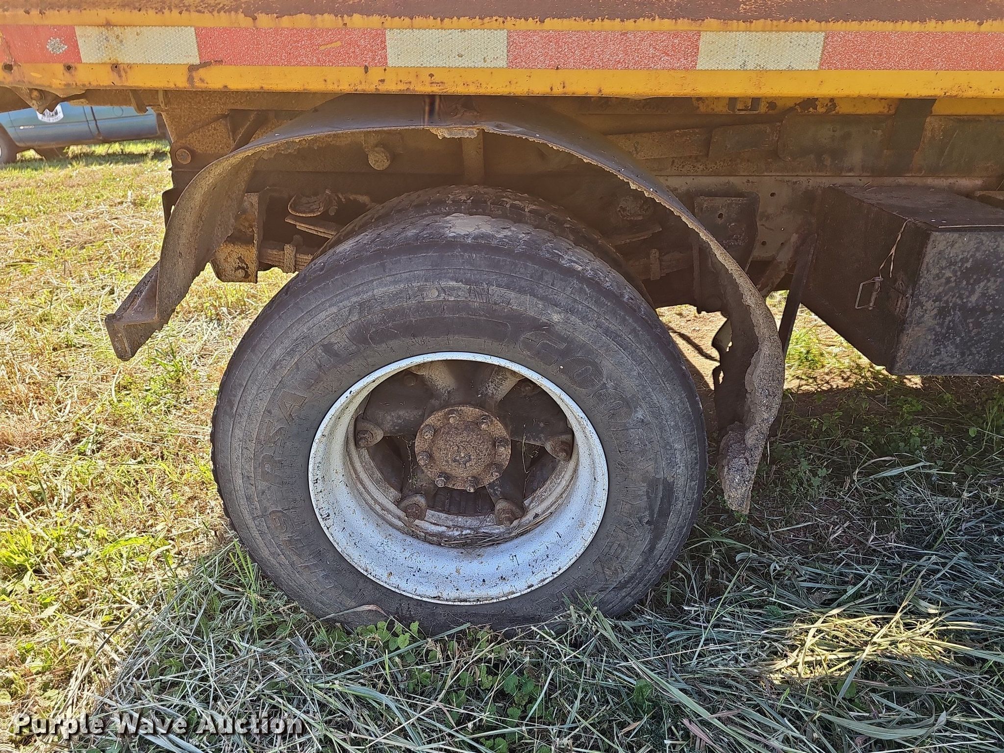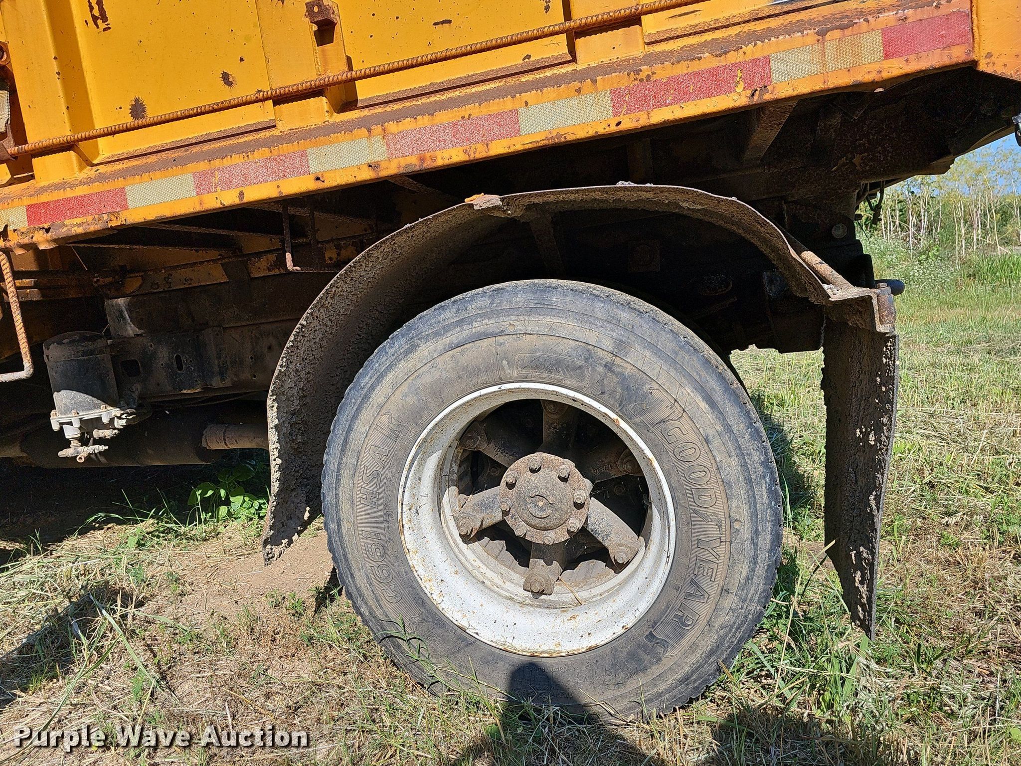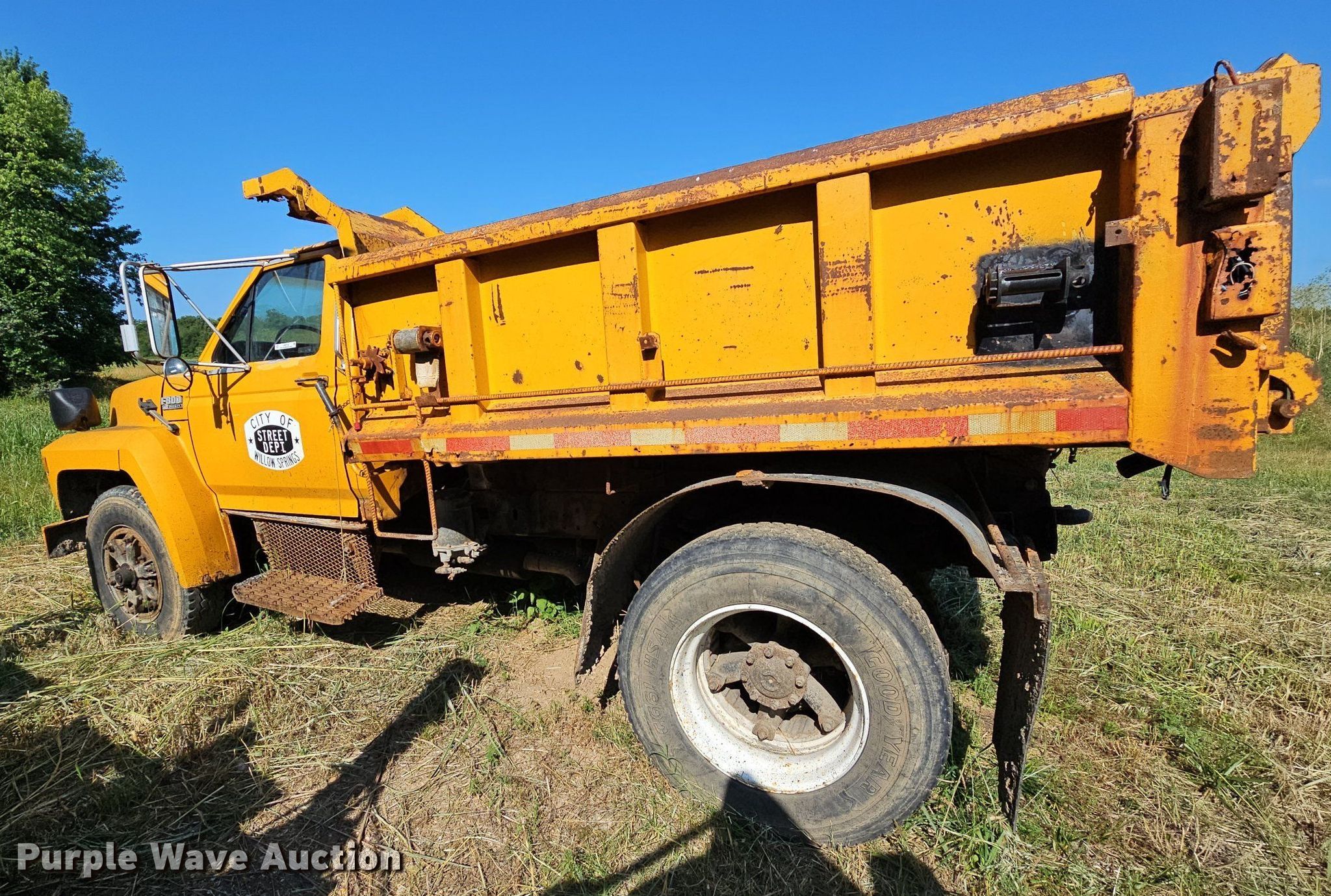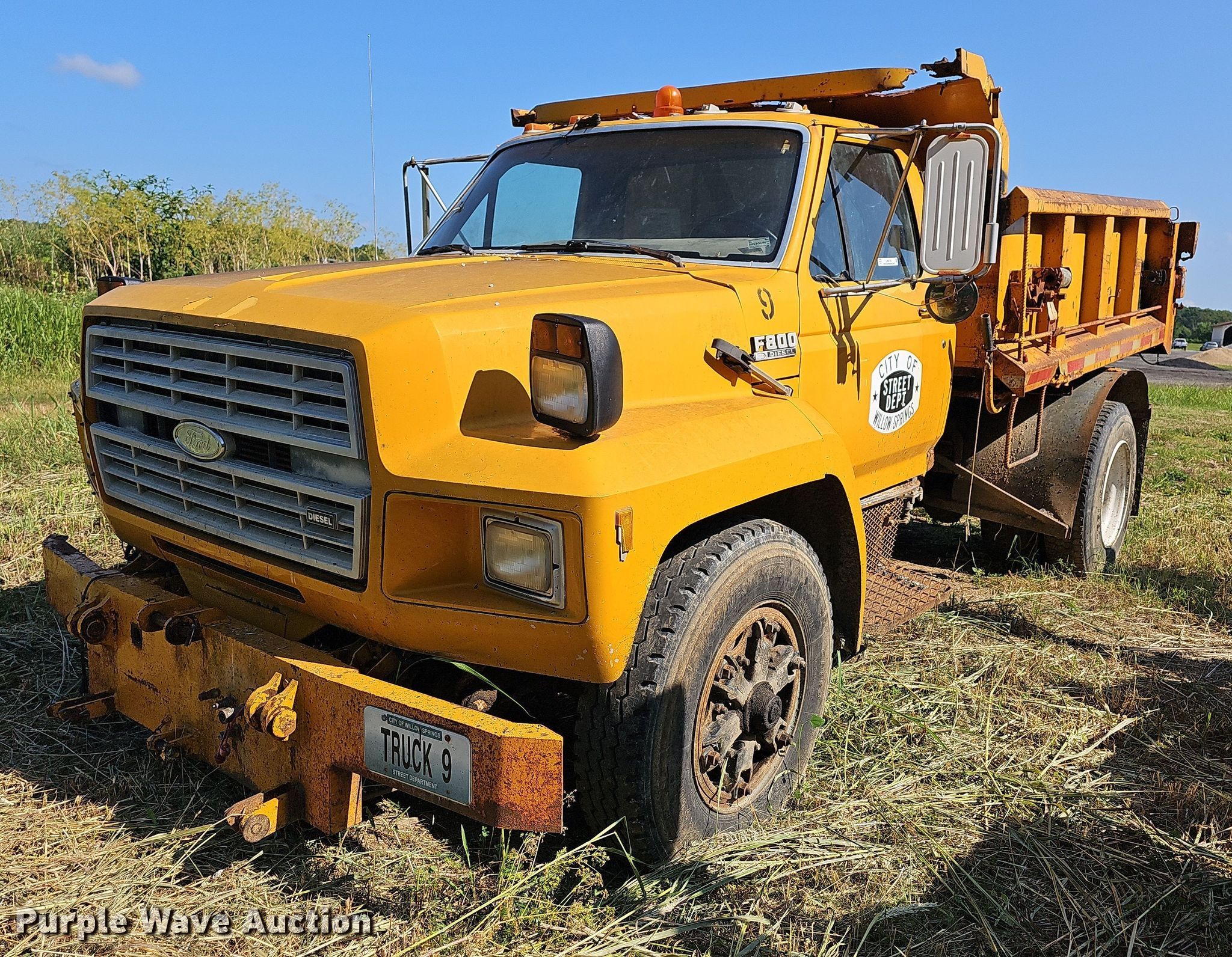 1991 Ford F800 dump truck. Miles: 169,047 on odometer, VIN: 1FDXK84AXMVA24174. Engine Displacement: 7.8L, Cylinders: 6, Fuel type: Diesel. Transmission Manual, Speed: 5. Chassis Axles: Single, Suspension: Spring, Brakes: Air, PTO. Interior Heat. Features Dump bed 9' L x 92" W, Side height: 33", Bed type: Steel, Ram: Single. Tires Front: 9.00R20, Rear: 10R22.5. Notes Non-operational unit. Missouri title. Title distribution may be delayed up to 14 days from verification of funds. City of Willow Springs. 900 West Main Street. Willow Springs, MO 65793