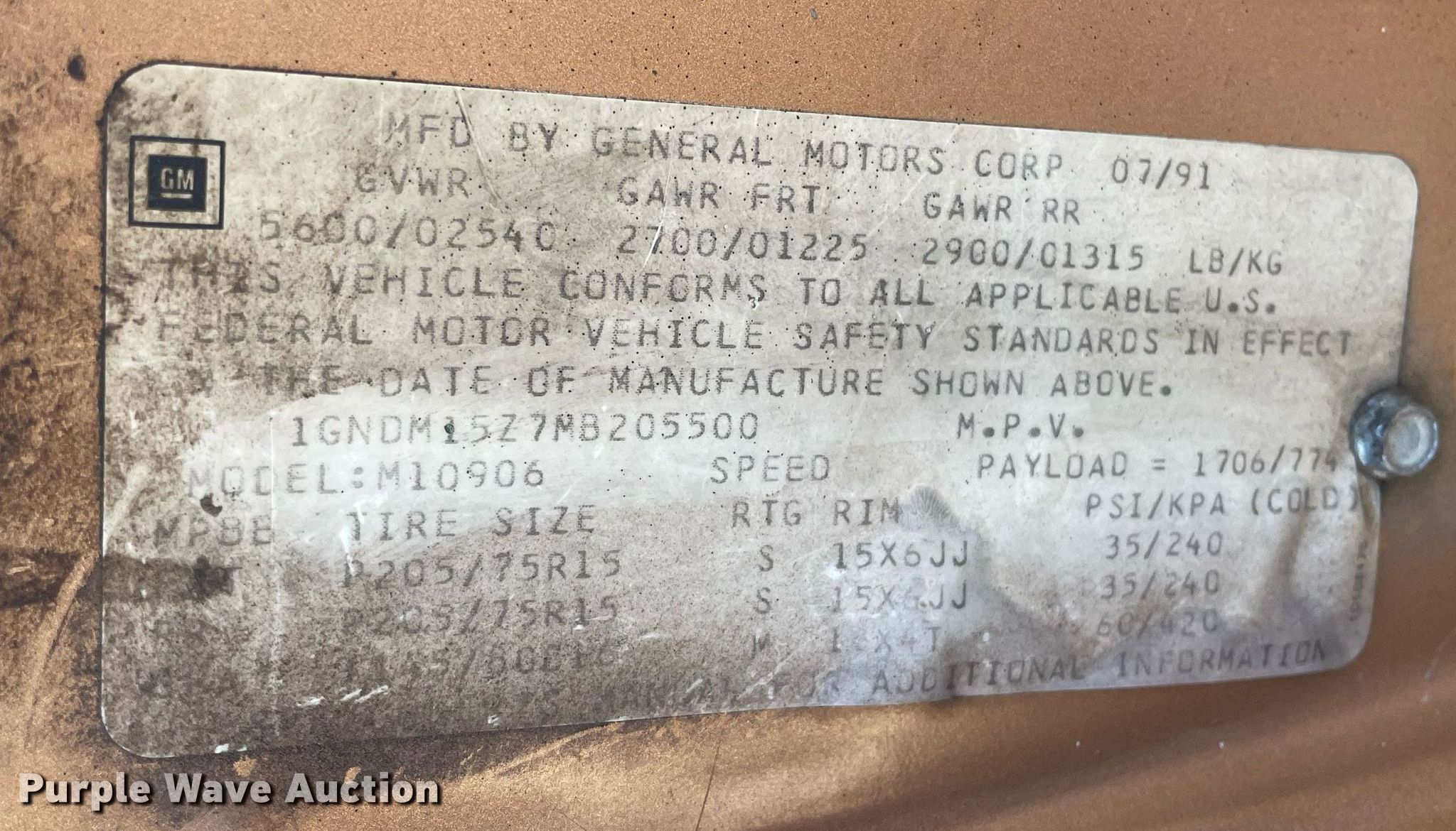 Purple Wave is selling a used Passenger Vehicle in Kansas. This item is a 1991 Chevrolet Astro van with the following: Miles: 63,090 on odometer, VIN: 1GNDM15Z7MB205500, Unit #: 41533