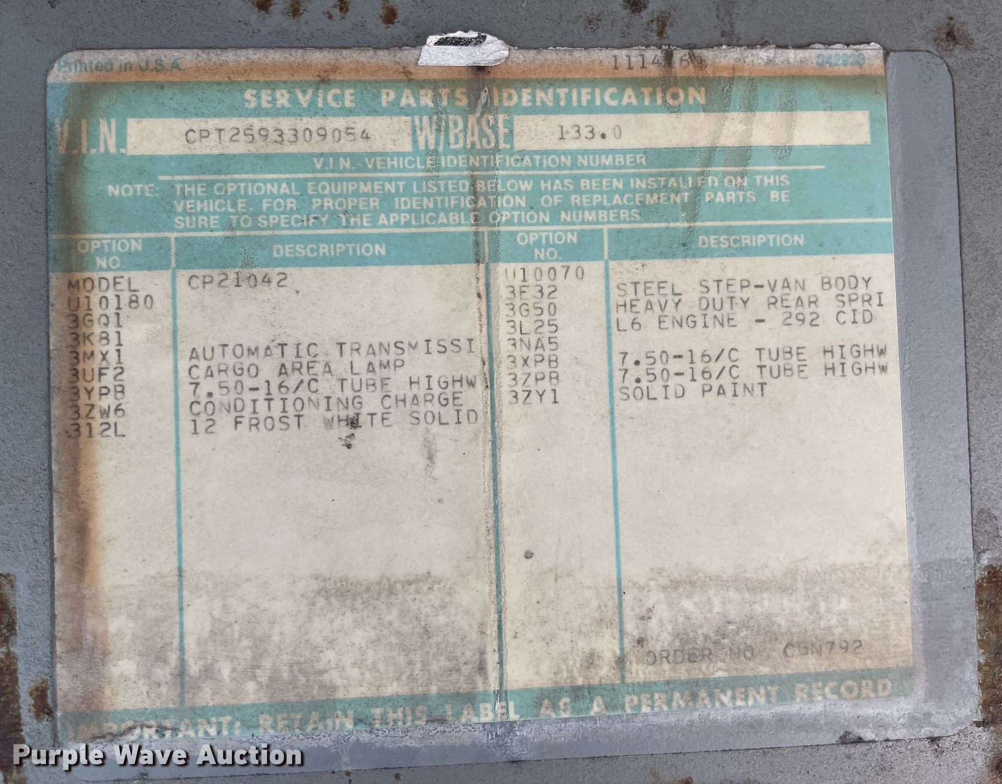 Purple Wave is selling a used Delivery Truck or Van in Kansas. This item is a 1979 Chevrolet Step Van 20 delivery van with the following: Miles: 66,258 on odometer, VIN: CPT2593309054, Unit #: 33842