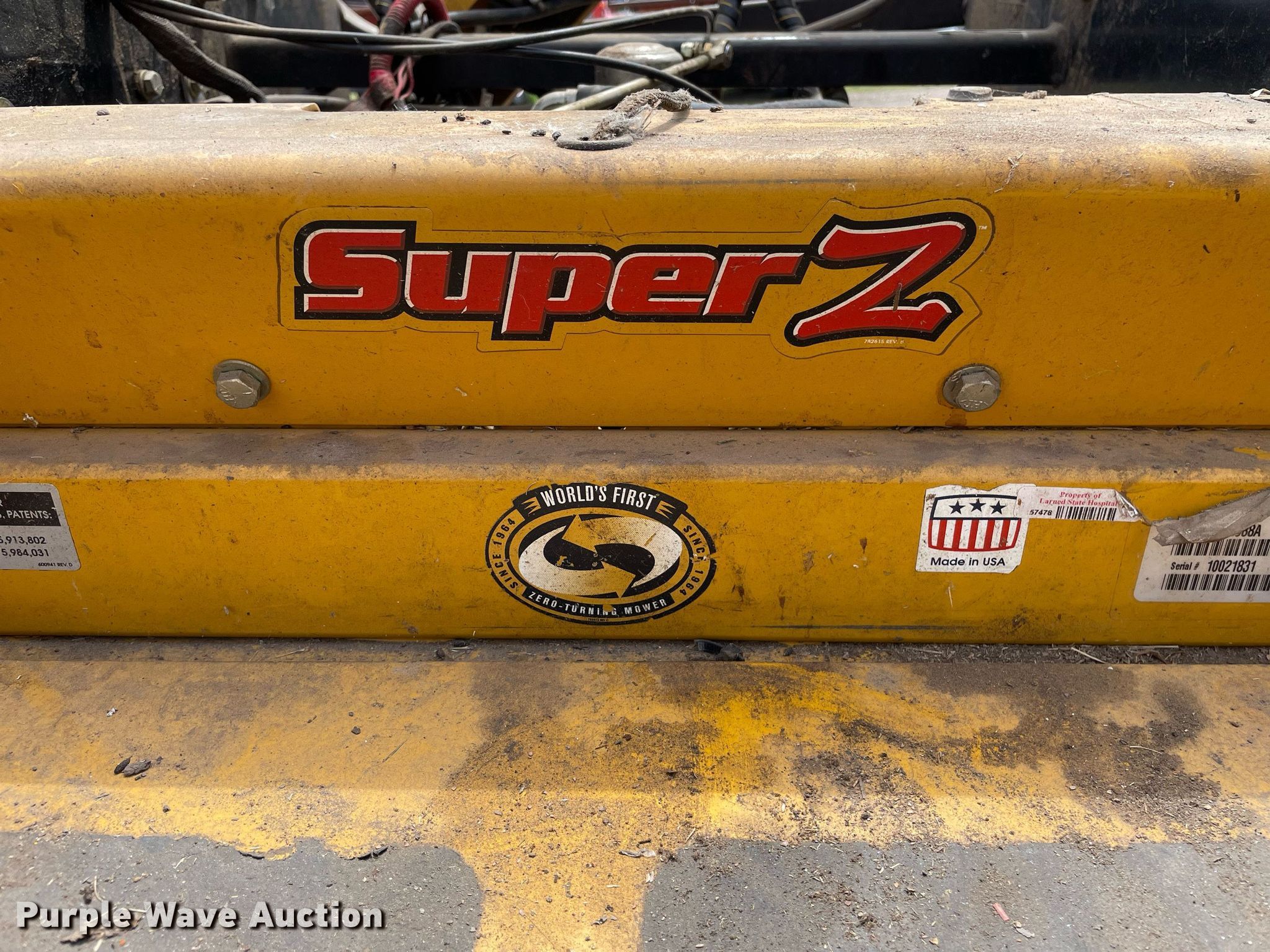 (2) Hustler Super Z ZTR lawn mowers. Hustler Super Z. Hours: 1,831 on meter, Cutting width: 60", Serial: 10021832. Engine Kohler, Displacement: 725 cc, Cylinders: 2, Fuel type: Gas. Transmission Hydrostatic. Tires Front: 14x6.50-6, Rear: 24x12.00-12. Notes (2) Bac-Vacs, Seat missing, Blades missing, Unknown operating condition. Hustler Super Z Hours: 1,365 on meter, Cutting width: 60", Serial: 10021831. Engine No engine. Transmission Hydrostatic. Tires Rear: 24x12.00-12. Notes Parts missing, Engine missing, (3) tires missing, Non-operational unit. Larned State Hospital. 1301 KS-264. Larned, KS 67550