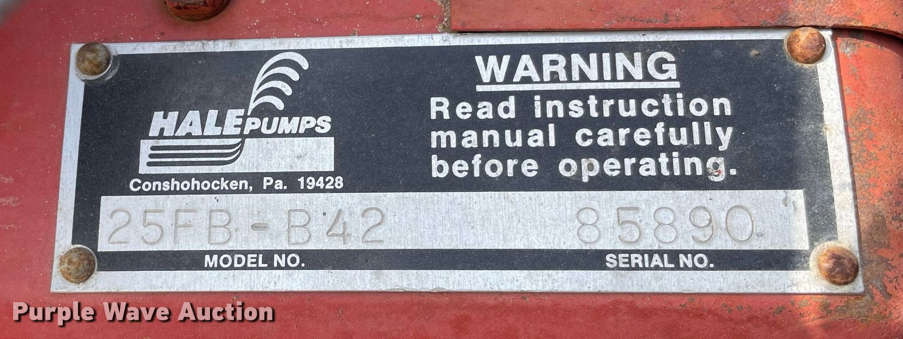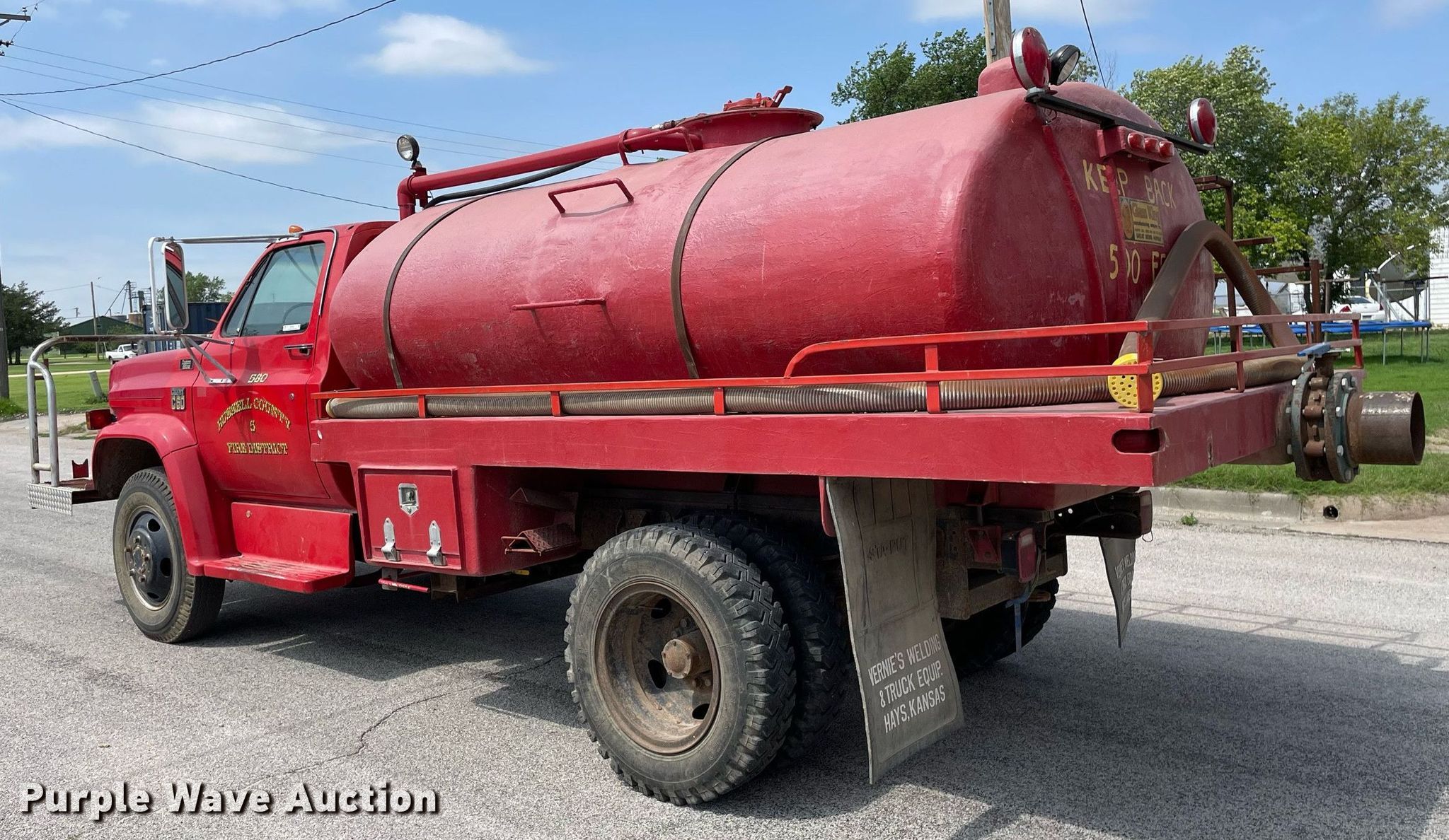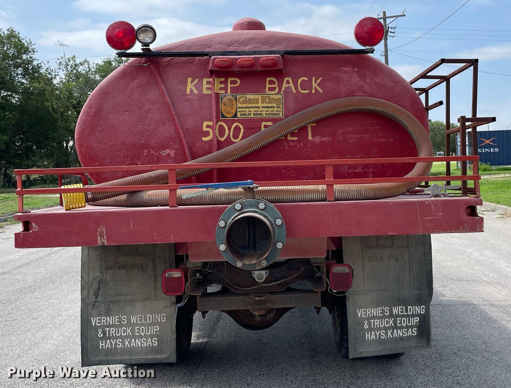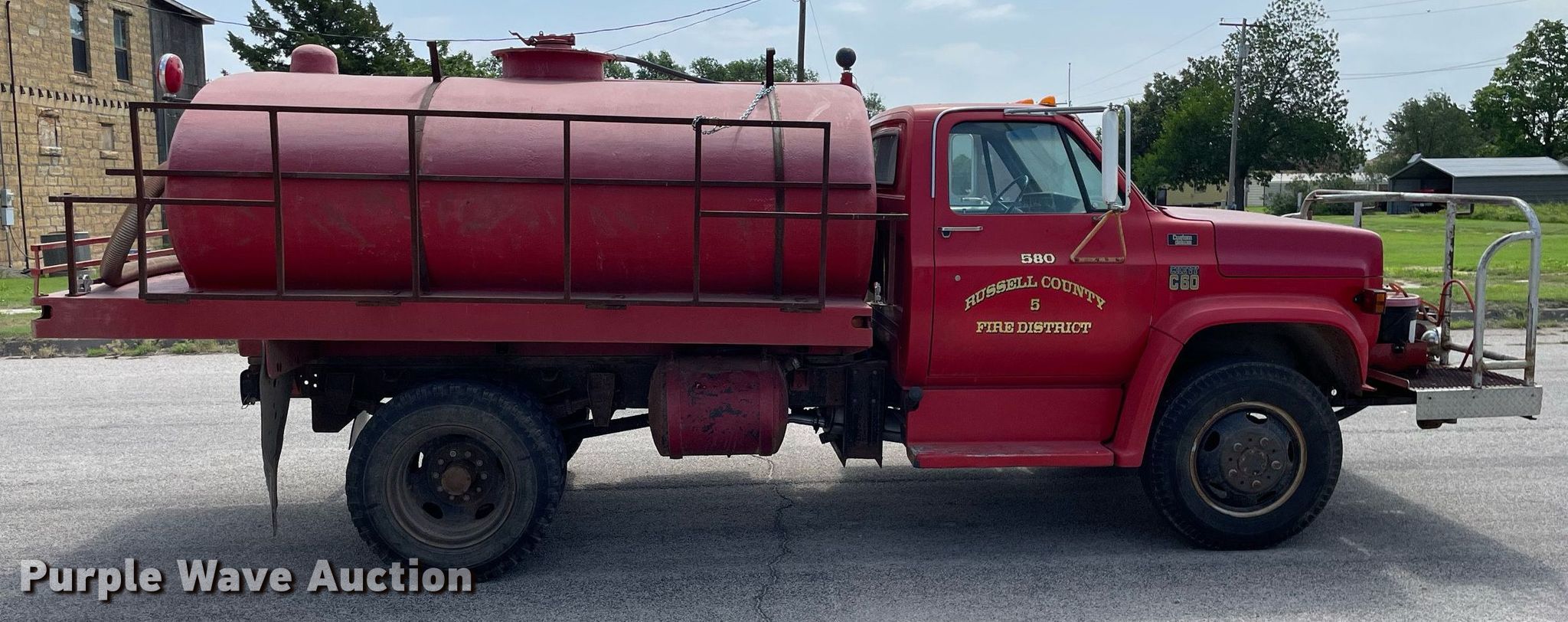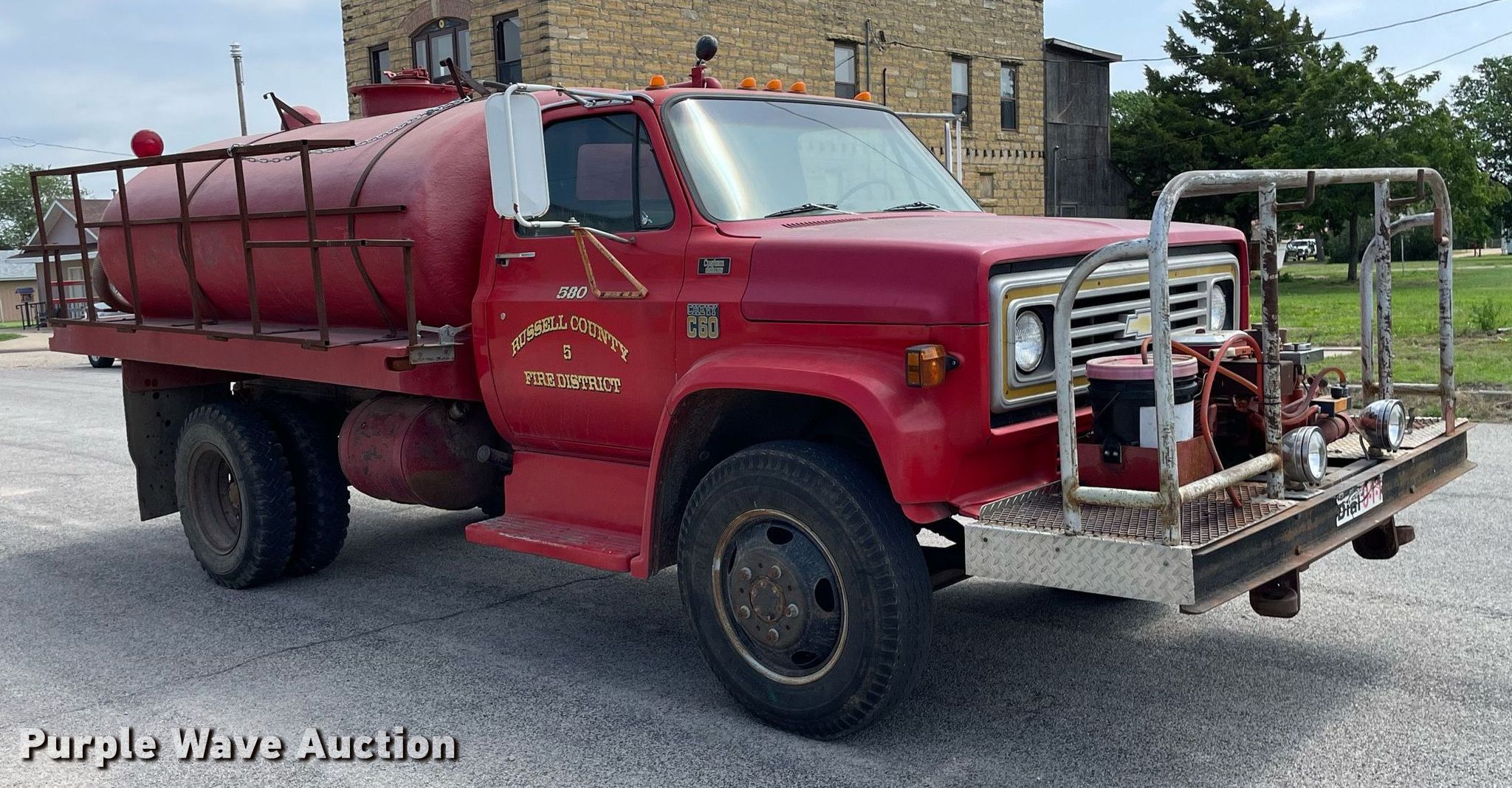 1976 Chevrolet C60 tanker fire truck. Miles: 74,466 on odometer, VIN: CCE616V125505. Engine Cylinders: 8, Fuel type: Gas. Transmission Manual, Speed: 4, plus 2. Chassis Axles: Single, Suspension: Spring, Brakes: Hydraulic, GVWR: 19,200 lbs. Interior Heat. Features Tank Capacity: 1,800 gallons, Fill pump Gorman Rupp, Front mounted pump Hale 25FB-B42, Engine Briggs & Stratton, Displacement: 694 cc, Cylinders: 2, Fuel type: Gas, HP: 18.. Tires Size: 8.25-20. Notes Dead battery, Unknown operating condition of front mounted pump. Kansas title. Title distribution may be delayed up to 14 days from verification of funds. Russell County. 850 Elm St. Bunker Hill, KS 67626