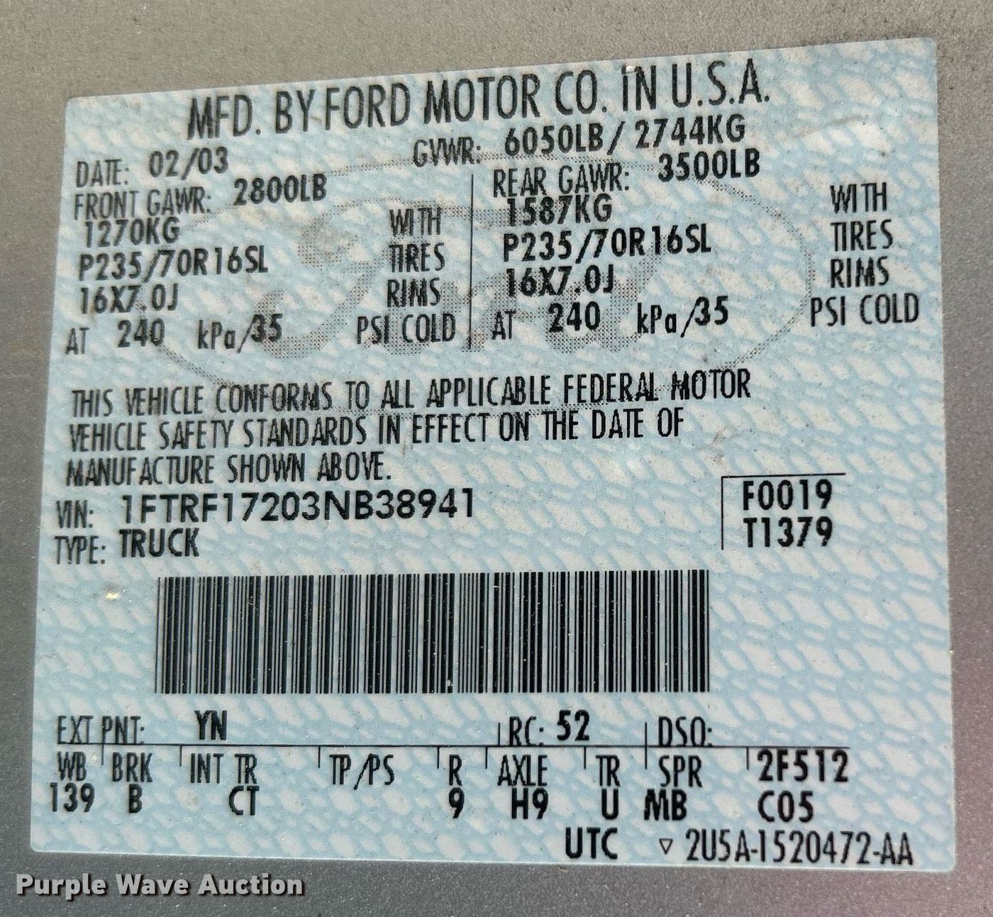 Purple Wave is selling a used 1/2 Ton Pickup or Van in Oklahoma. This item is a 2003 Ford F150 XL pickup truck with the following: Miles: 72,214 on odometer, VIN: 1FTRF17203NB38941, Unit #: 187