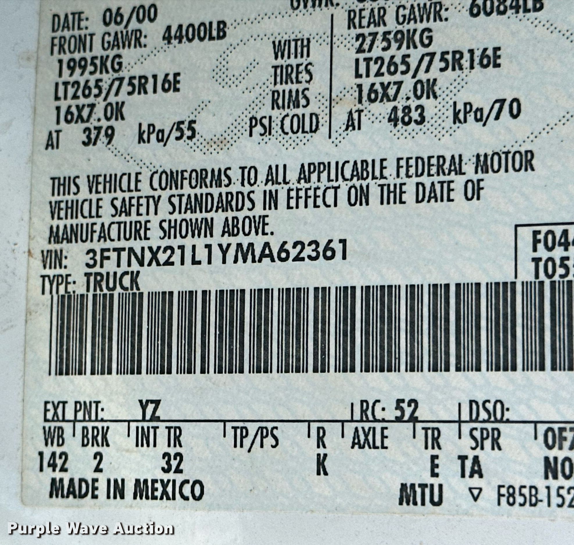 - VIN: 3FTNX21L1YMA62361