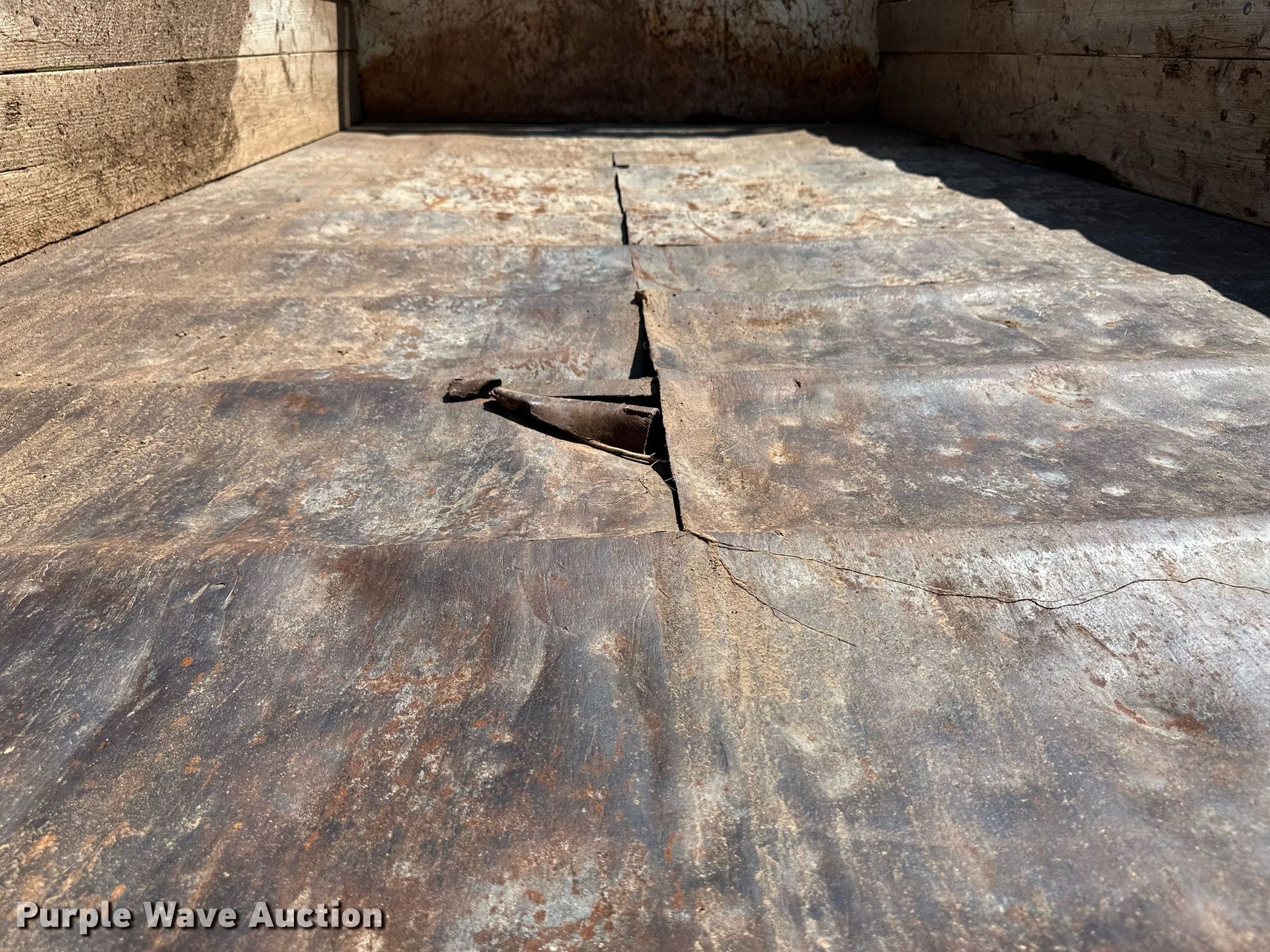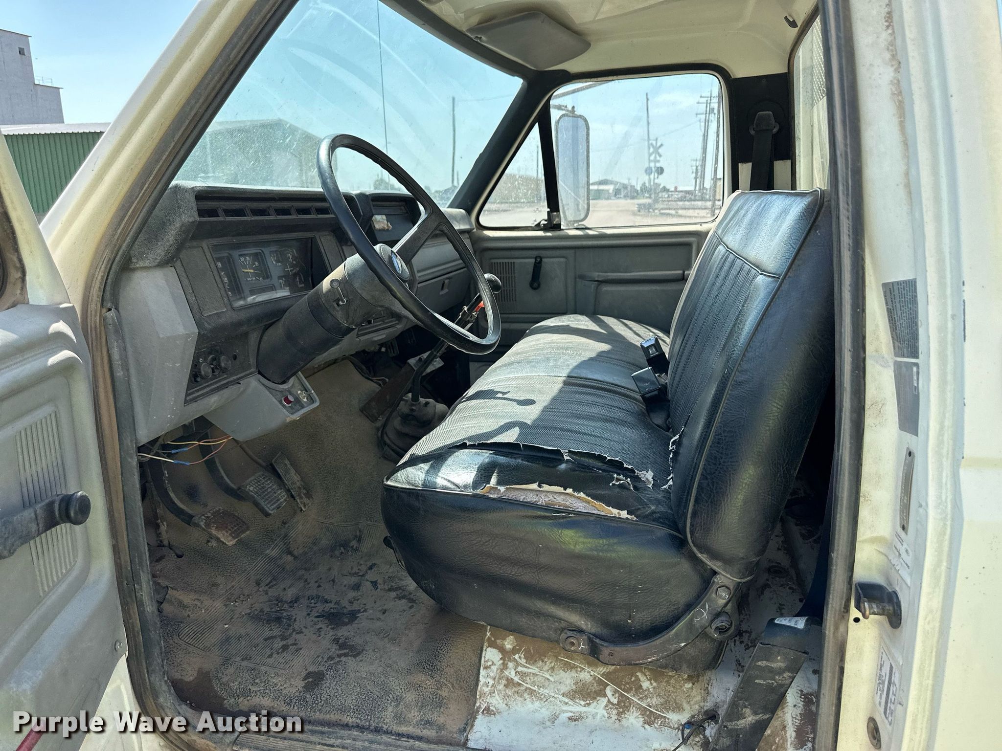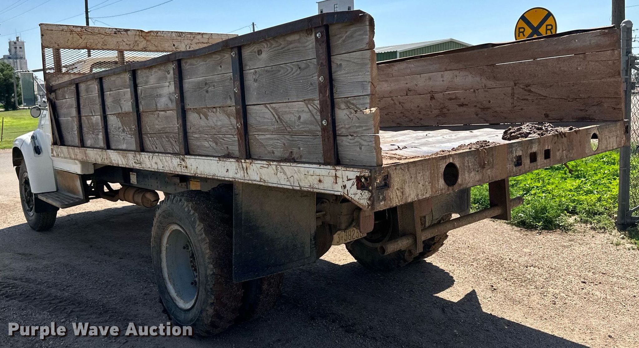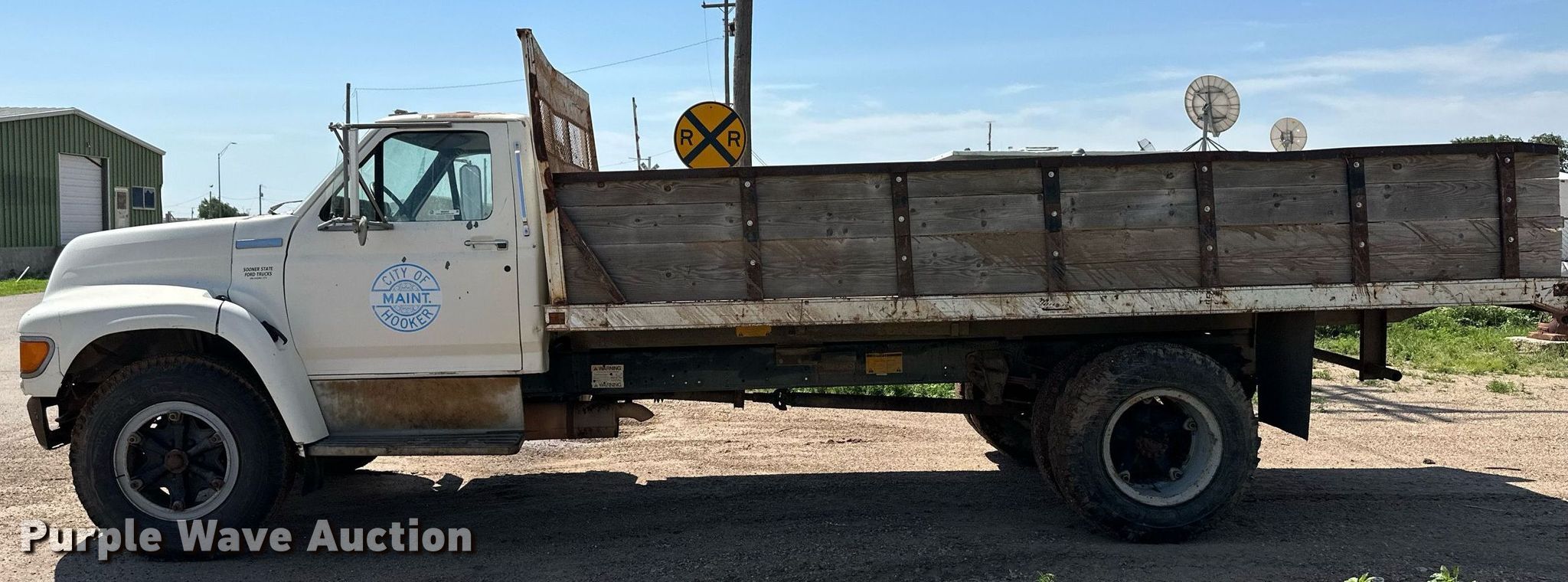 1995 Ford F700 dump flatbed truck. Miles: 23,327 on odometer, VIN: 1FDNF70J6SVA44009. Engine Displacement: 7.0L, Cylinders: 8, Fuel type: Gas. Transmission Manual, Speed: 5, plus 2. Chassis Axles: Single, Suspension: Spring, Brakes: Hydraulic, PTO, GVWR: 23,160 lbs. Interior Heat. Features Dump flatbed 16' 4" L x 96" W, Removable sides, Ram: Single. Tires Front: 9.00-20. Oklahoma title. City of Hooker, OK. 201 Ireland Street. Hooker, OK 73945