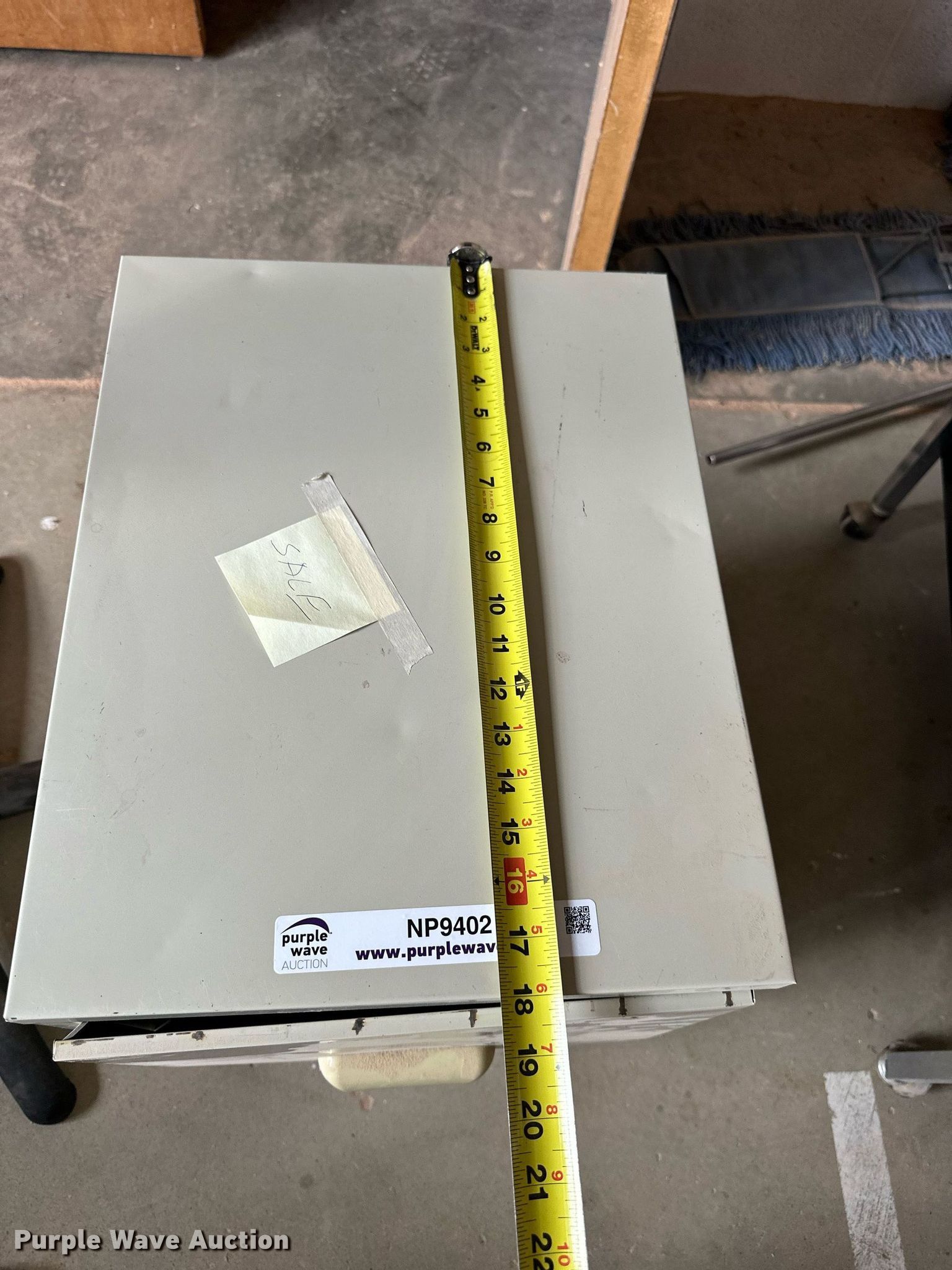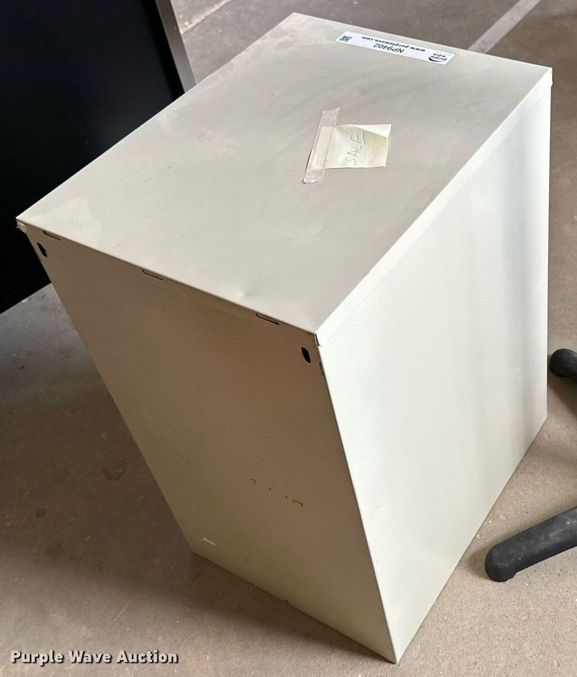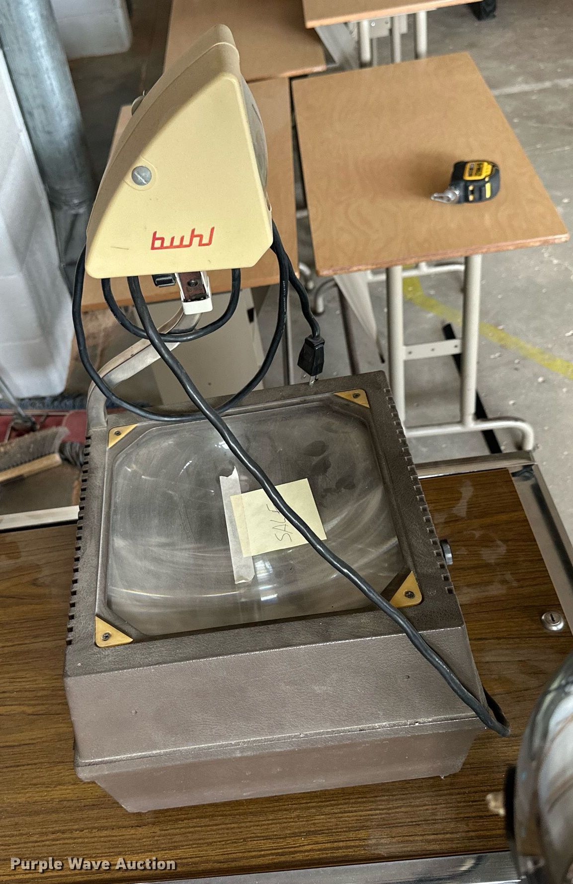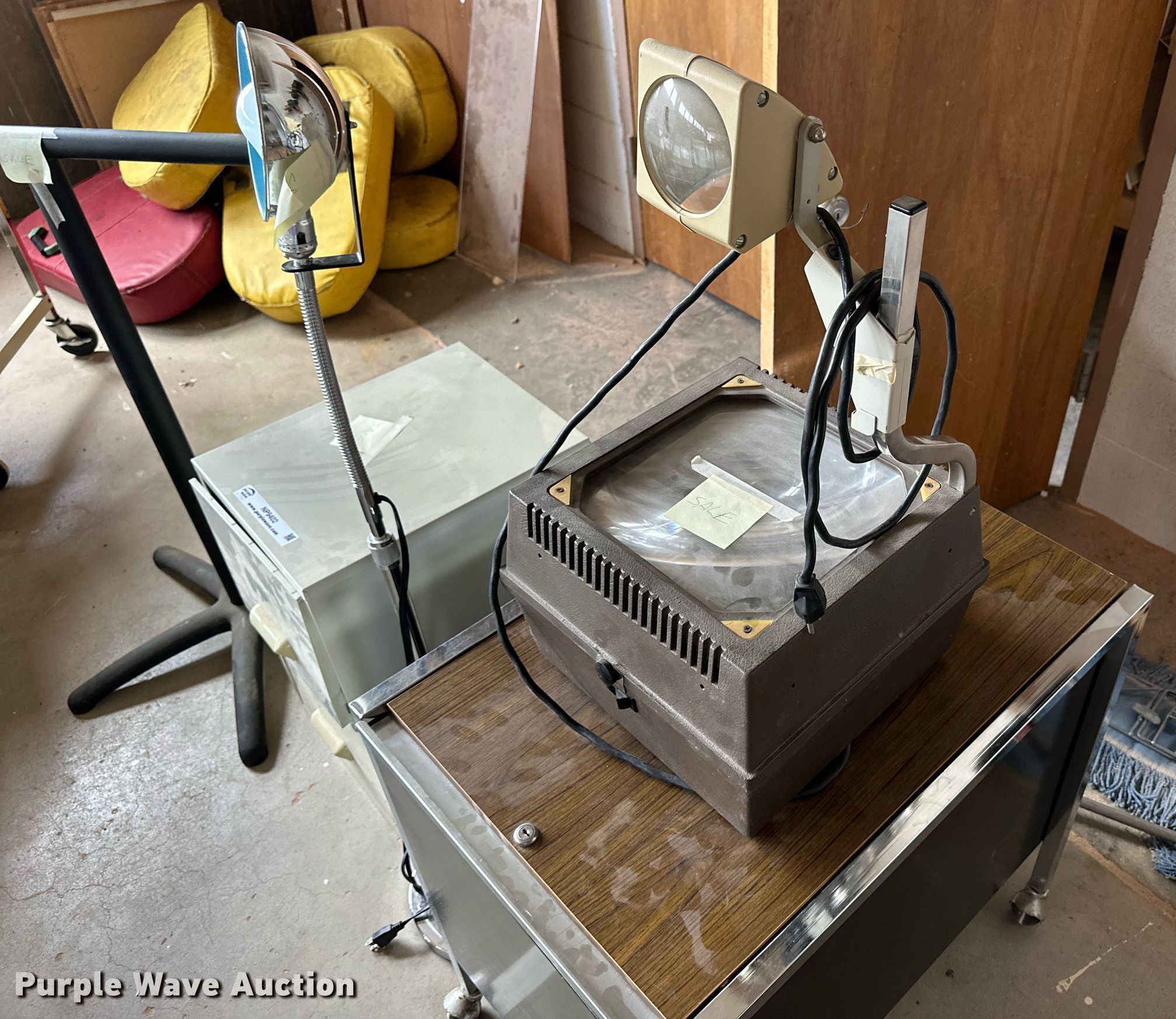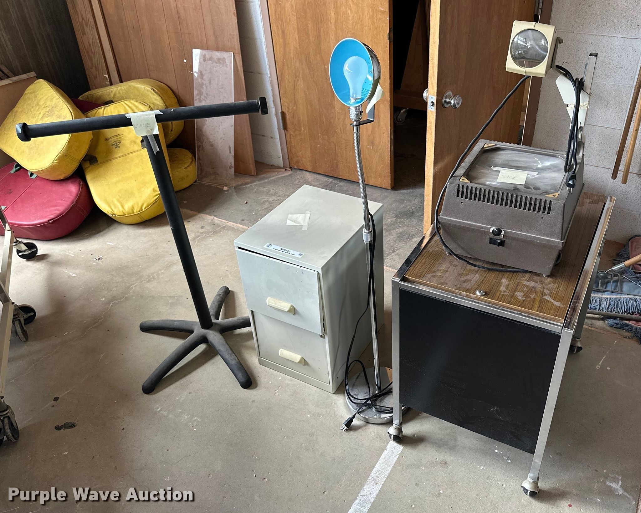 Purple Wave is selling a used Furniture in Kansas. This item is a Furniture with the following: Cabinet, 29" L x 20" W, Filing cabinet, 18" L x 15" W x 25" H, Buhl 90 overhead projector, Lamp, Art stand