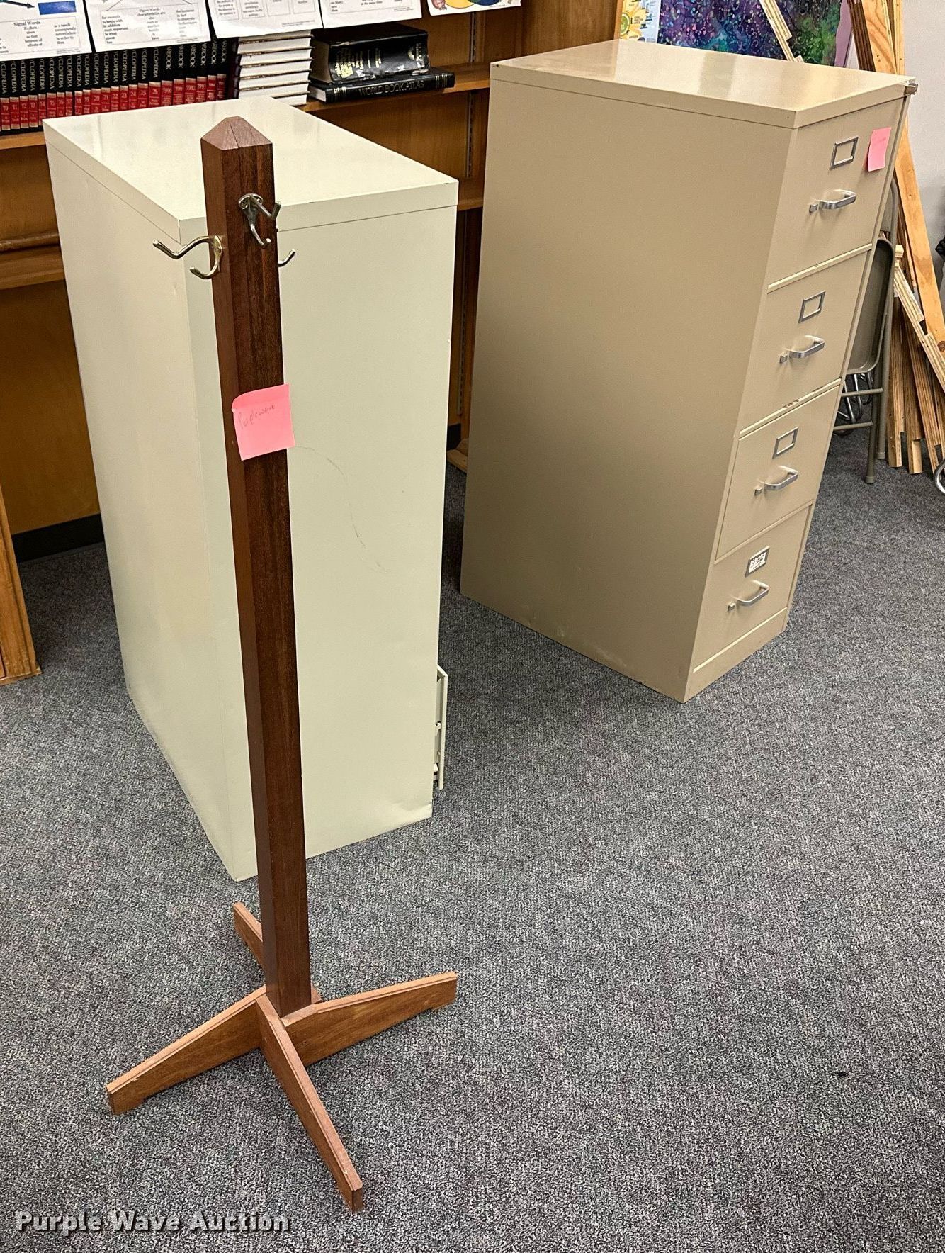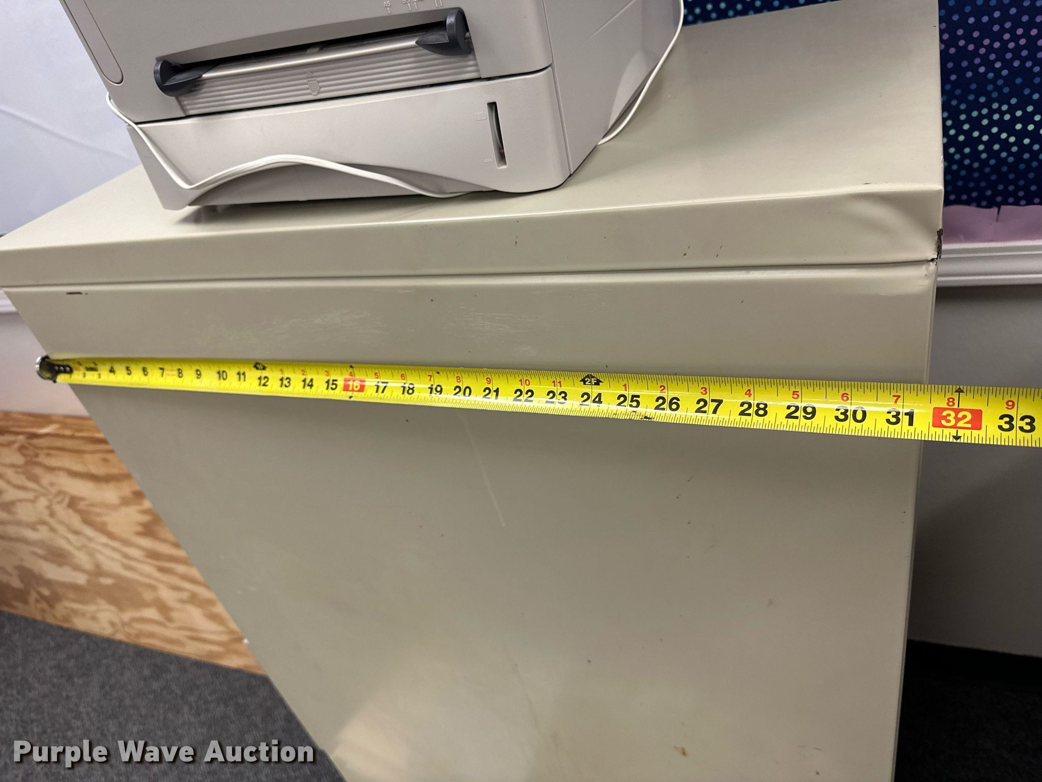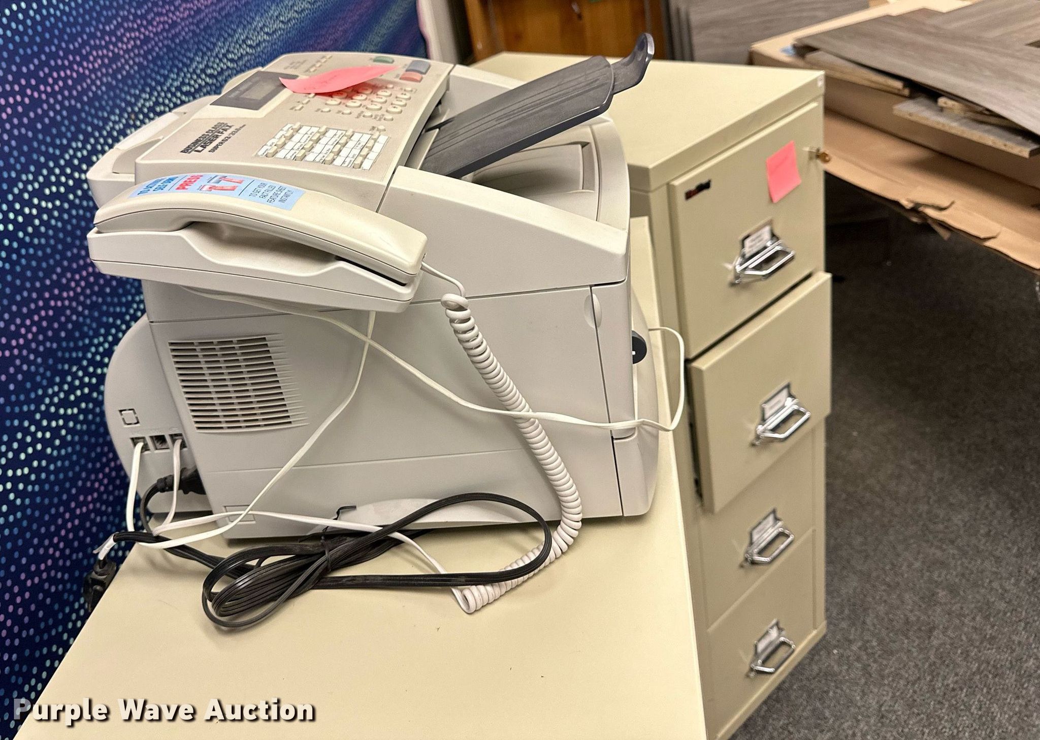 Purple Wave is selling a used Office Supplies and Equip. in Kansas. This item is a Office supplies with the following: (5) filing cabinets, Contents not included, Business Class Super G3 laser fax machine, 33.6kbps, Coat rack