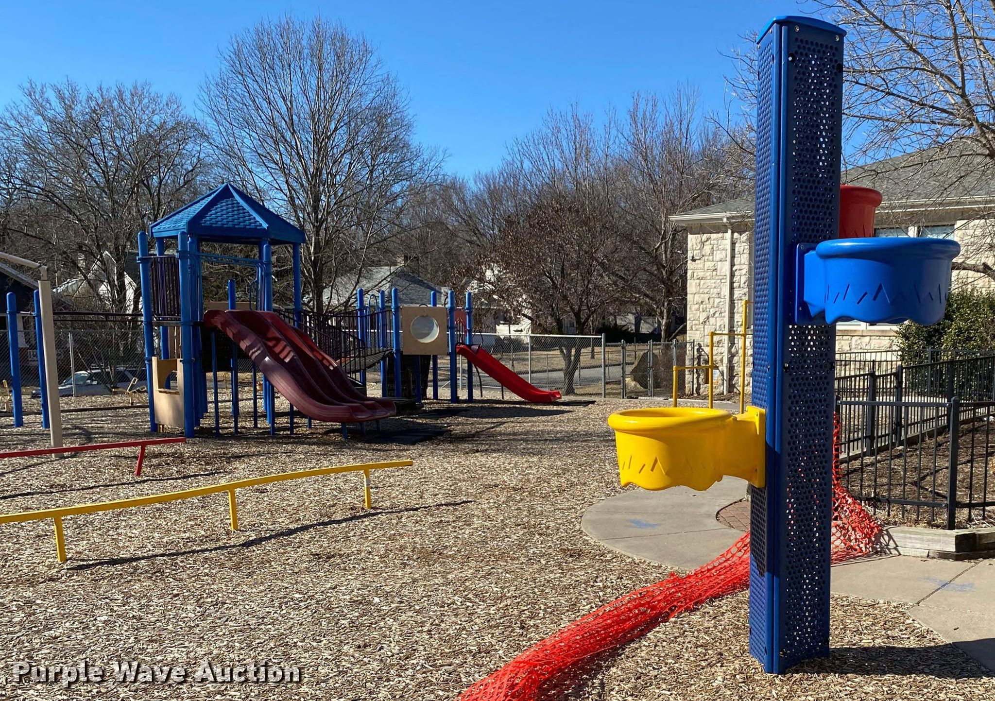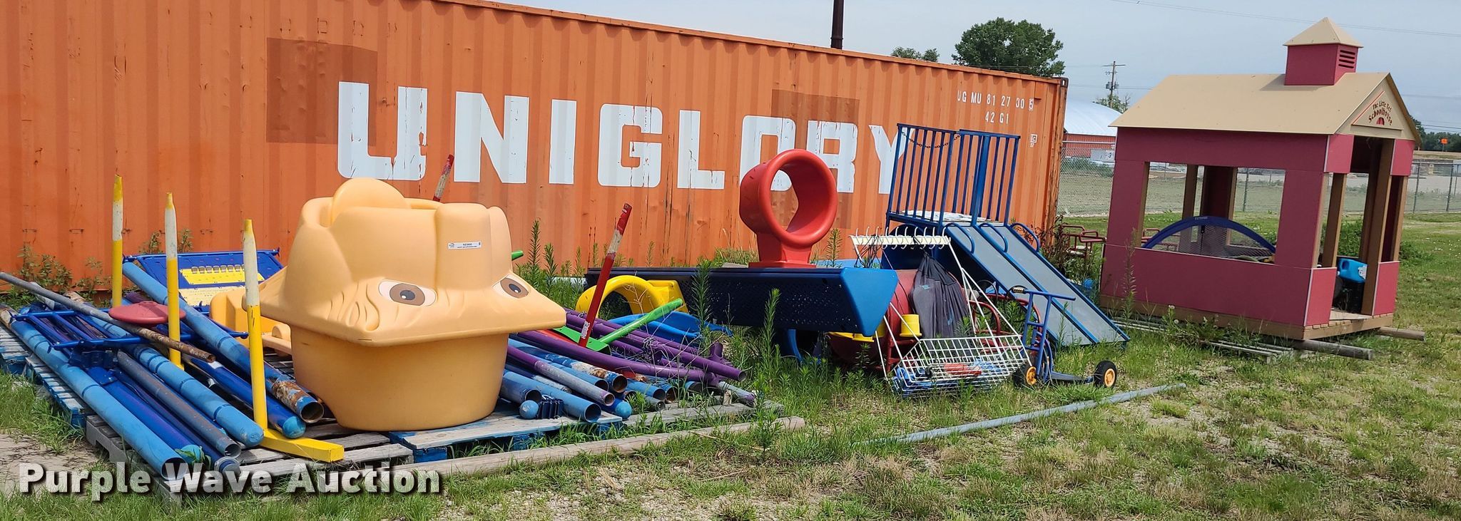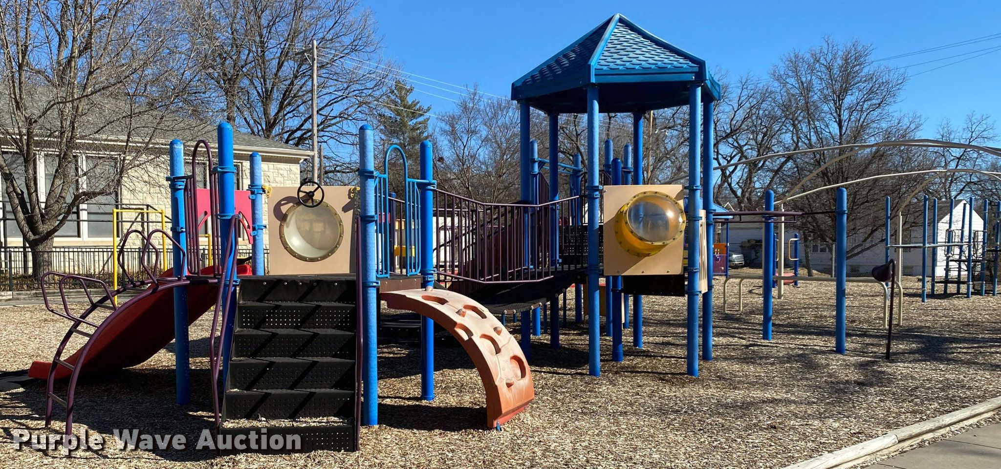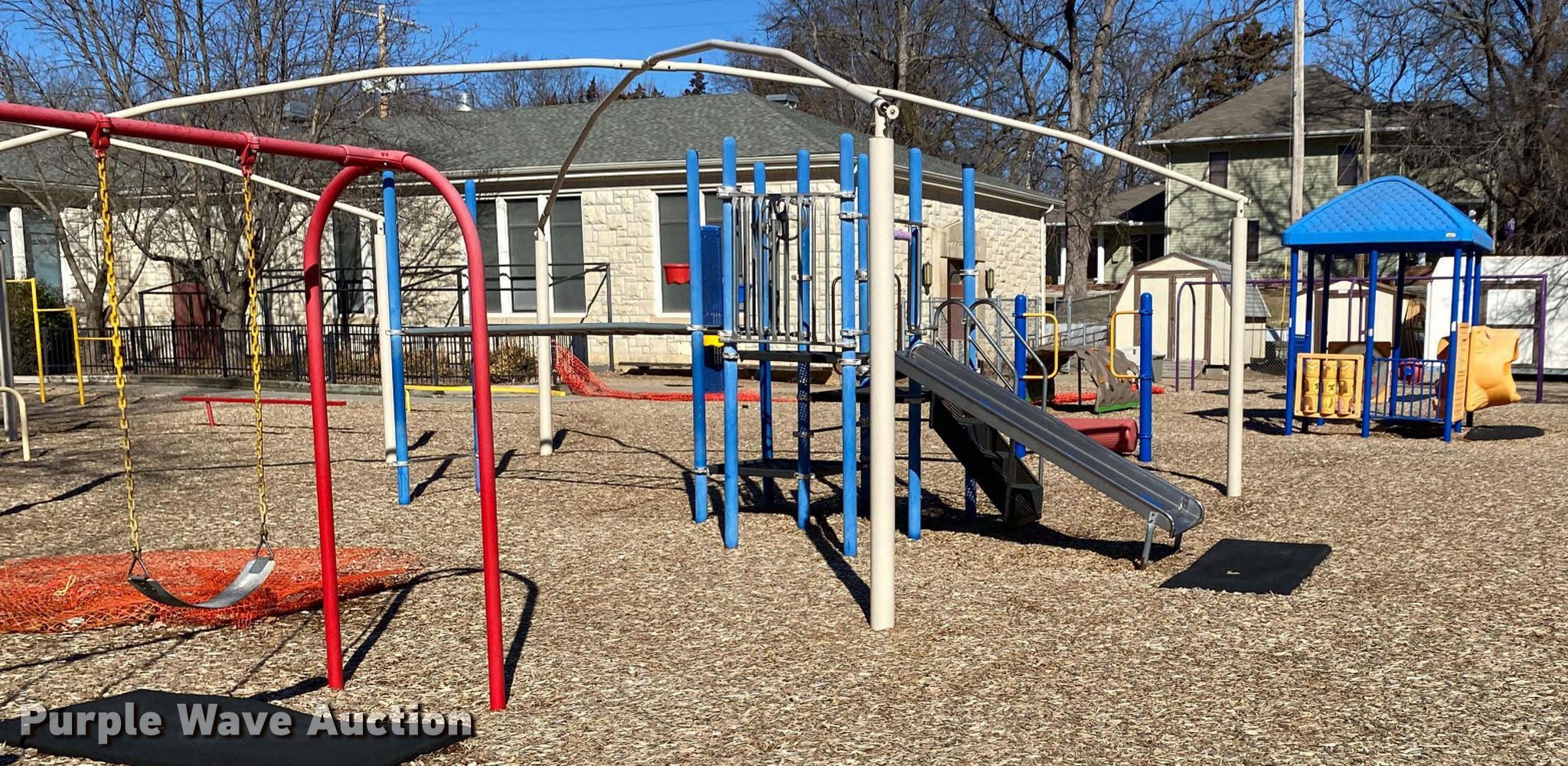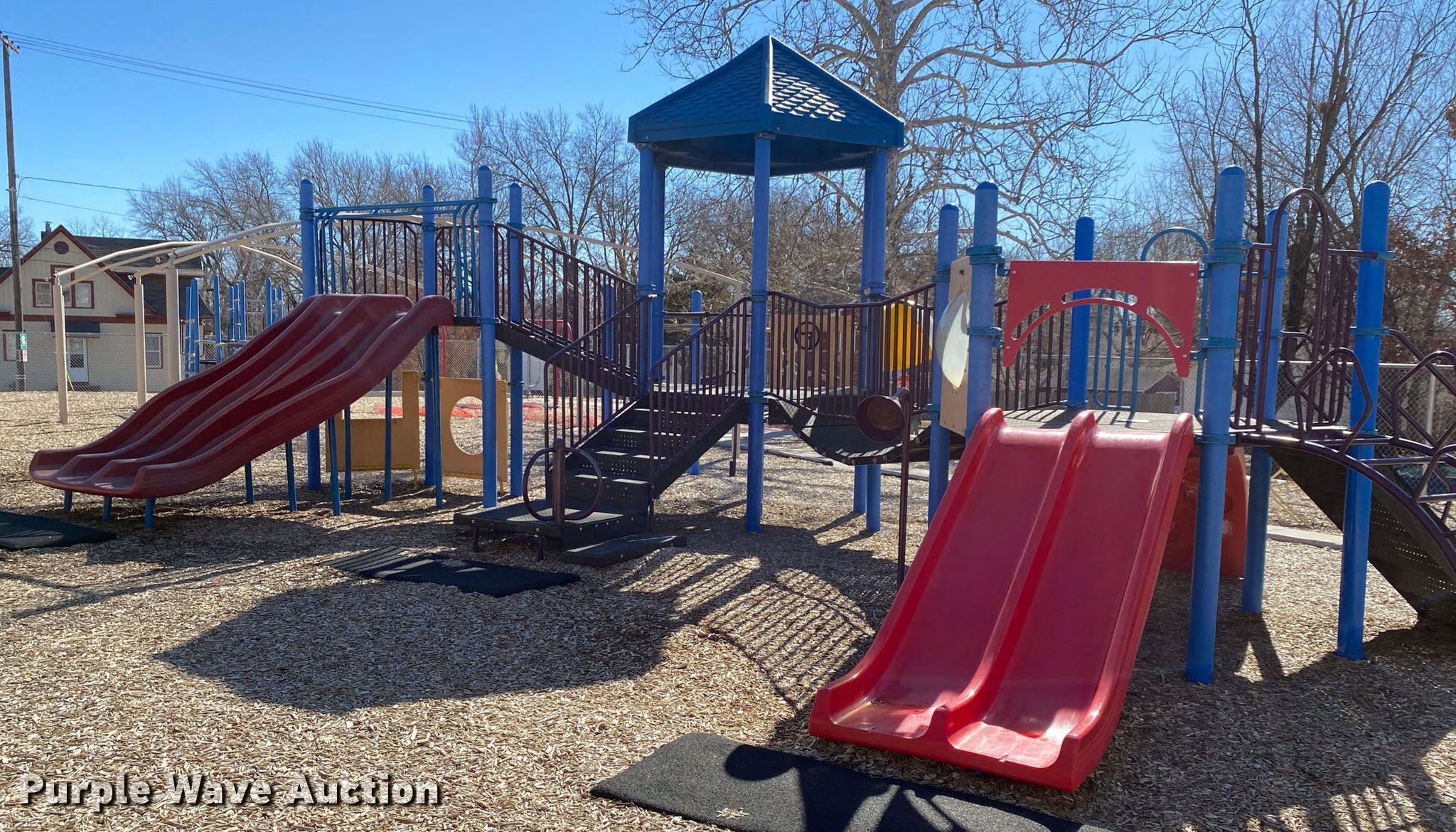 Purple Wave is selling a used Sporting Goods in Kansas. This item is a Playground equipment with the following: Slides, Playhouse, Basketball goal, Trike, Climbing wall, Toys, Merry-go-round and more