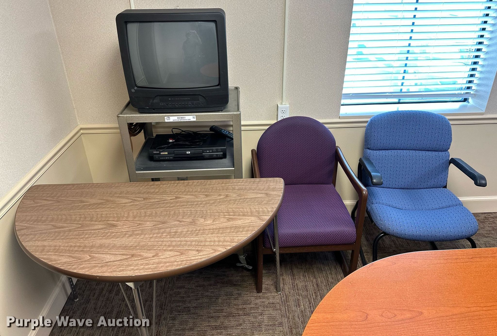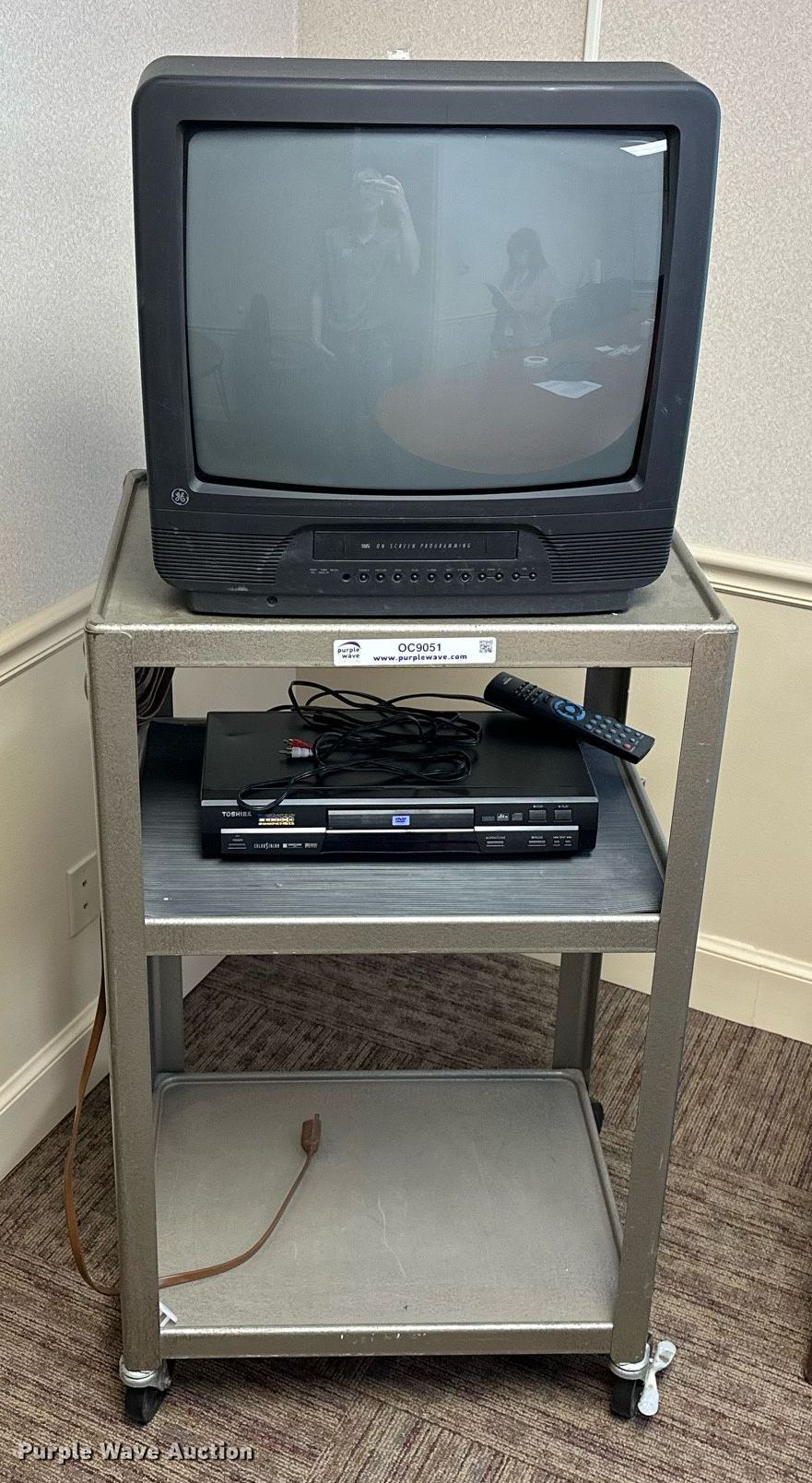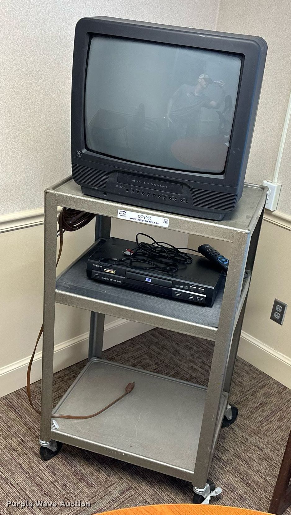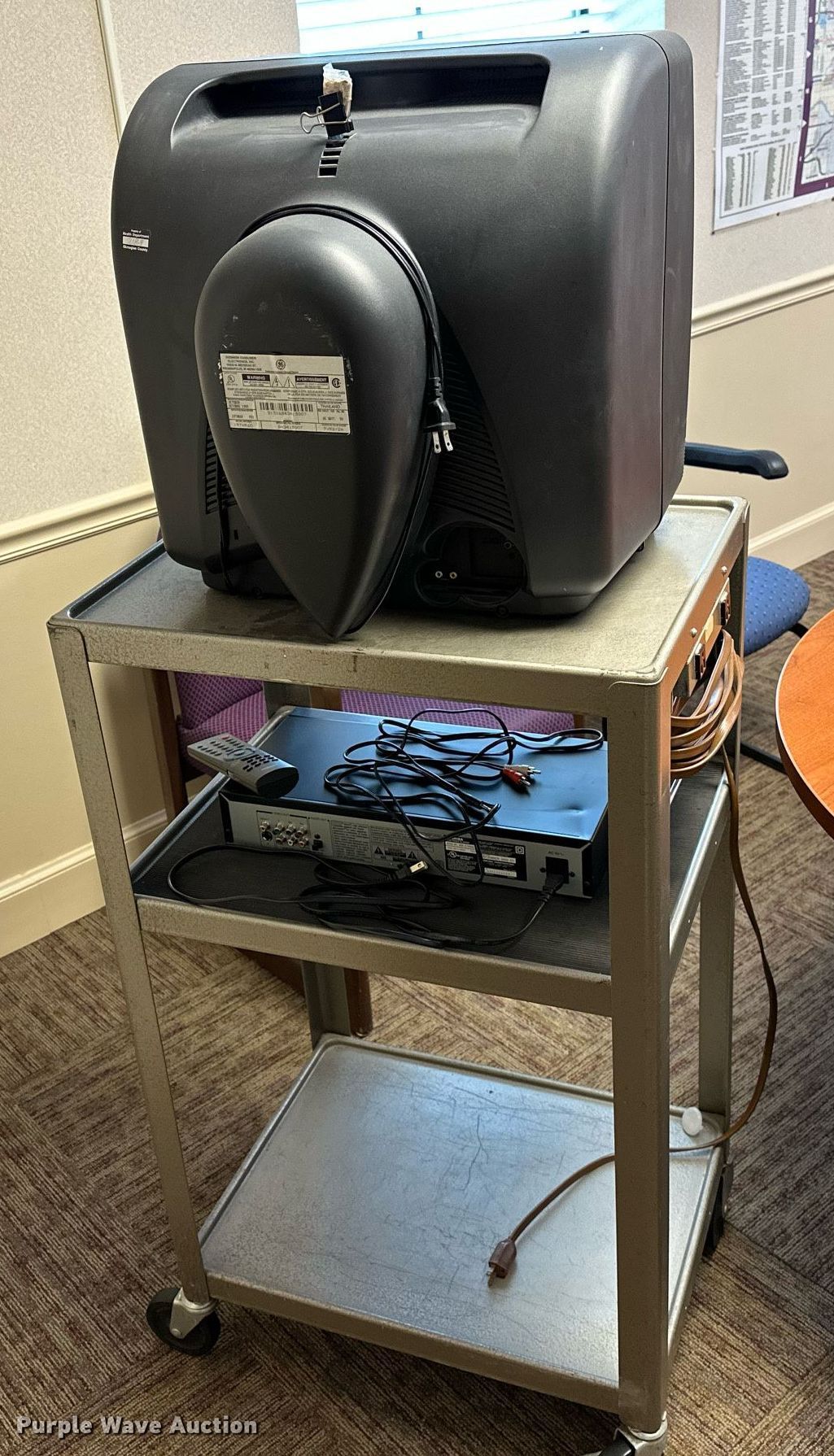 Purple Wave is selling a used Furniture in Oklahoma. This item is a Furniture with the following: GE television, Toshiba DVD player, Rolling cart, Table, (2) chairs