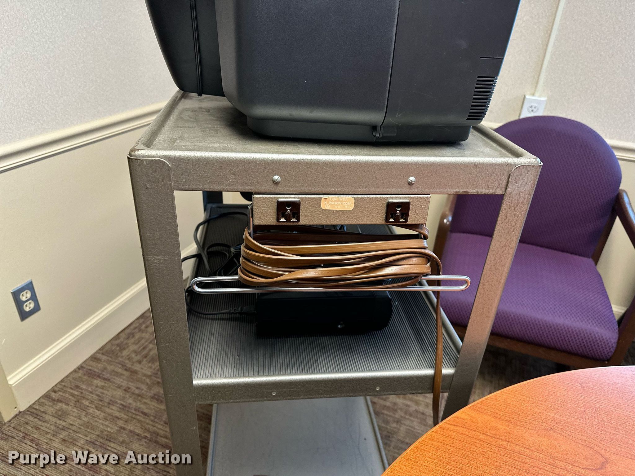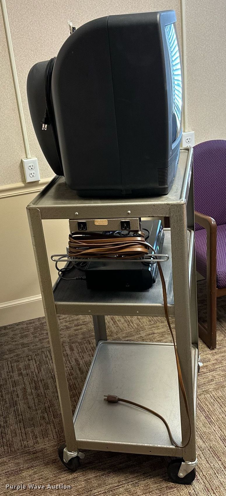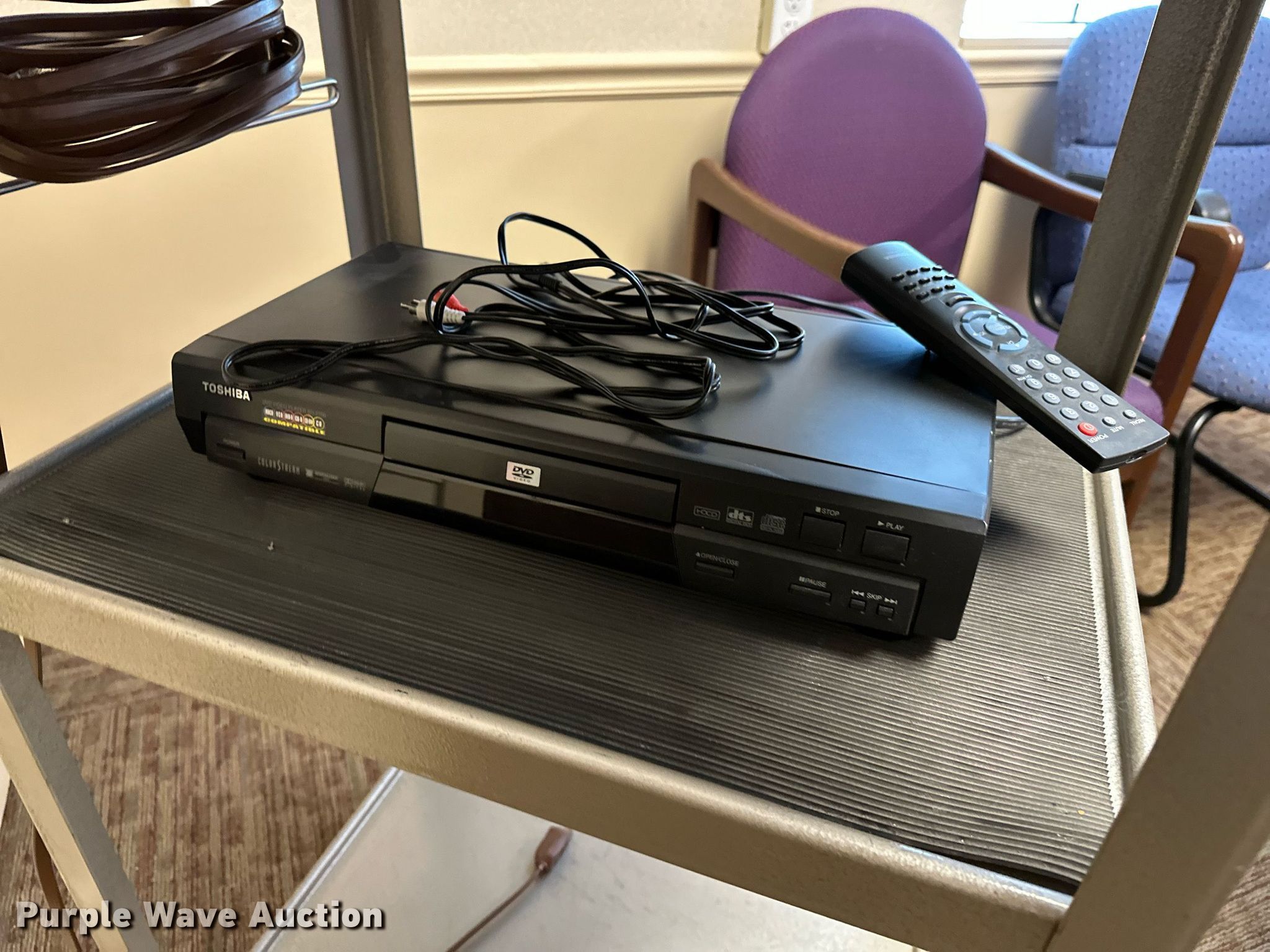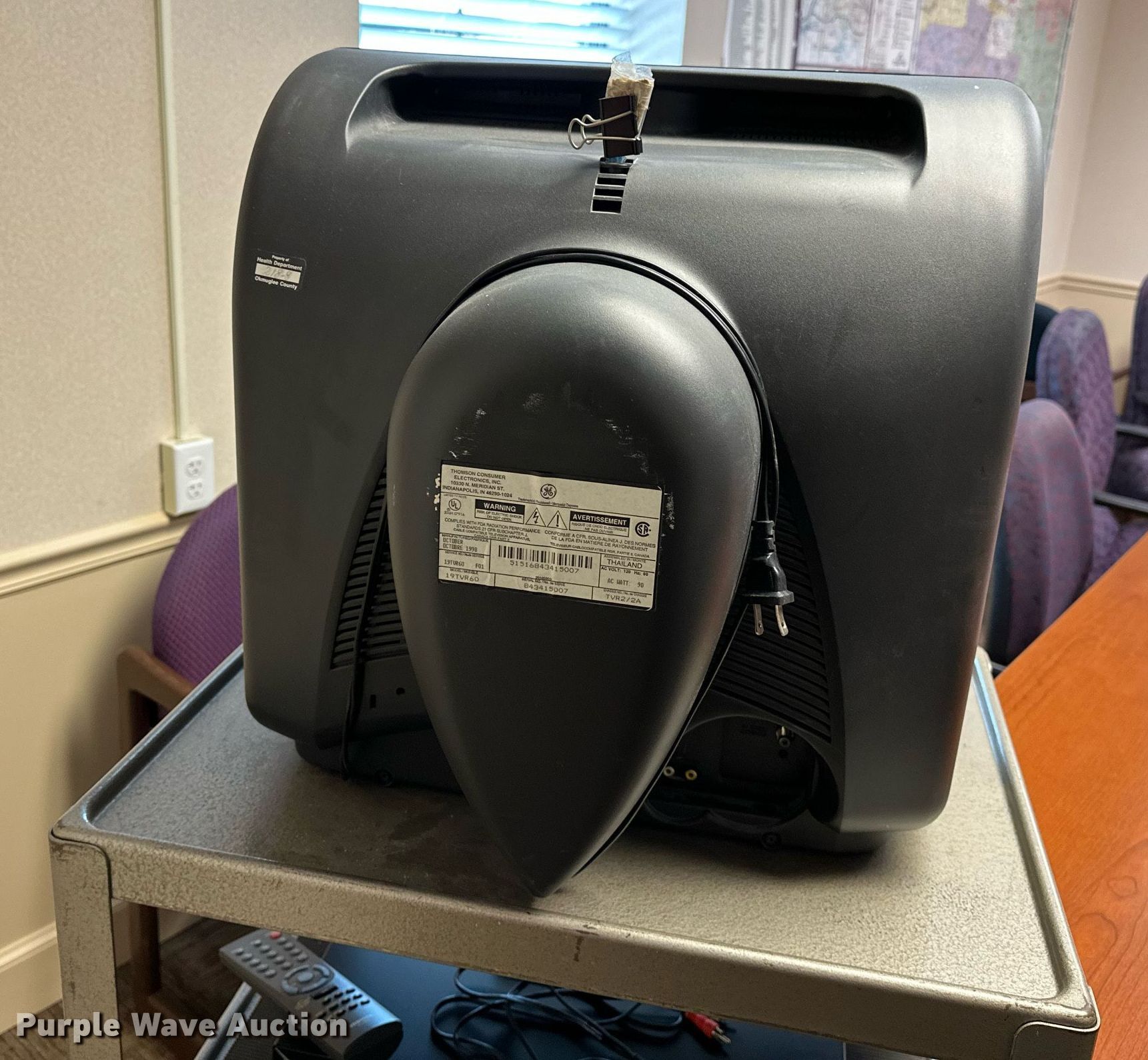 Purple Wave is selling a used Furniture in Oklahoma. This item is a Furniture with the following: GE television, Toshiba DVD player, Rolling cart, Table, (2) chairs