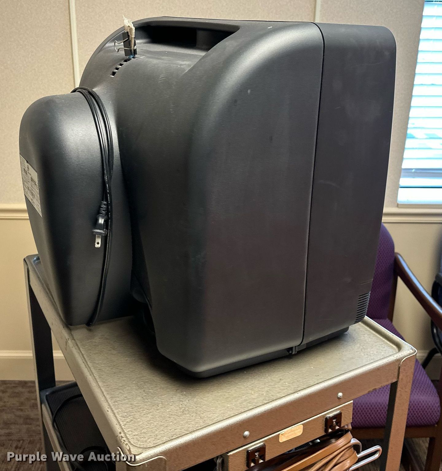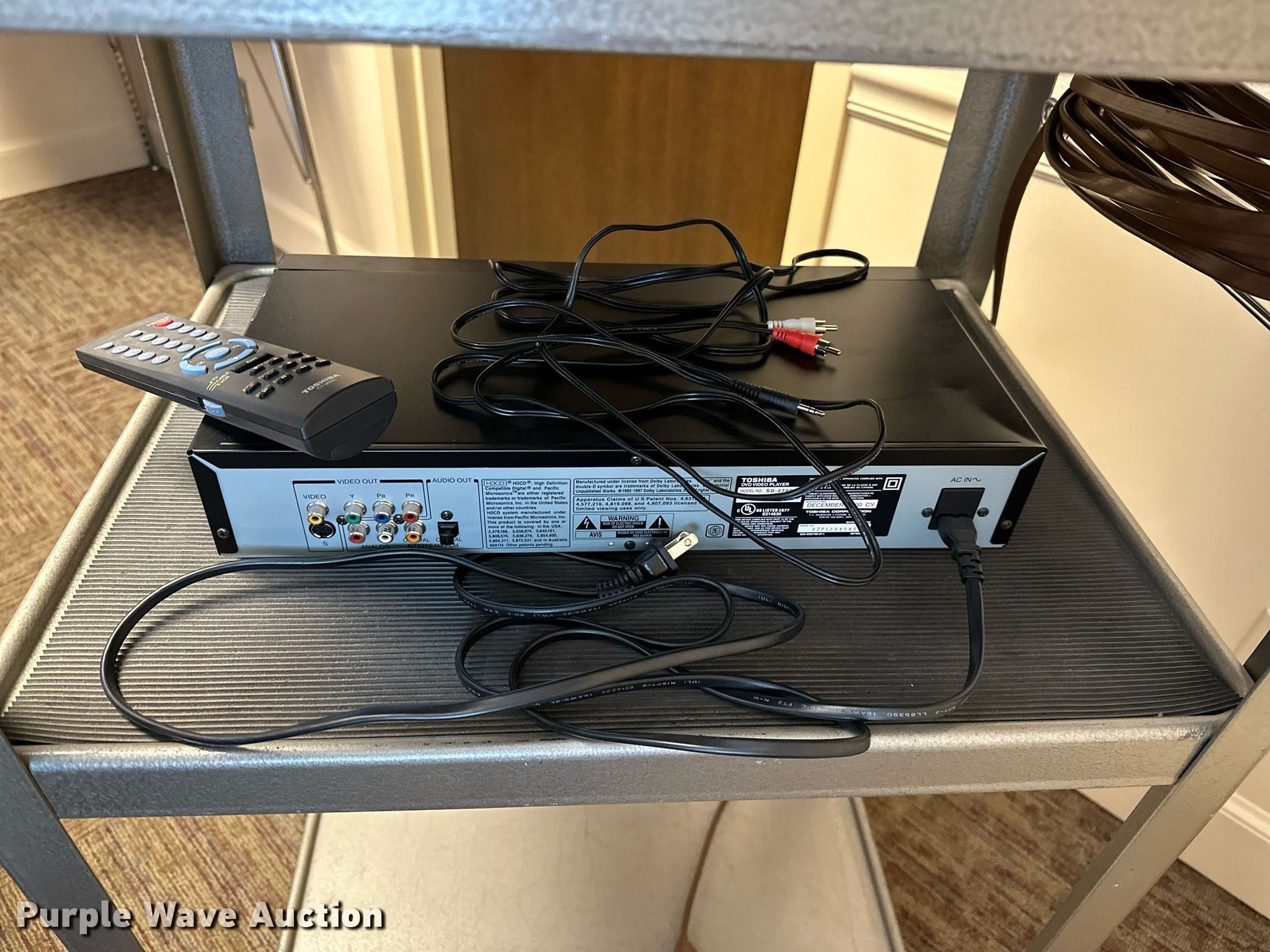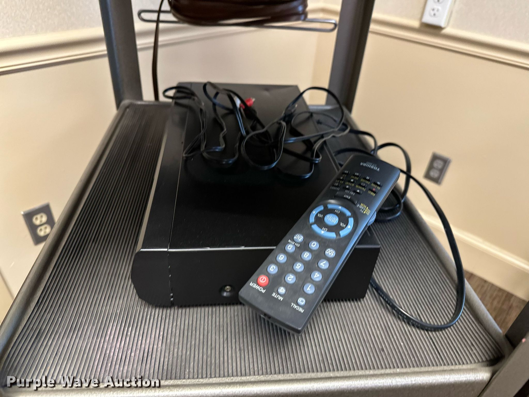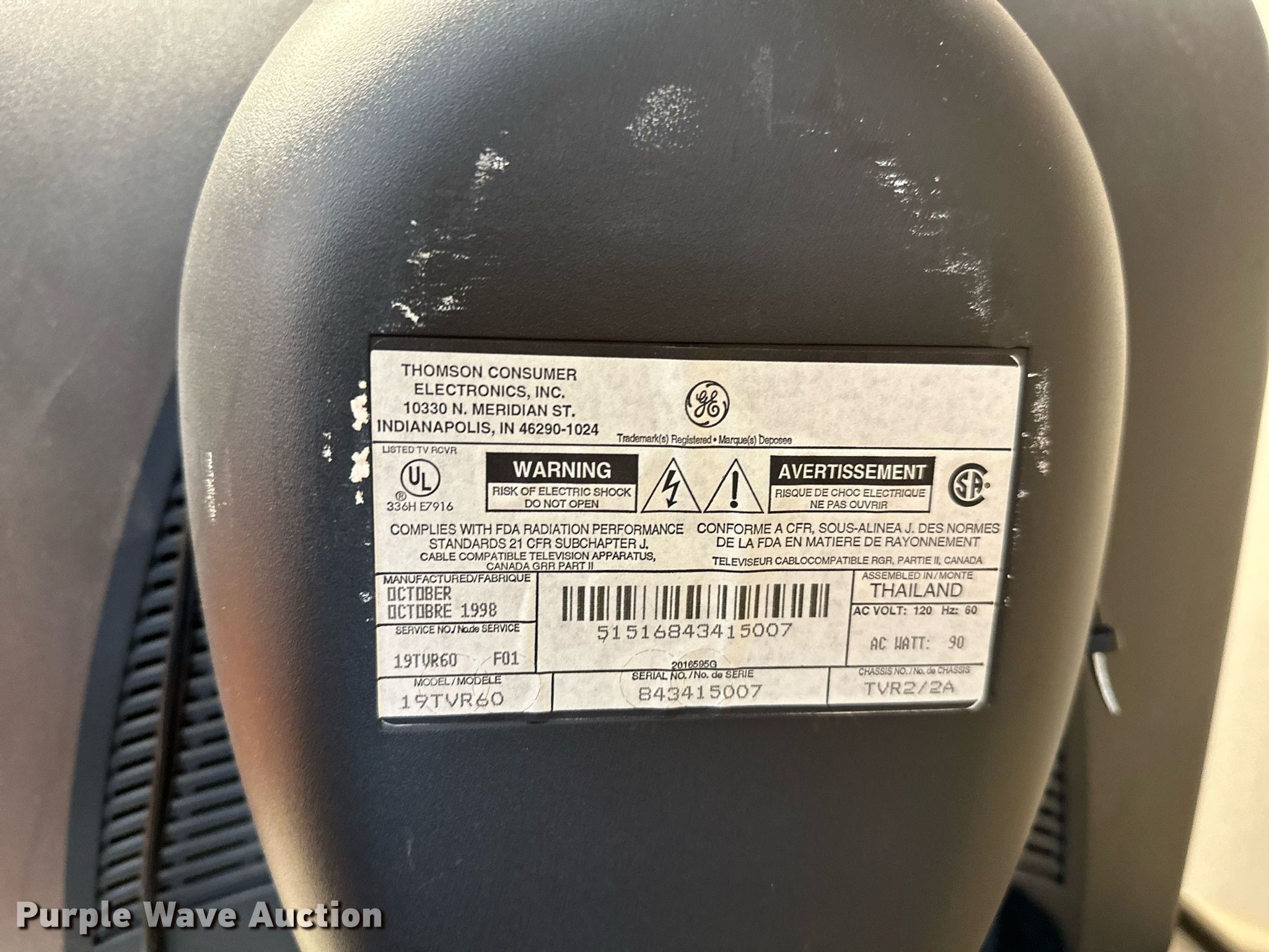 Purple Wave is selling a used Furniture in Oklahoma. This item is a Furniture with the following: GE television, Toshiba DVD player, Rolling cart, Table, (2) chairs