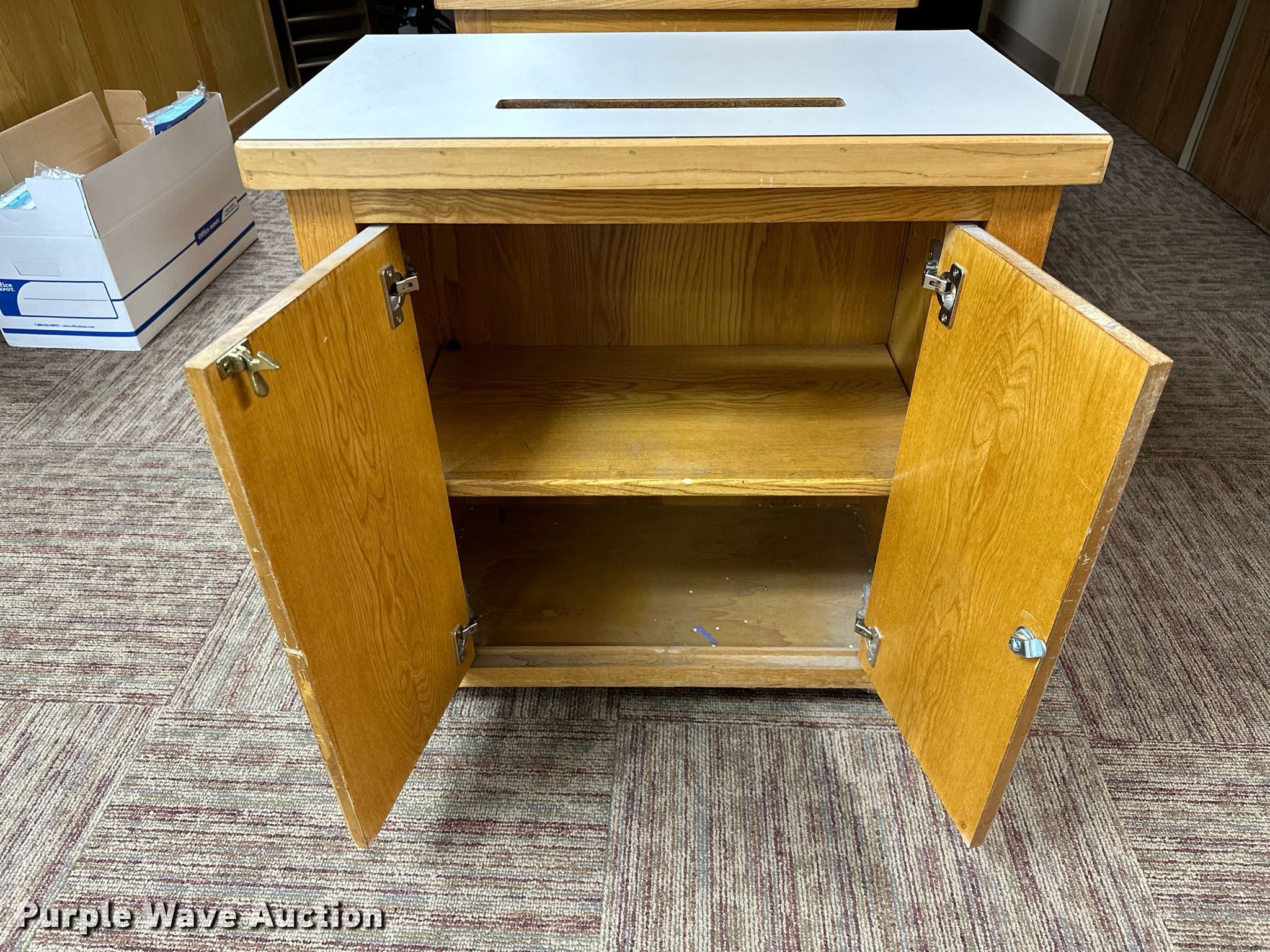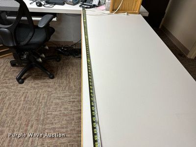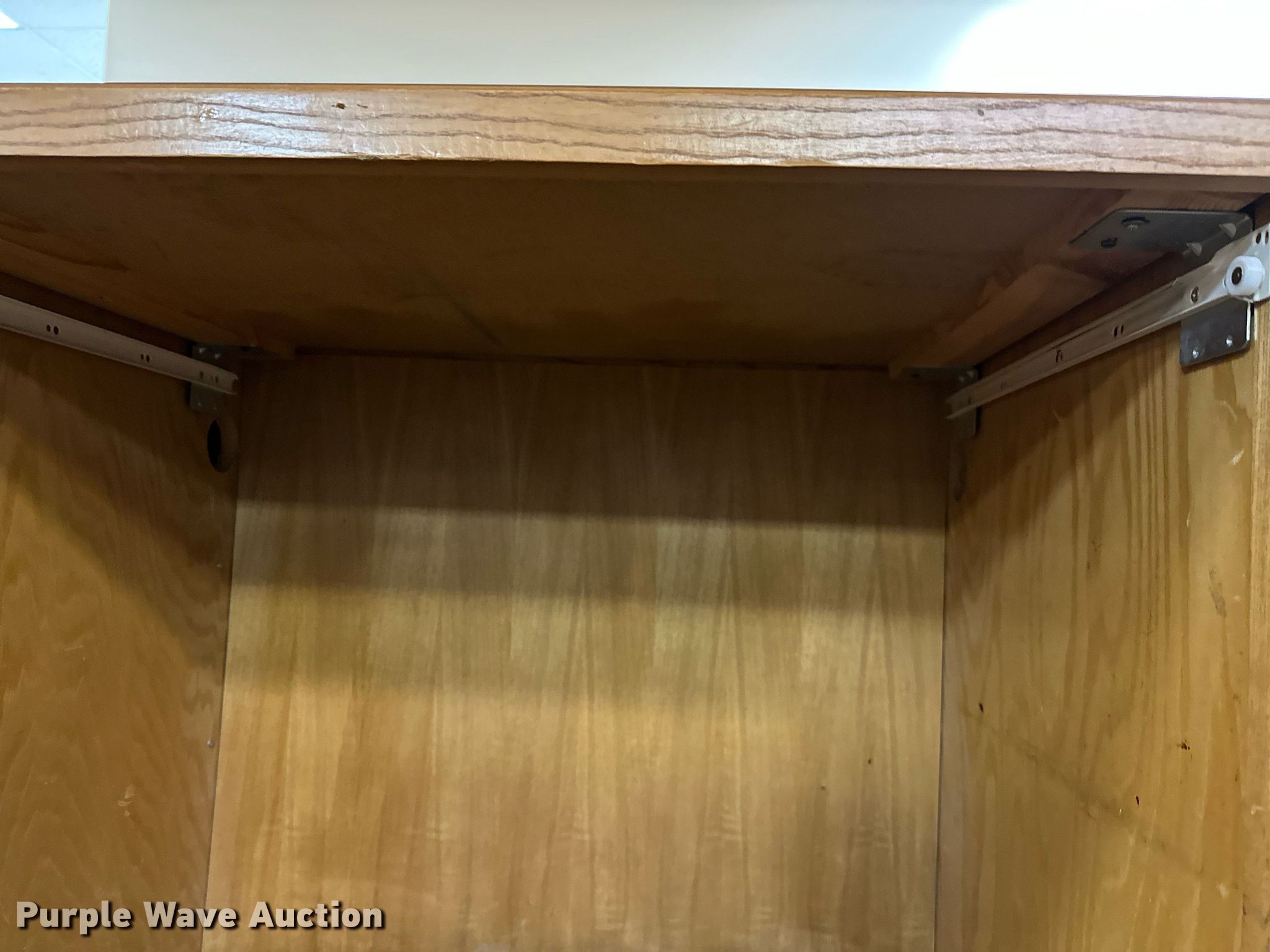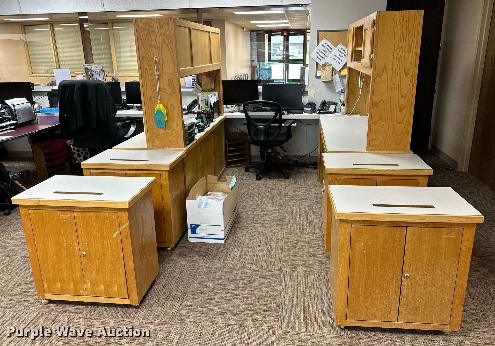 Purple Wave is selling a used Furniture in Oklahoma. This item is a Furniture with the following: (4) desks, Drawer missing, (4) two door cabinets