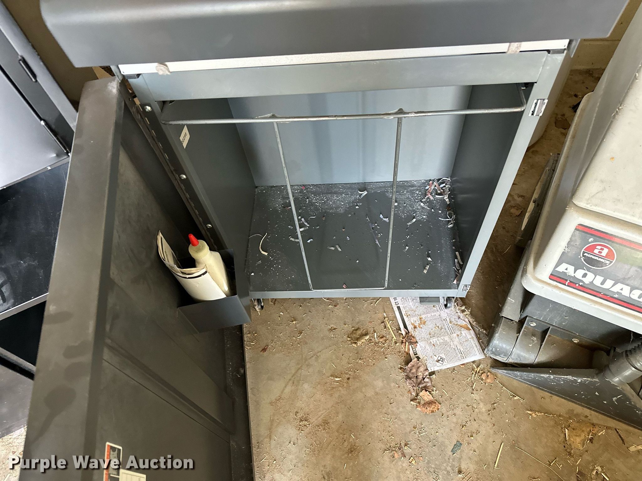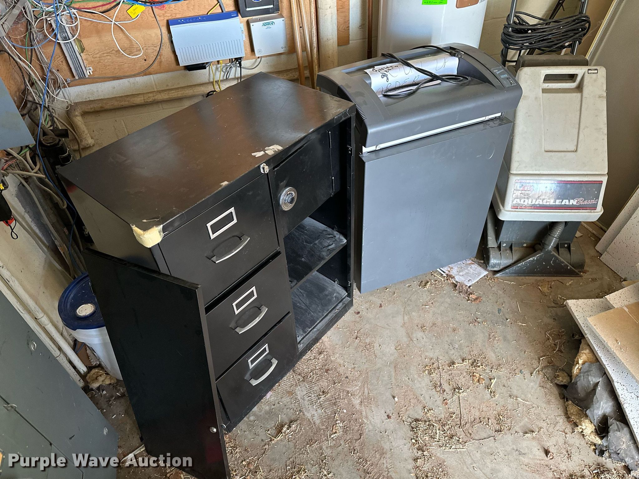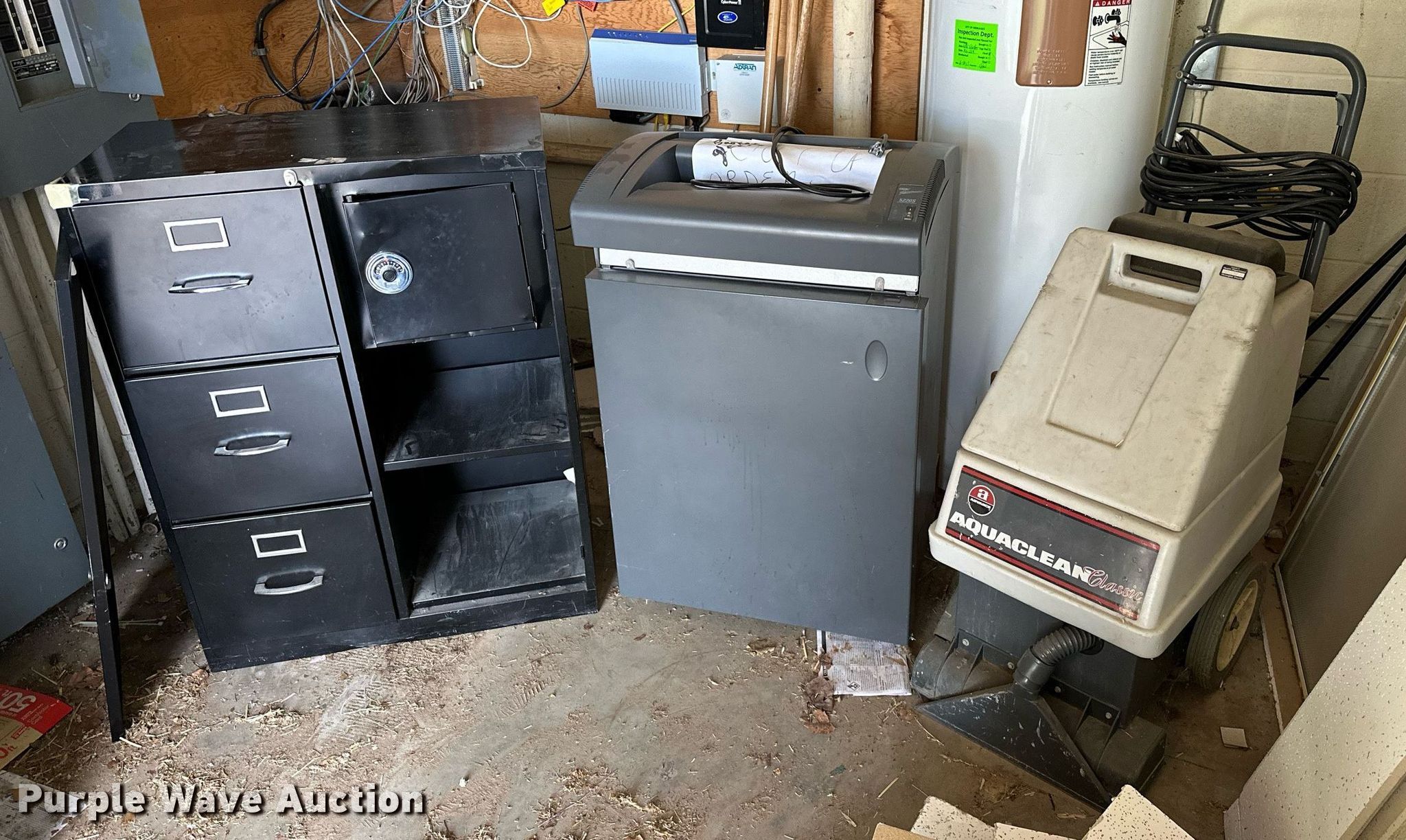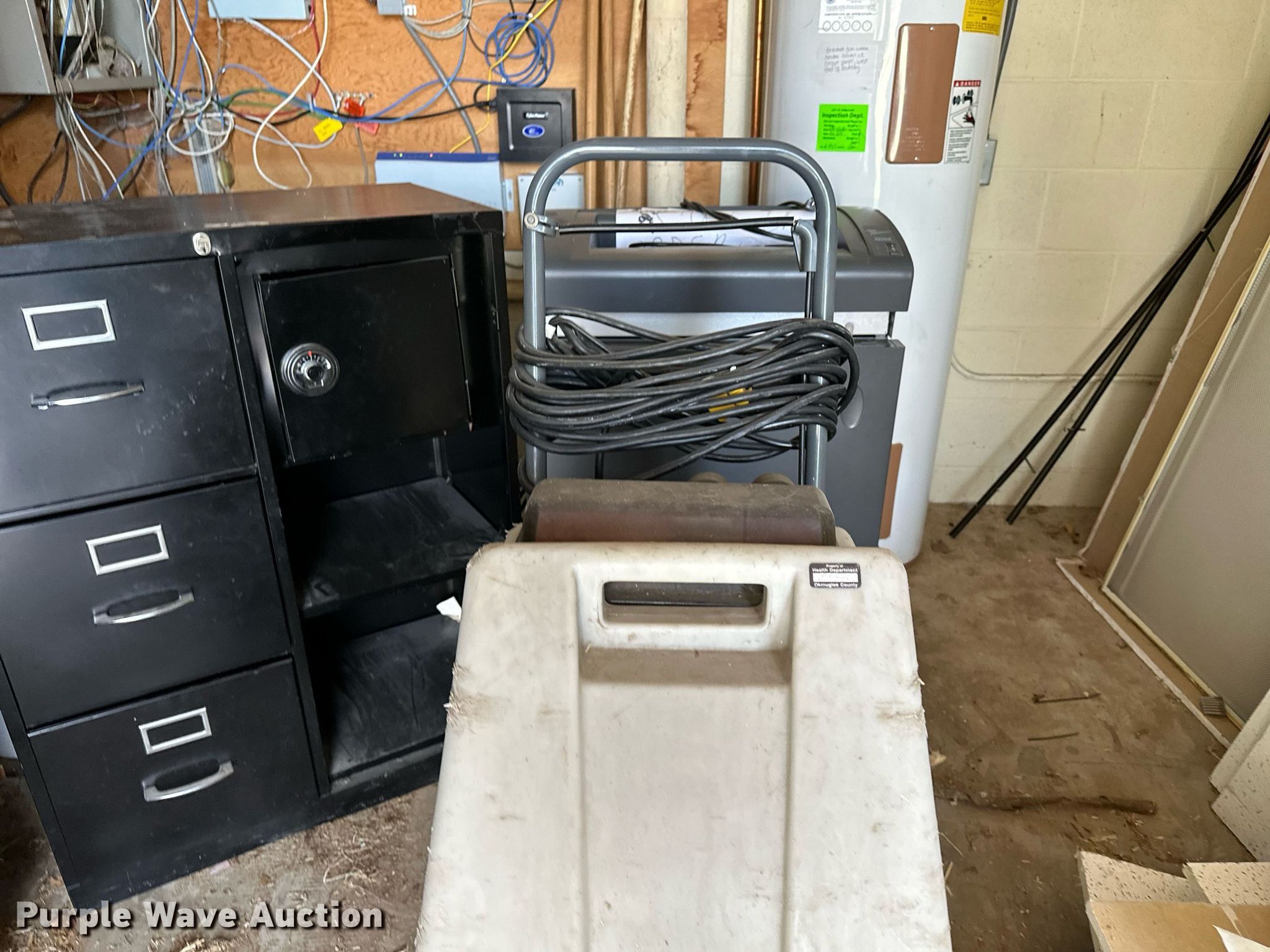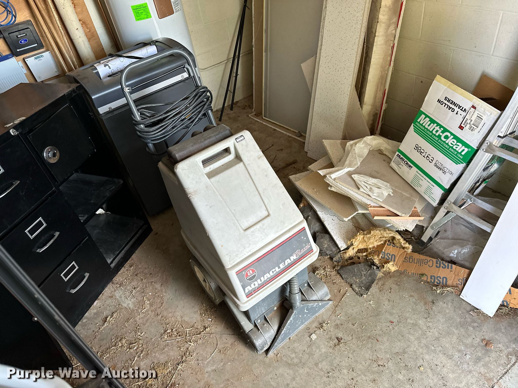 Purple Wave is selling a used Office Supplies and Equip. in Oklahoma. This item is a Office supplies with the following: Table, File cabinet, Broken, Projector screen, (2) paper shredders, One non-operational, Sunbeam microwave, KitchenAid ice maker, Non-operational, Aquaclean Classic carpet cleaner, Unknown operating condition