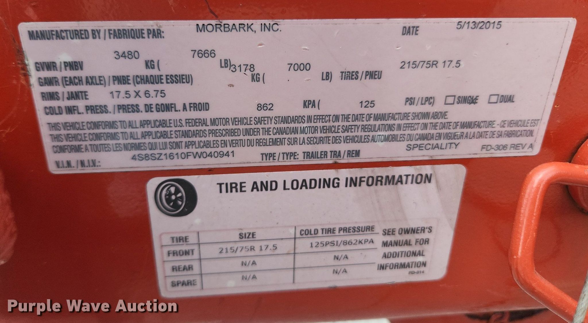 2015 Morbark Beever M15RX wood chipper. Hours: 688 on meter, VIN: 4S8SZ1610FW040941. Engine Cummins, Cylinders: 4, Fuel type: Diesel. Features Capacity: 15", Throat opening: 20" x 20", Auto feed. Trailer 18' L x 86" W, Brakes: Electric, Axles: Single, Tire size: 215/75R17, GVWR: 7,666 lbs, GAWR: 7,000 lbs. This is worksite support equipment and will not come with a title. Transfer of ownership documentation will be a bill of sale. City Of Des Peres, MO. Des Peres, MO 63131