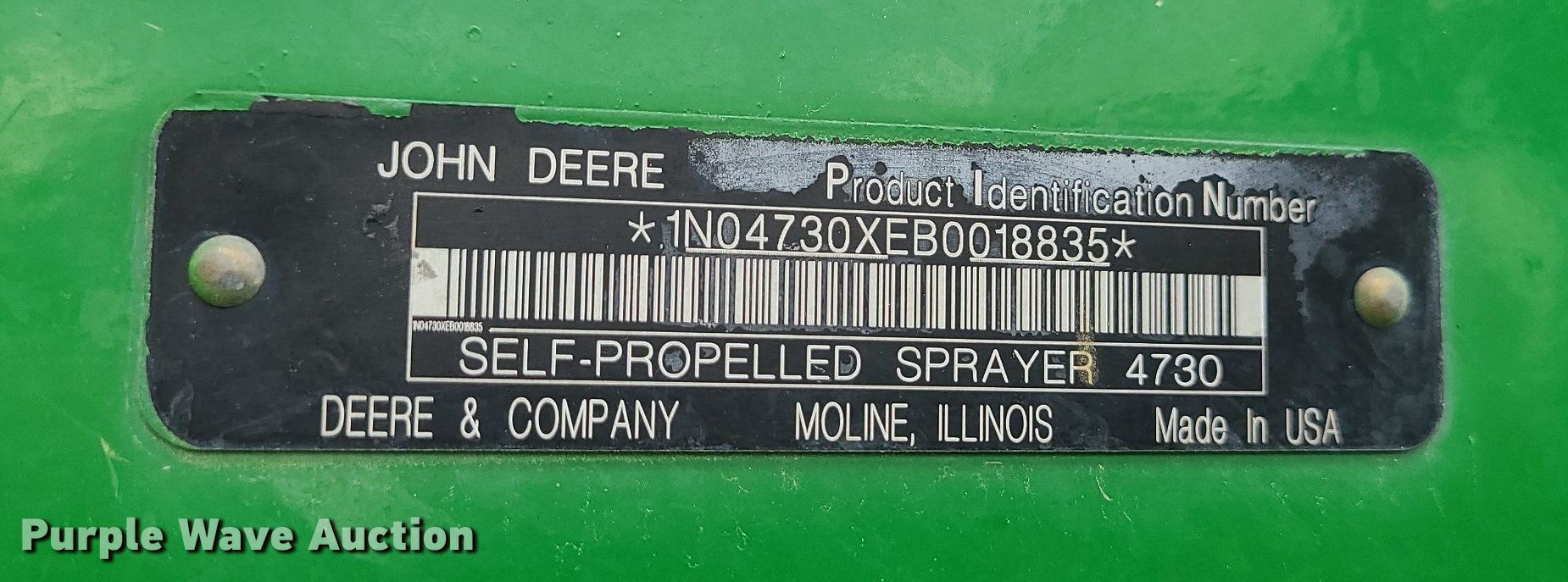 Purple Wave is selling a used Applicator Self Propelled in Missouri. This item is a 2012 John Deere 4730 sprayer with the following: Hours: Unknown, VIN: 1NO4740XEB0018835