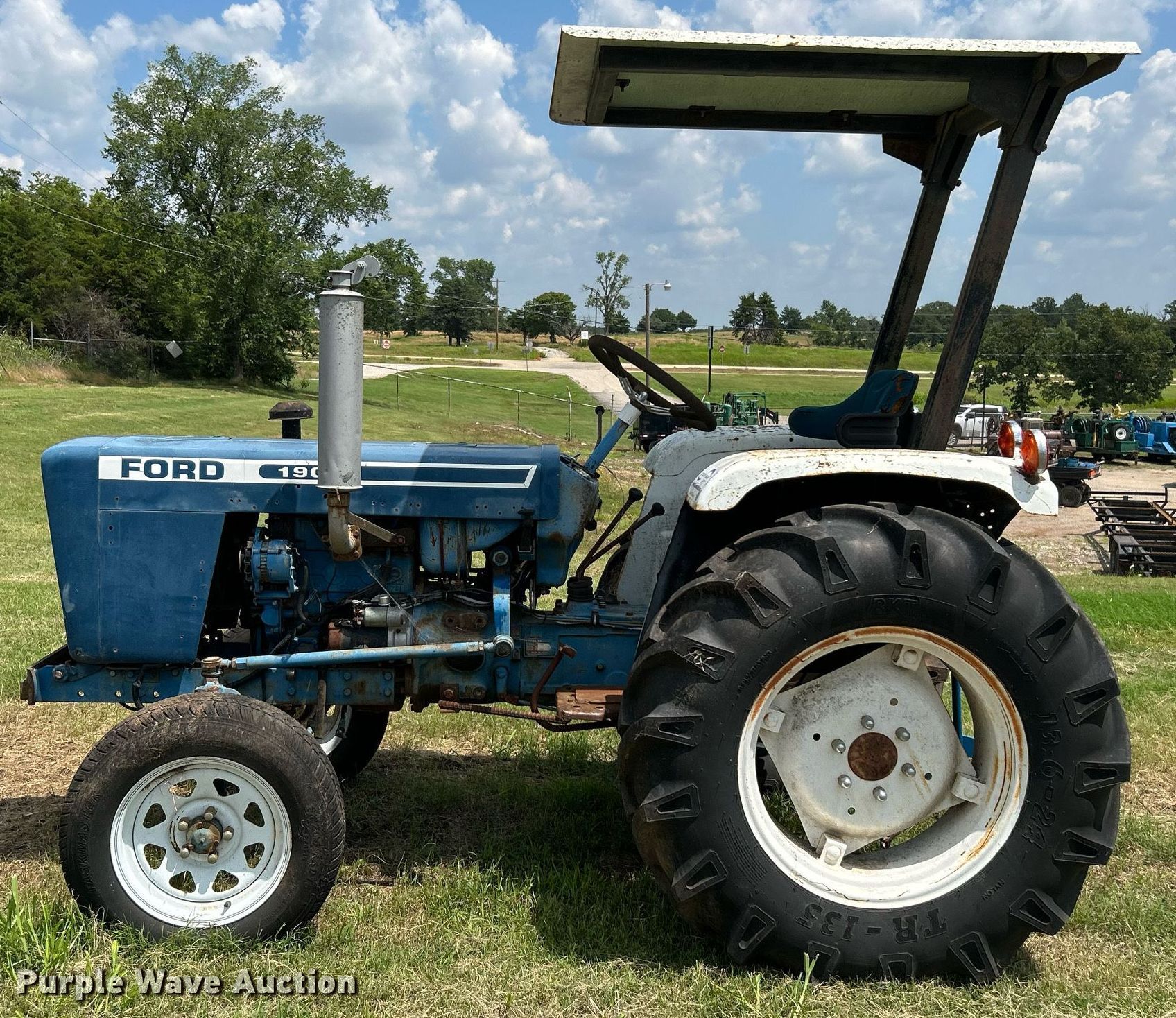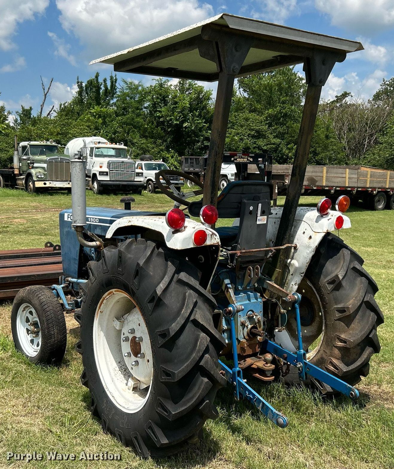 Ford F-1900 tractor. Hours: 2,326 on meter, Serial: U-909539. Engine Cylinders: 3, Fuel type: Diesel. Transmission Manual, 12F - 4R. Features PTO: 540, Three point. Tires Front: ST205/75D15, Rear: 13.6-24. Notes Non-operational unit. 9305 East Main Street. Drumright, OK 74030
