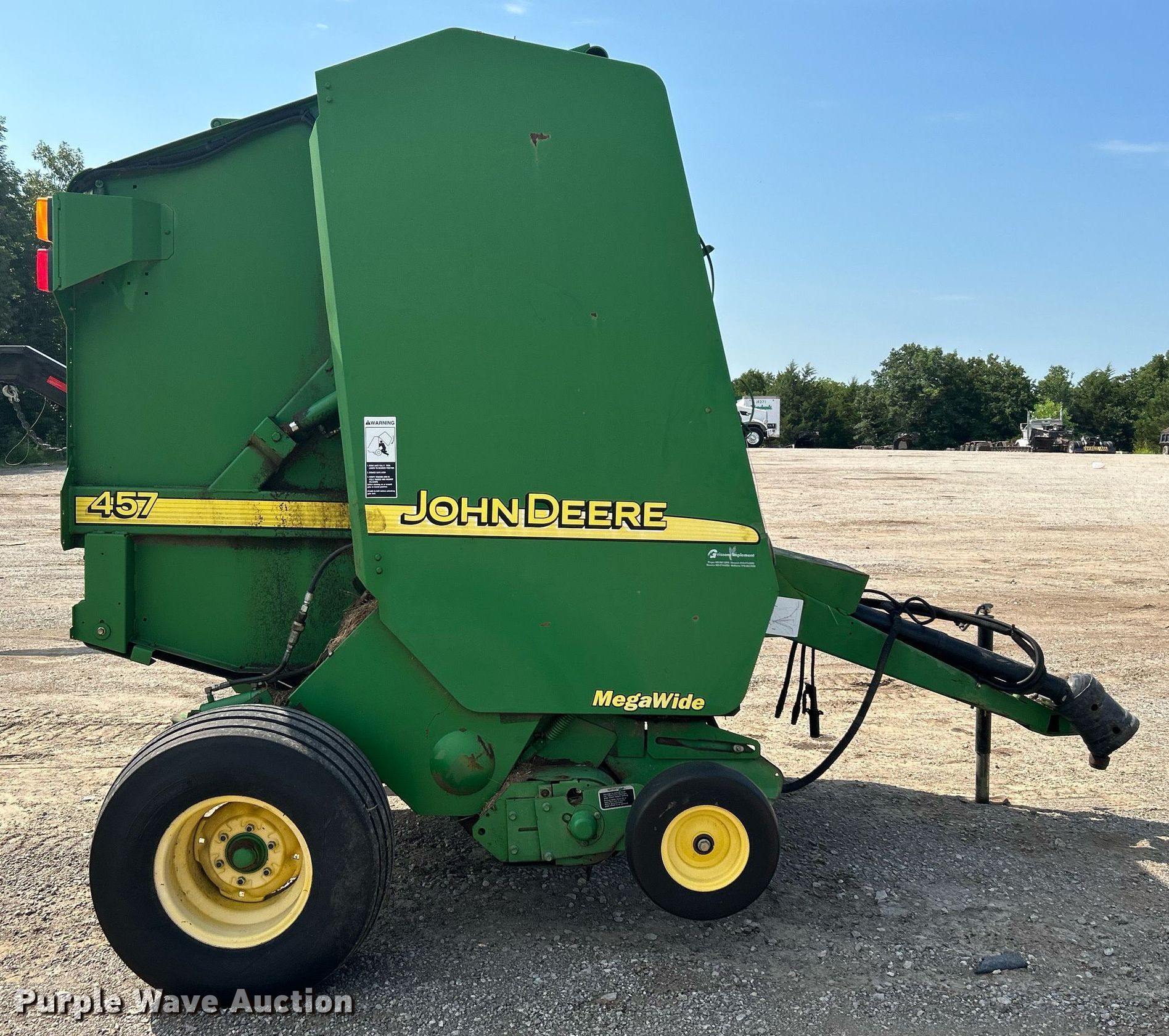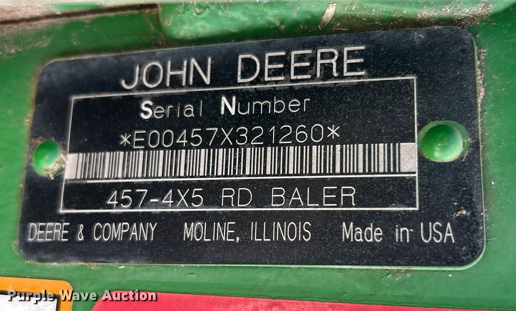 Purple Wave is selling a used Round Baler in Oklahoma. This item is a 2004 John Deere 457 Mega Wide round baler with the following: Bale count: 457, Serial: E00457X321260