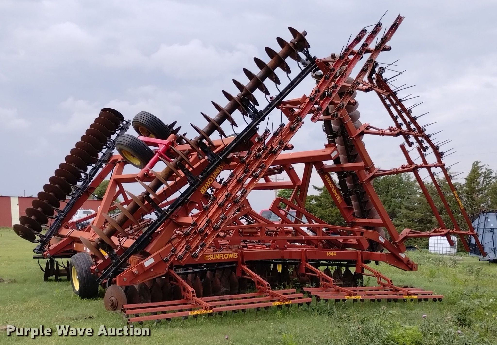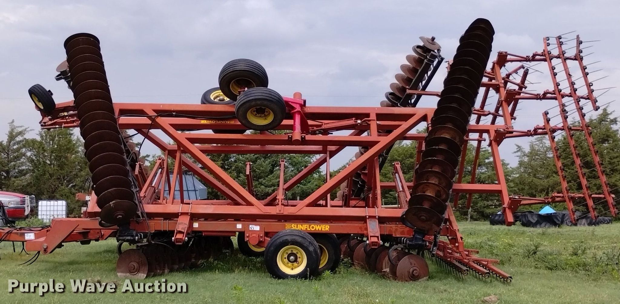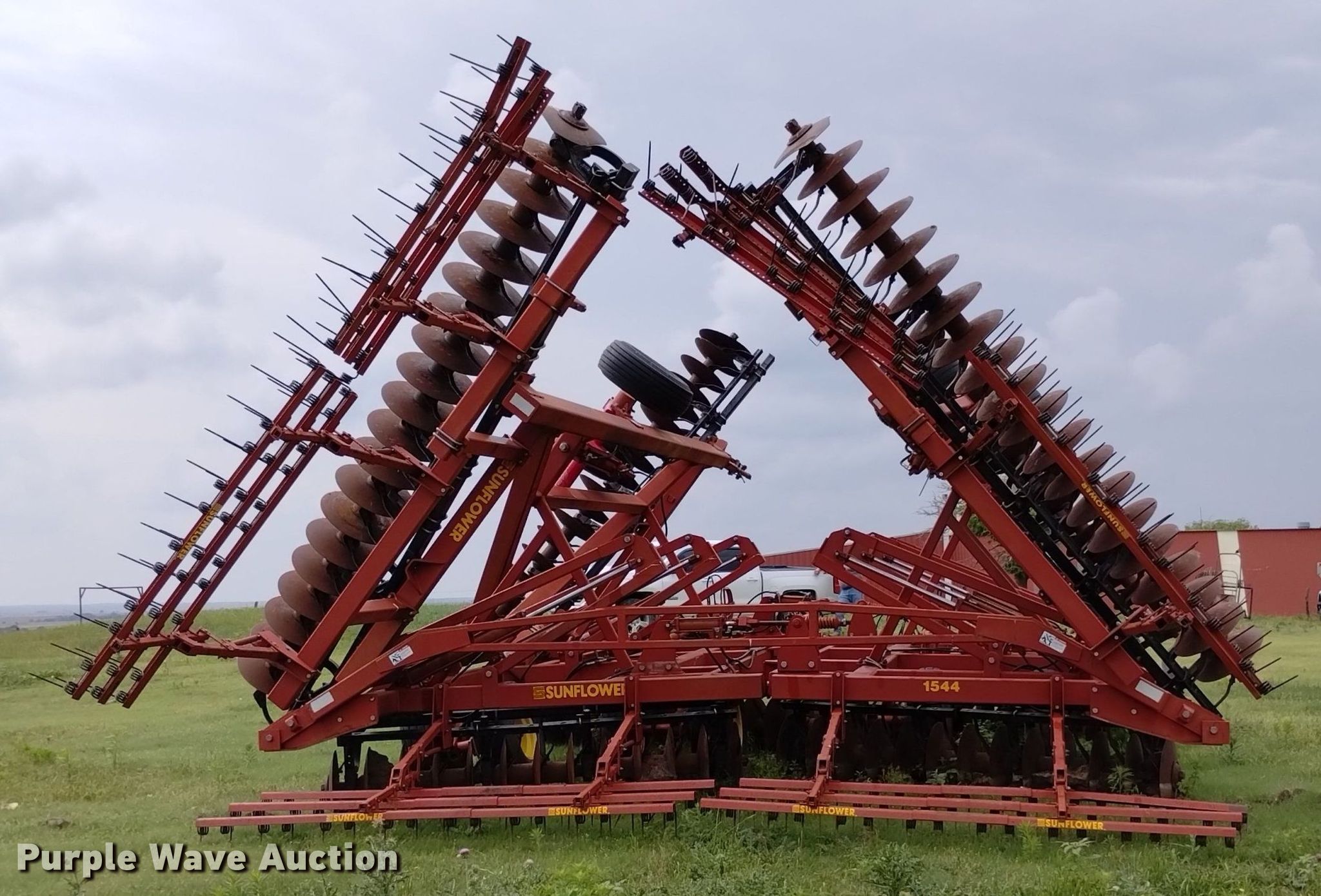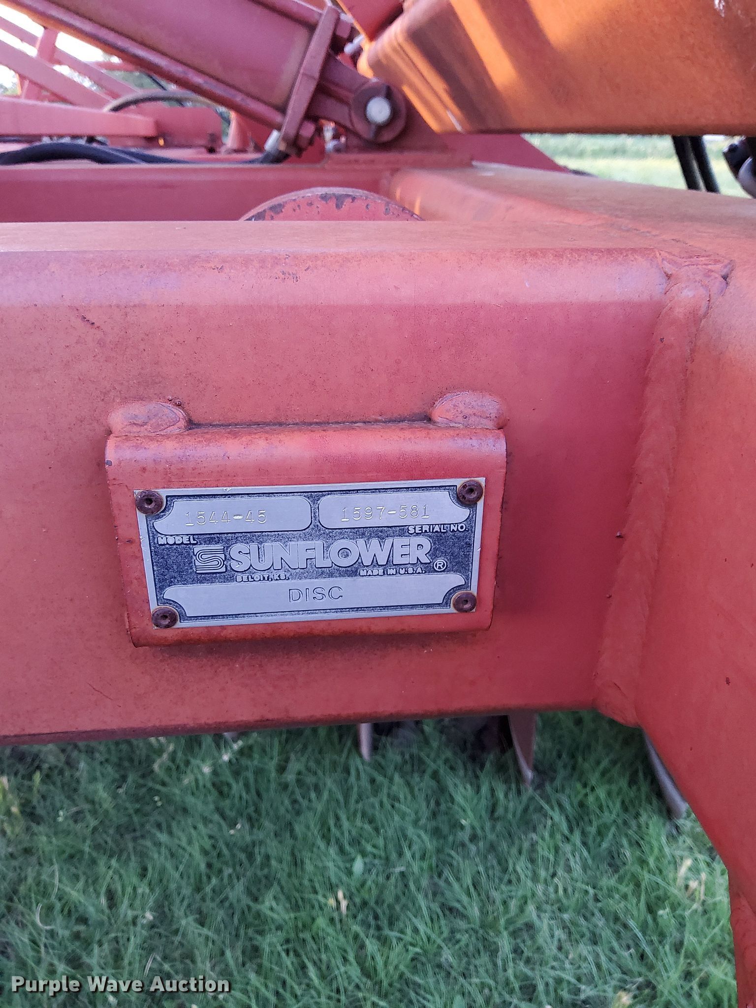 Purple Wave is selling a used Disk in Kansas. This item is a 1997 Sunflower 1544-45 double off-set disk with the following: Overall width: 45', Serial: 1597-581