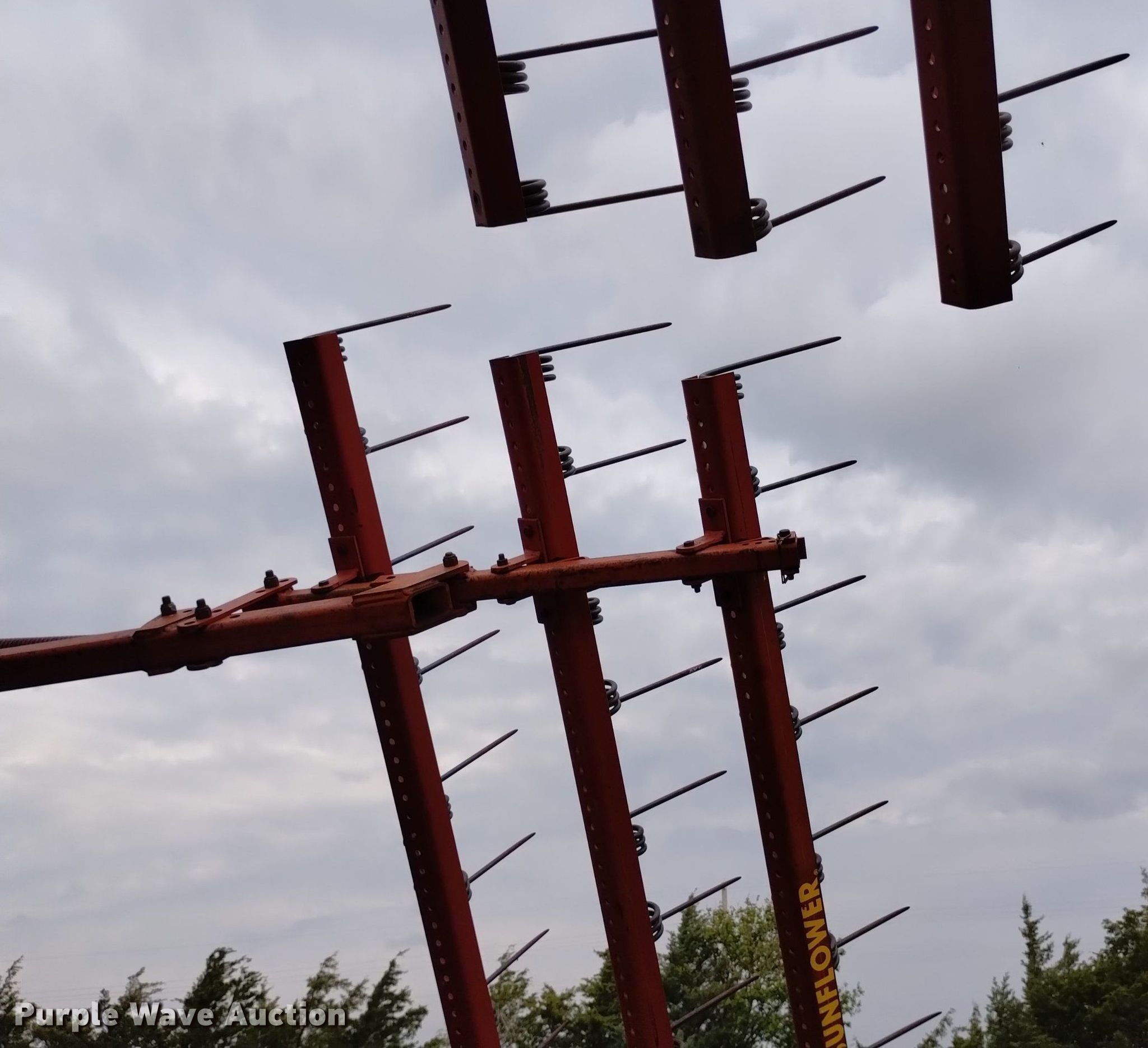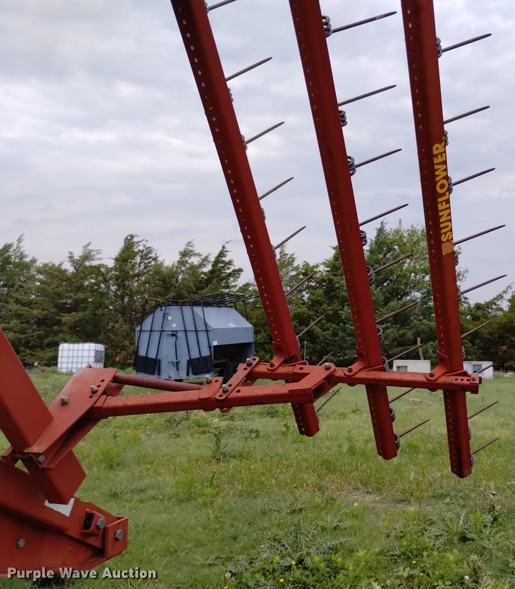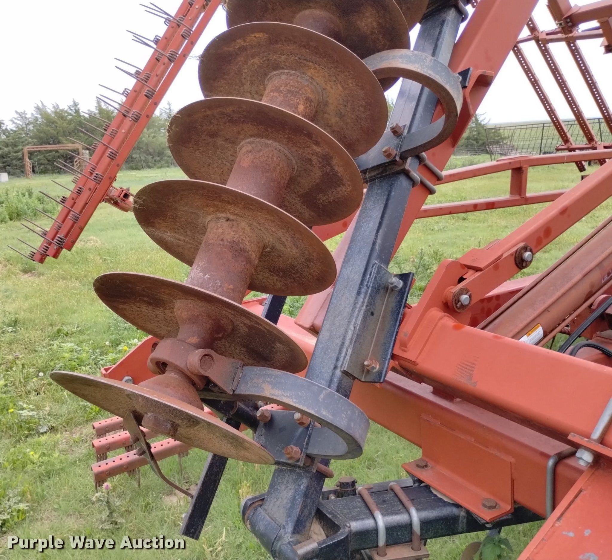 1997 Sunflower 1544-45 double off-set disk. Overall width: 45', Serial: 1597-581. Features Front blades Diameter: 20", Spacing: 8.5", Rear blades Diameter: 20", Spacing: 8.5", Disk scrapers, Operation Hydraulic lift, Hydraulic fold, Leveler: Hydraulic, Walking tandem axle, Attachments Tine harrow Harrow bars: 3.. Tires Tire size: 12.L-15FL, Gauge wheels Size: 205/65-10. Notes One axle needs replaced. Rock'n R Angus. 2206 24 Road. Natoma, KS 67651