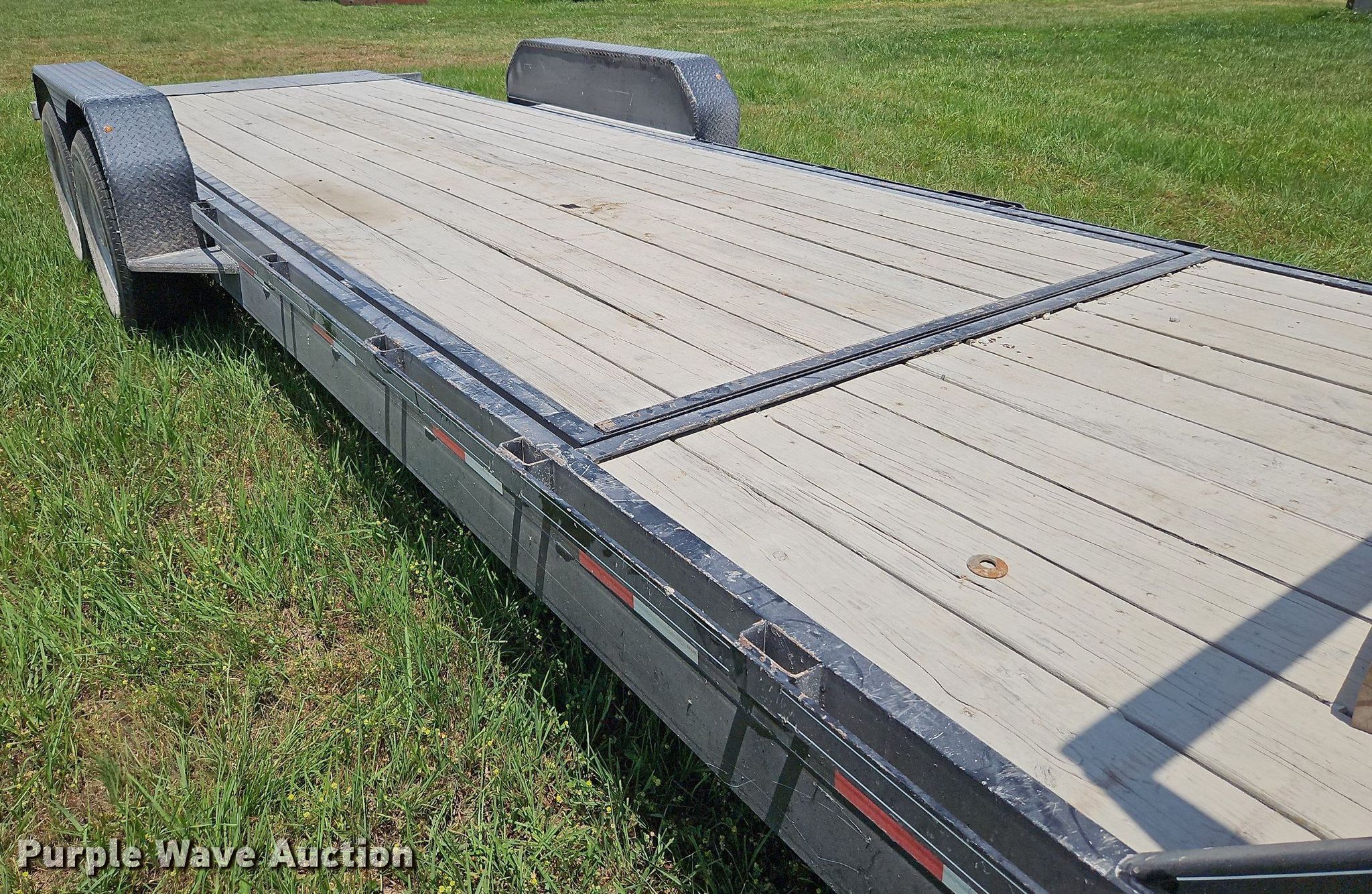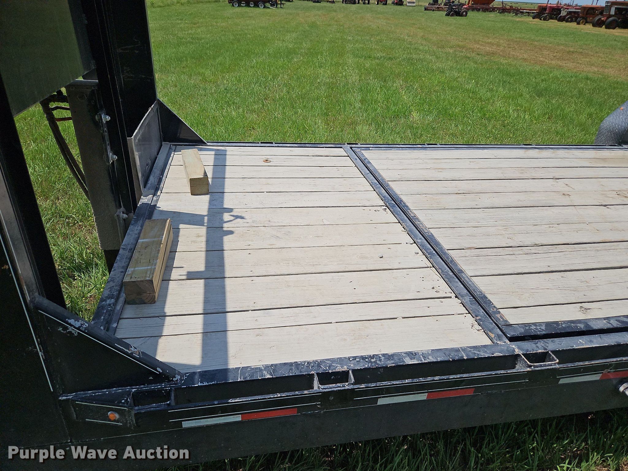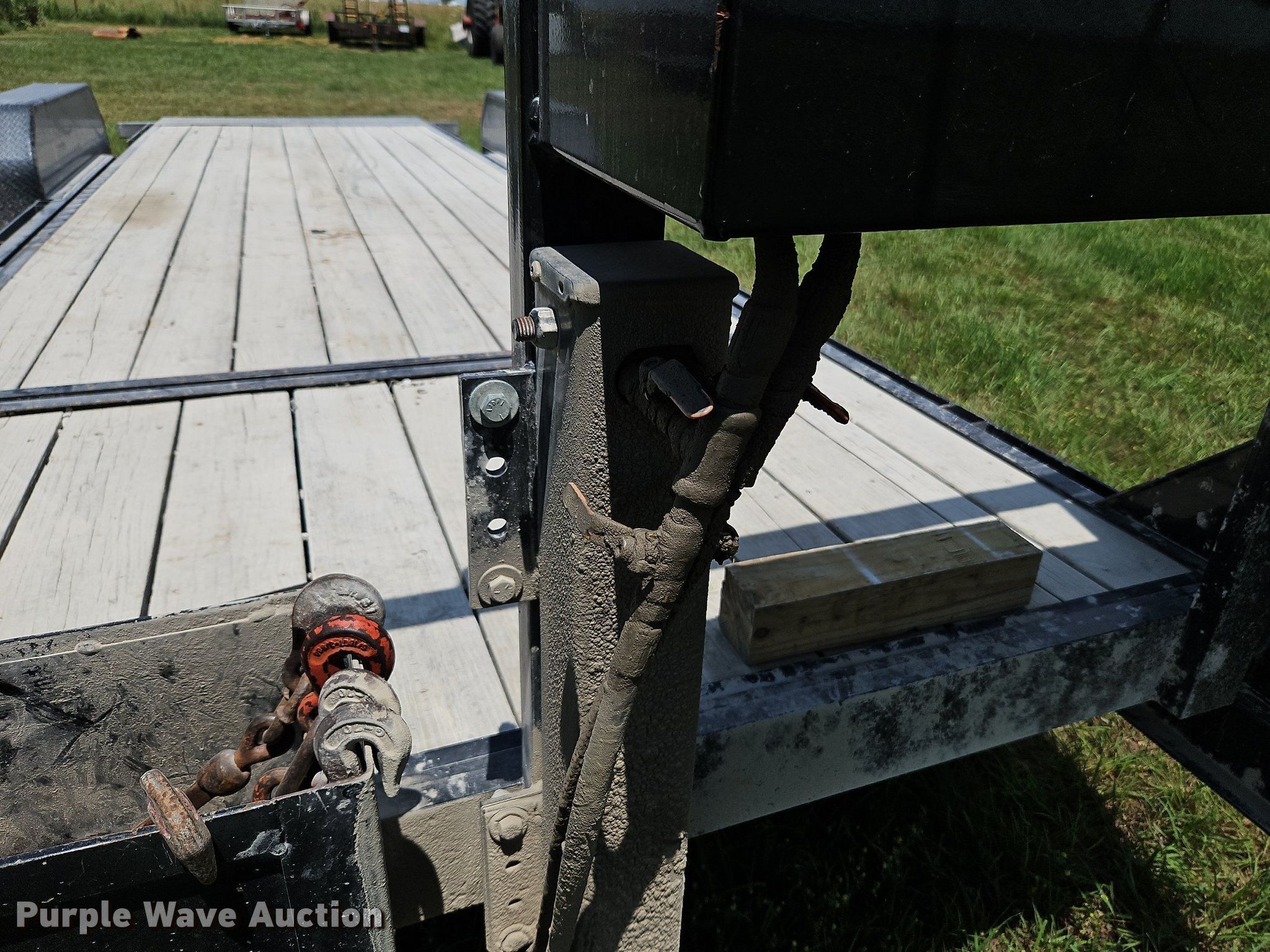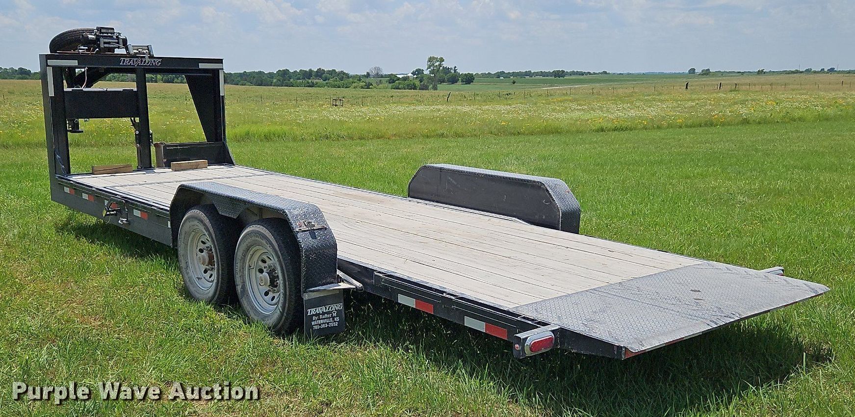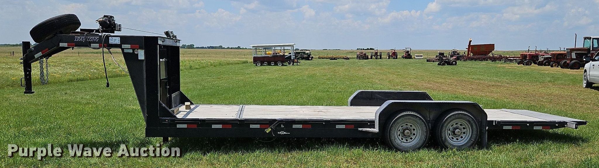 2018 Travalong tilt deck equipment trailer. VIN: 1R9FS2427J1784180. Dimensions Overall: 32' 4" L x 8' 6" W, Deck: 24' L x 7' W, Deck height: 22", Hydratail length: 20' 3". Features Deck type: Wood, Self-contained hydraulics, Hydraulic controls: Remote control. Chassis Hitch: Gooseneck, Landing gear: Single, Hydraulic, Suspension: Spring, Brakes: Electric, Axles: Tandem, GVWR: 14,000 lbs, GAWR: 7,000 lbs. Tires Steel wheels, Size: 235/80R16. Notes Winch not included. Kansas title. Title distribution may be delayed up to 14 days from verification of funds. Richmond, KS 66080