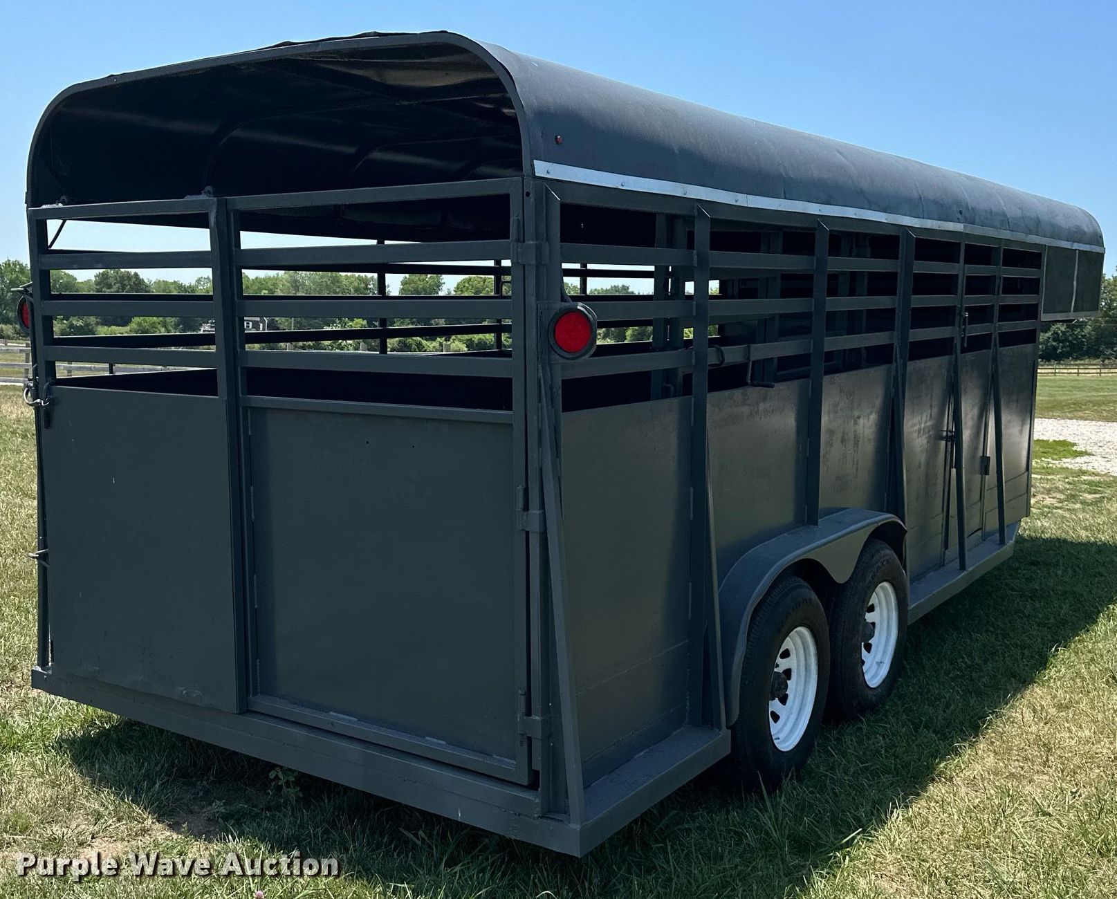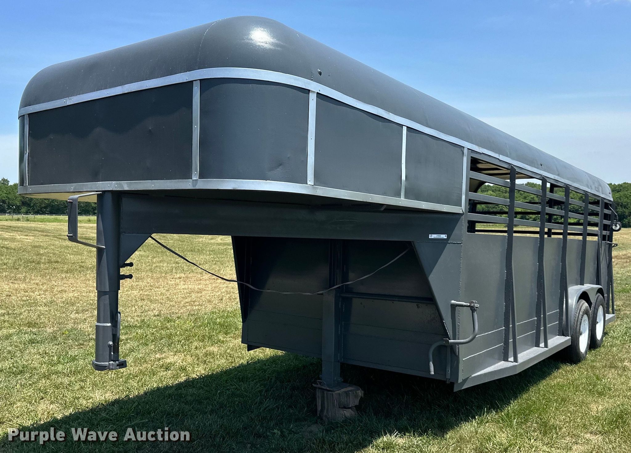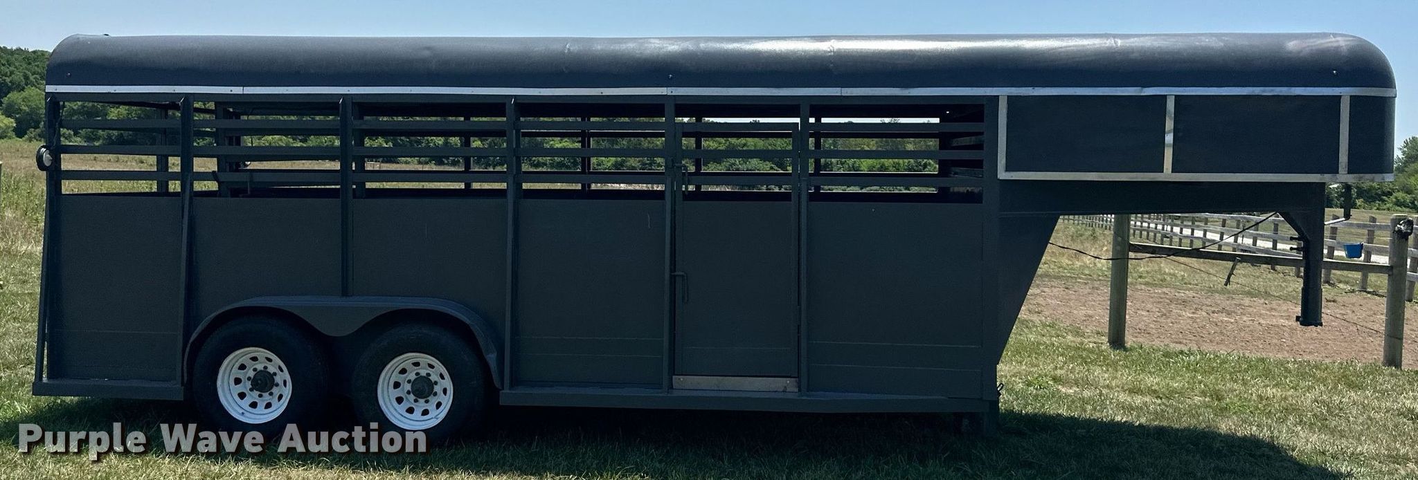 1987 Ponderousa livestock trailer. VIN: P872141. Dimensions Overall: 24' L x 102" W, Body: 18' L x 6' 6" W, Side height: 6' 6". Features Center gates: 1. Chassis Hitch: Gooseneck, Ball hitch: 2 5/16", Landing gear: Single, Suspension: Spring, Brakes: Electric, Axles: Tandem. Tires Steel wheels, Size: 235/80R16. Kansas title. Title distribution may be delayed up to 14 days from verification of funds. 1886 North 1150 Road. Lawrence, KS 66046