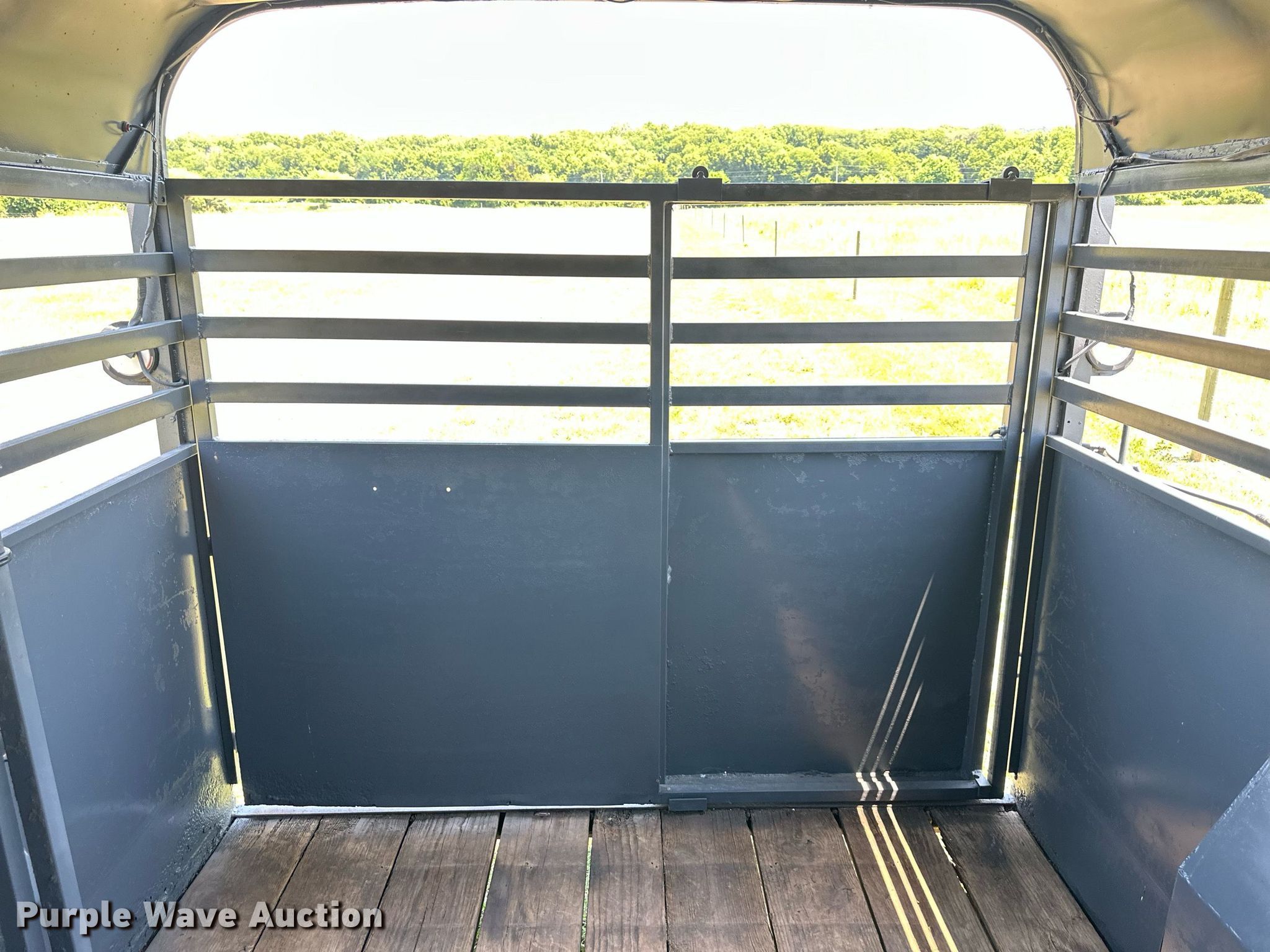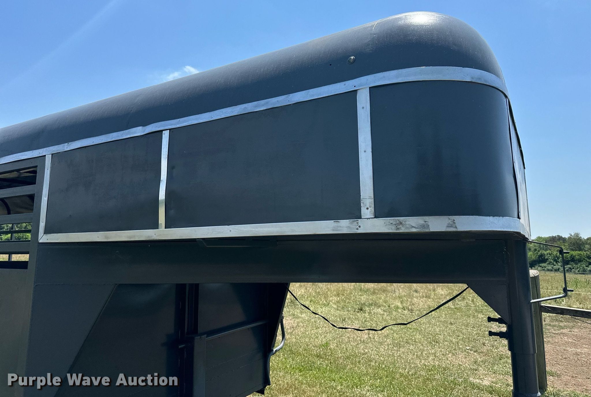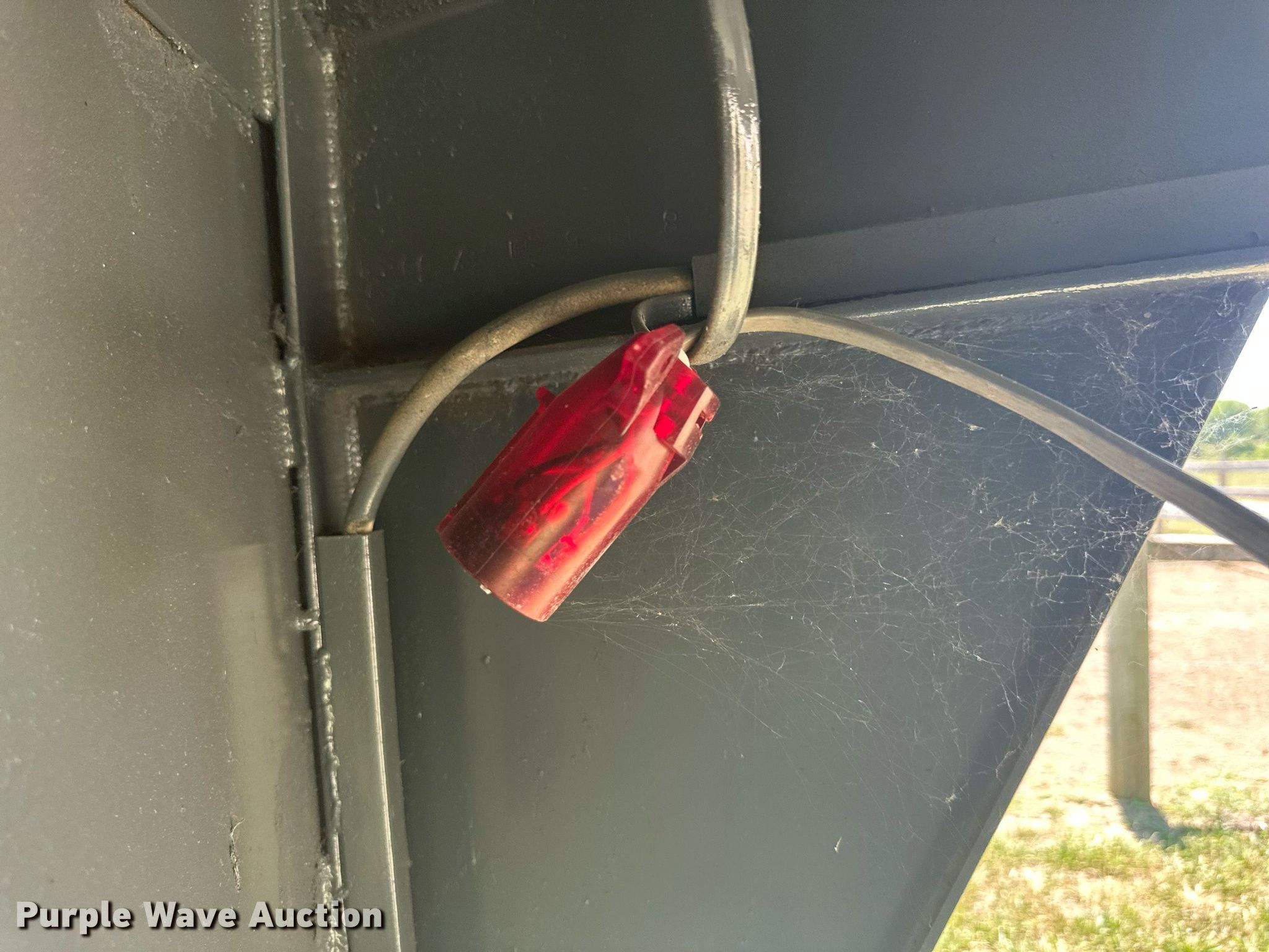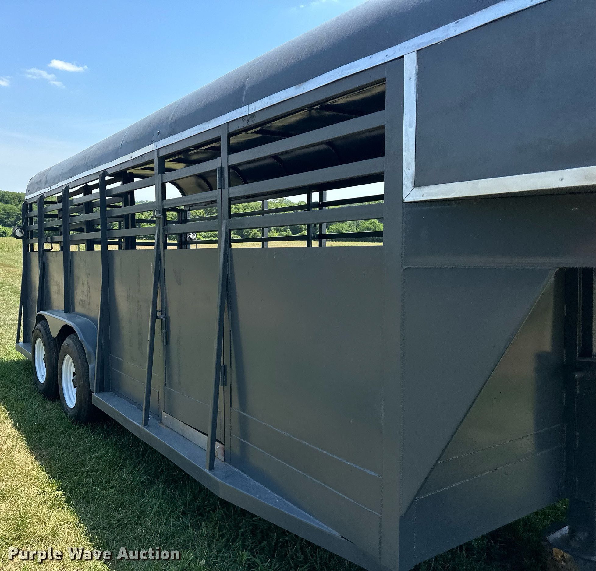 1987 Ponderousa livestock trailer. VIN: P872141. Dimensions Overall: 24' L x 102" W, Body: 18' L x 6' 6" W, Side height: 6' 6". Features Center gates: 1. Chassis Hitch: Gooseneck, Ball hitch: 2 5/16", Landing gear: Single, Suspension: Spring, Brakes: Electric, Axles: Tandem. Tires Steel wheels, Size: 235/80R16. Kansas title. Title distribution may be delayed up to 14 days from verification of funds. 1886 North 1150 Road. Lawrence, KS 66046