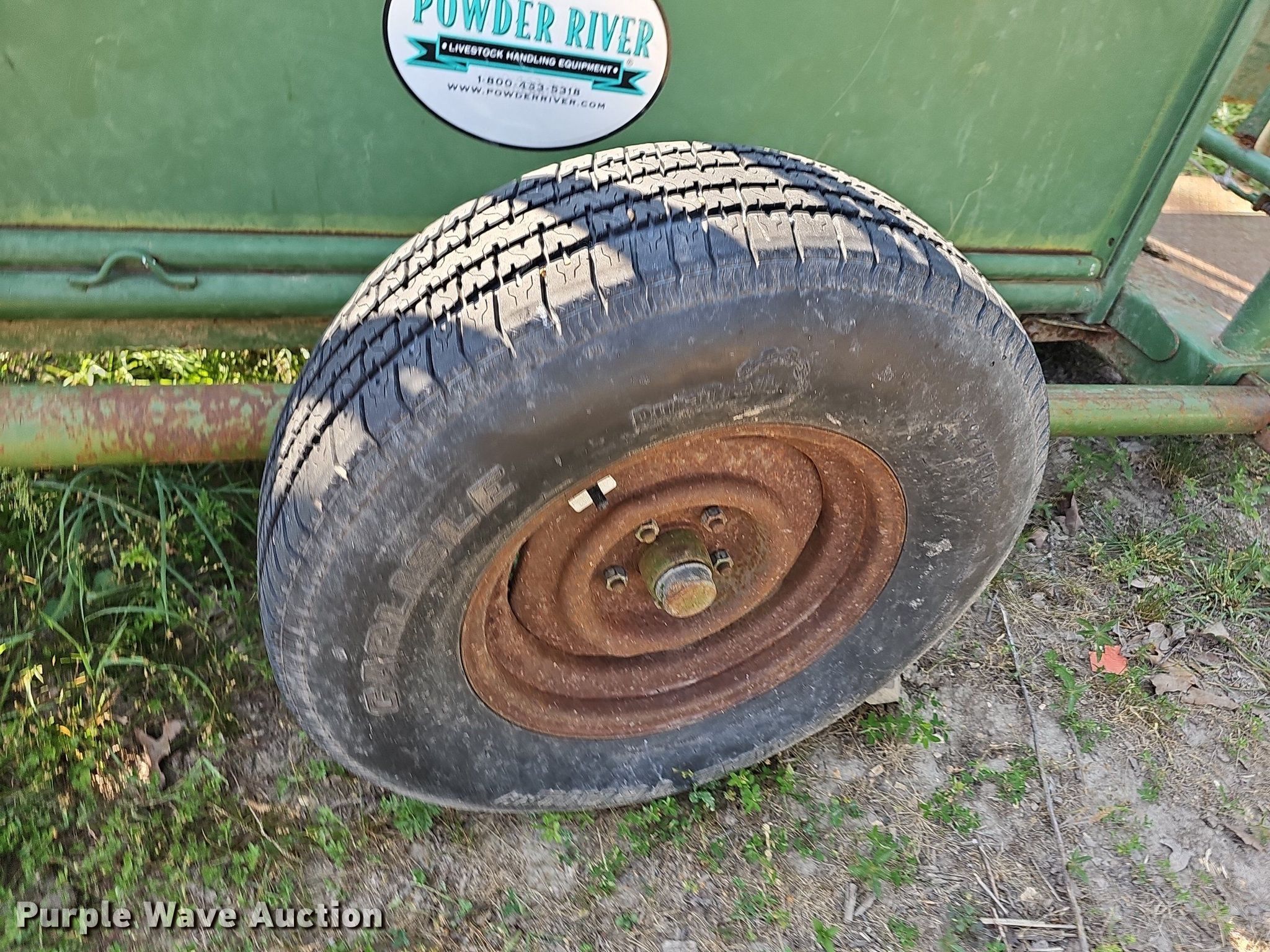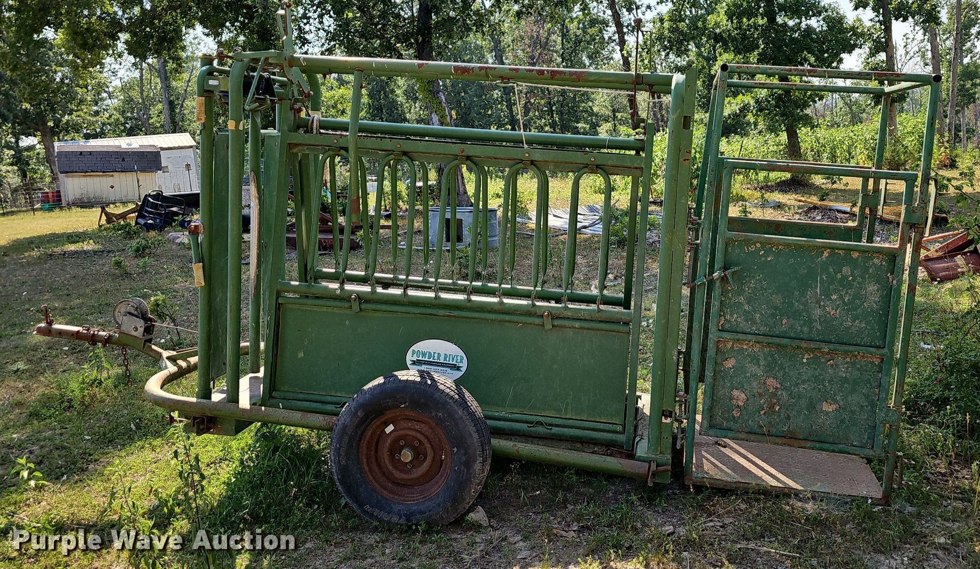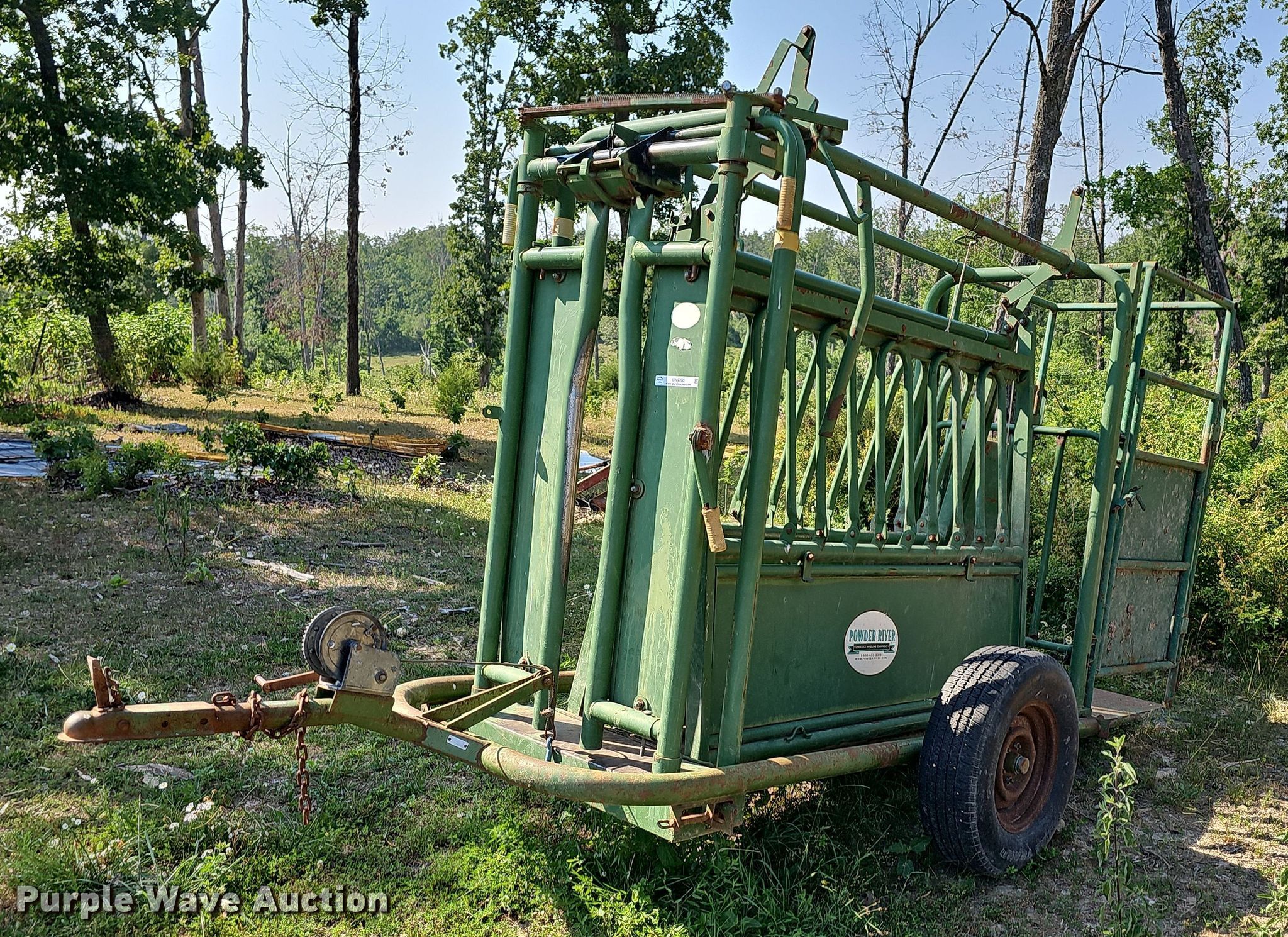 Powder River livestock squeeze chute. Serial: 573499. Features Manual operation, Ball hitch size: 2". Tires Size: 225/75R15. O'Bannon Banking Company. 70 State Highway JJ. Long Lane, MO 65590
