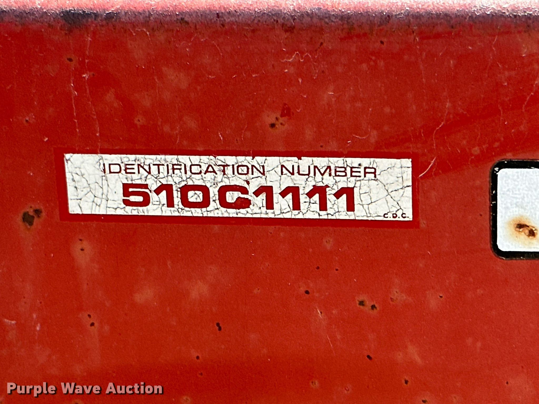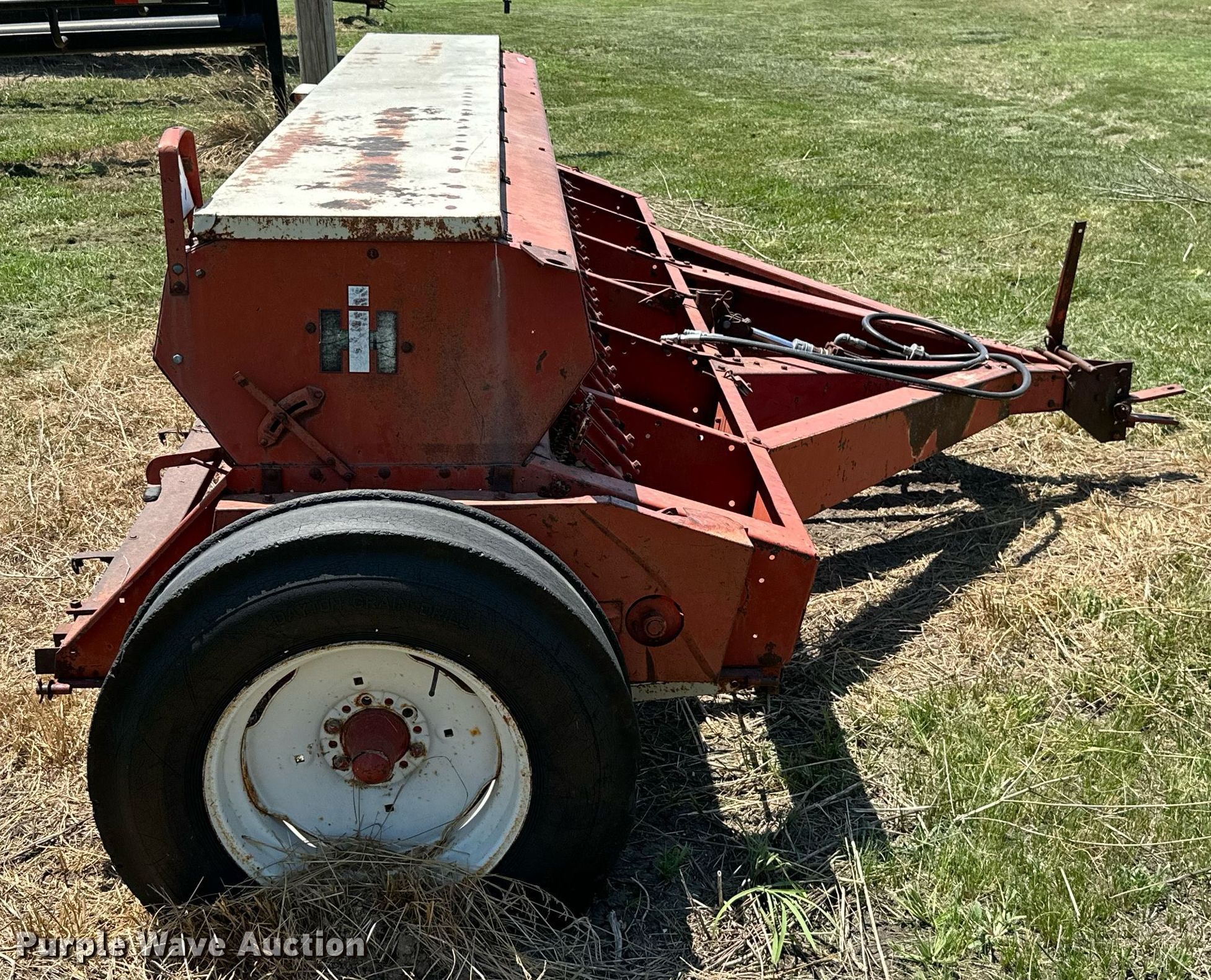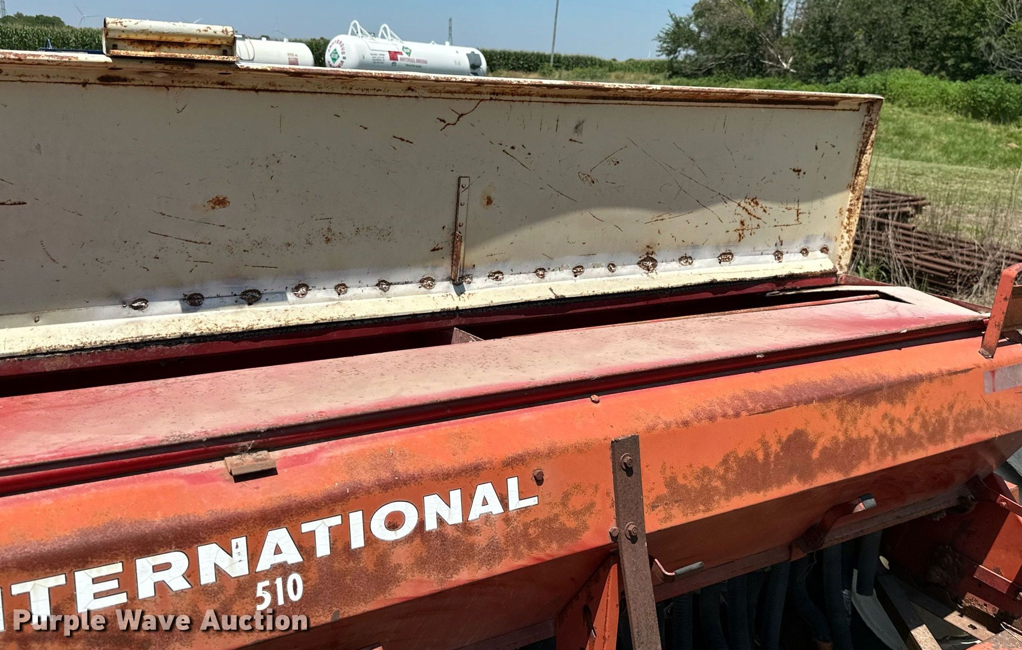 International 510 grain drill. Width: 12', Row units: 21, Row spacing: 7", Serial: 510G1111. Features Seed delivery Bulk fill system, Row units Meter drive: Ground, Down pressure: Spring, Disk openers: Single. Tires Transport tire size: 7.50-20. Hughes Grain and Cattle Inc.. 8405 30th Road. Galesburg, KS 66740