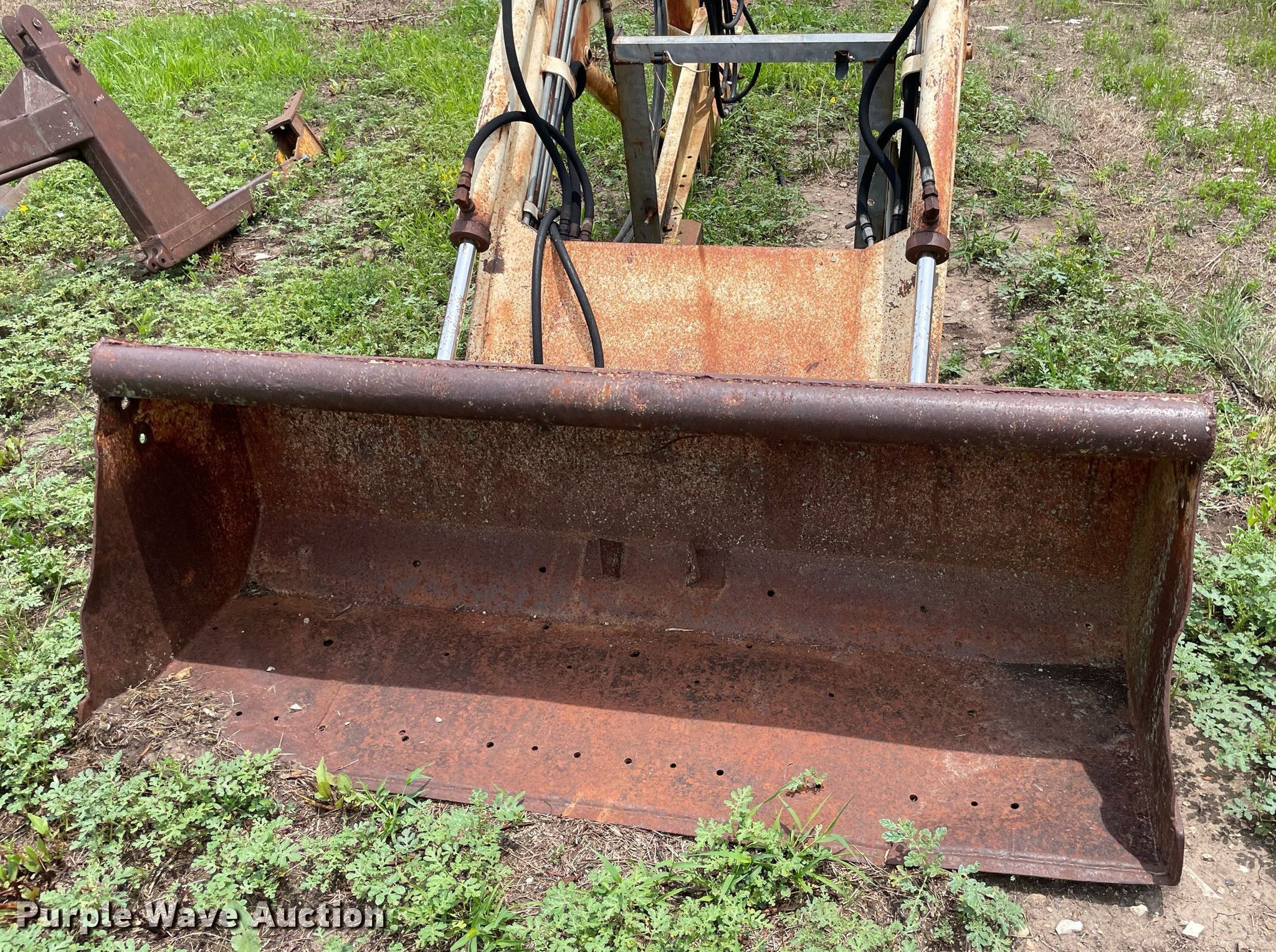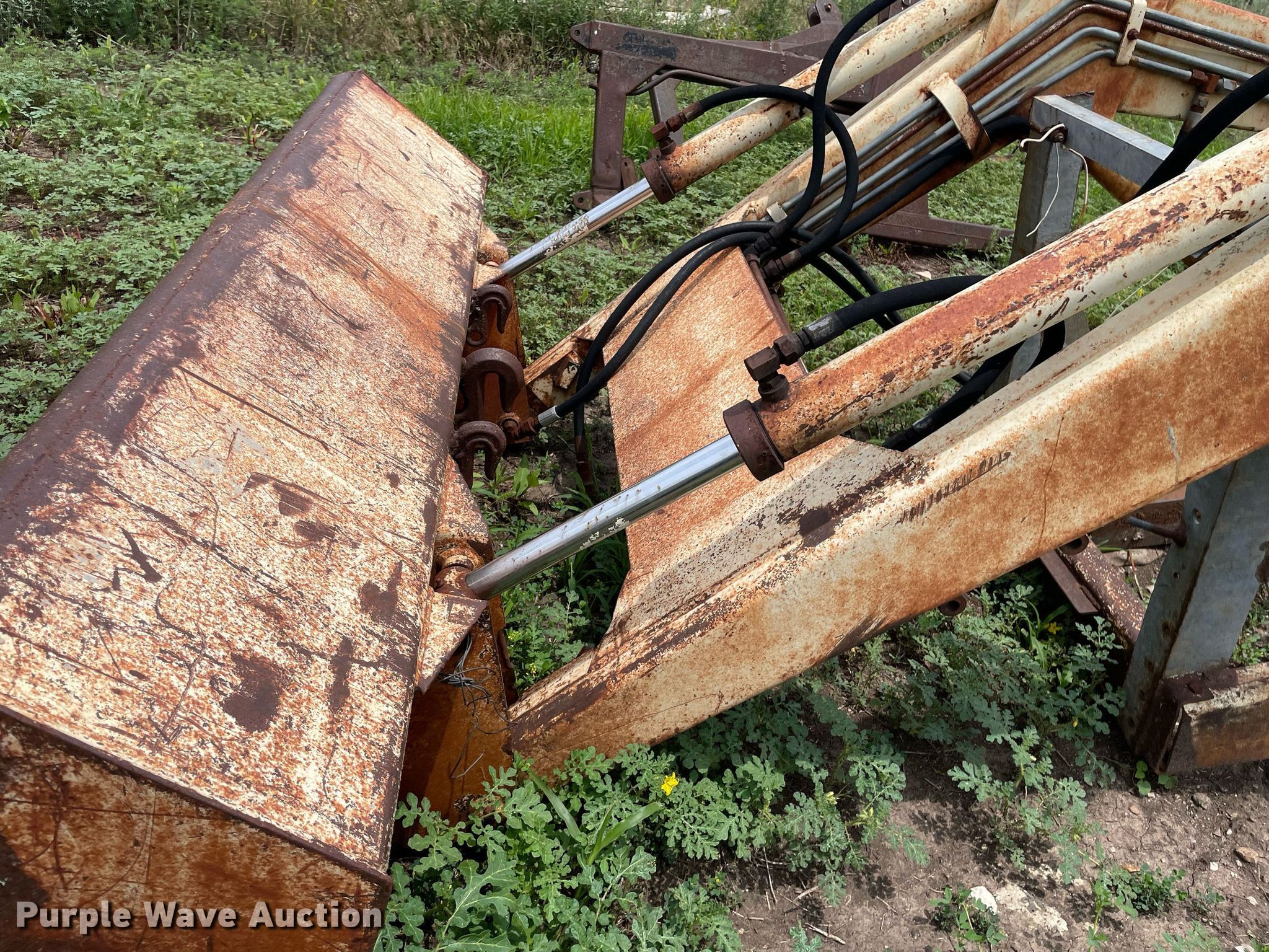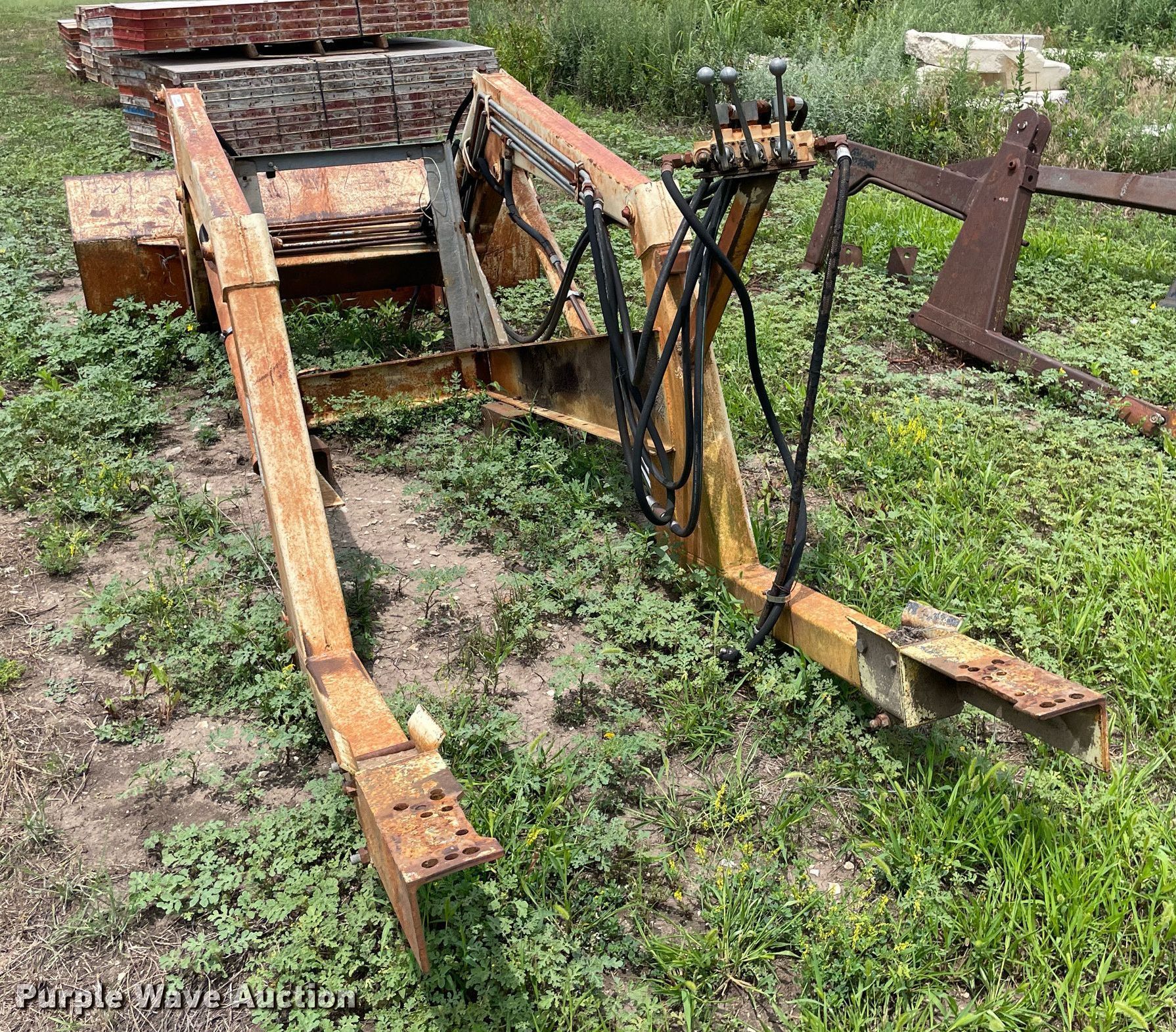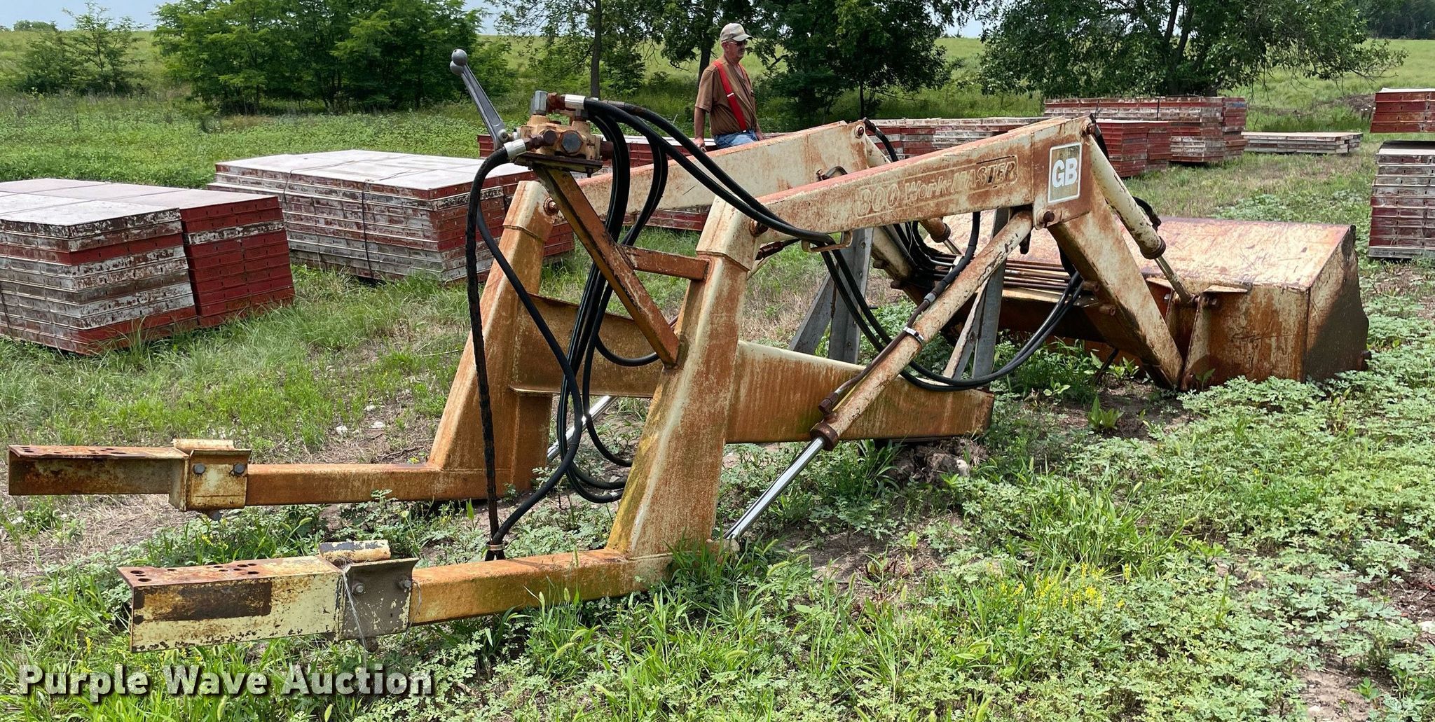 Purple Wave is selling a used Ag Tractor Loader or Attach. in Kansas. This item is a GB Workmaster 800 loader with the following: Controls: Two lever, Bucket, Width: 72"