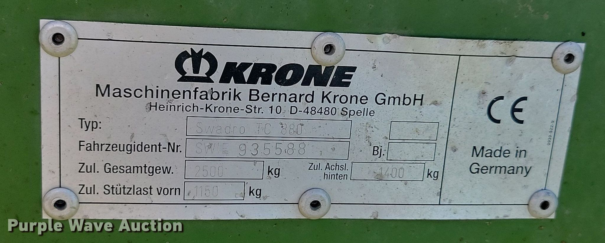 Purple Wave is selling a used Hay Rake in South Dakota. This item is a Krone Swadro TC880 hay rake with the following: Serial: 935588